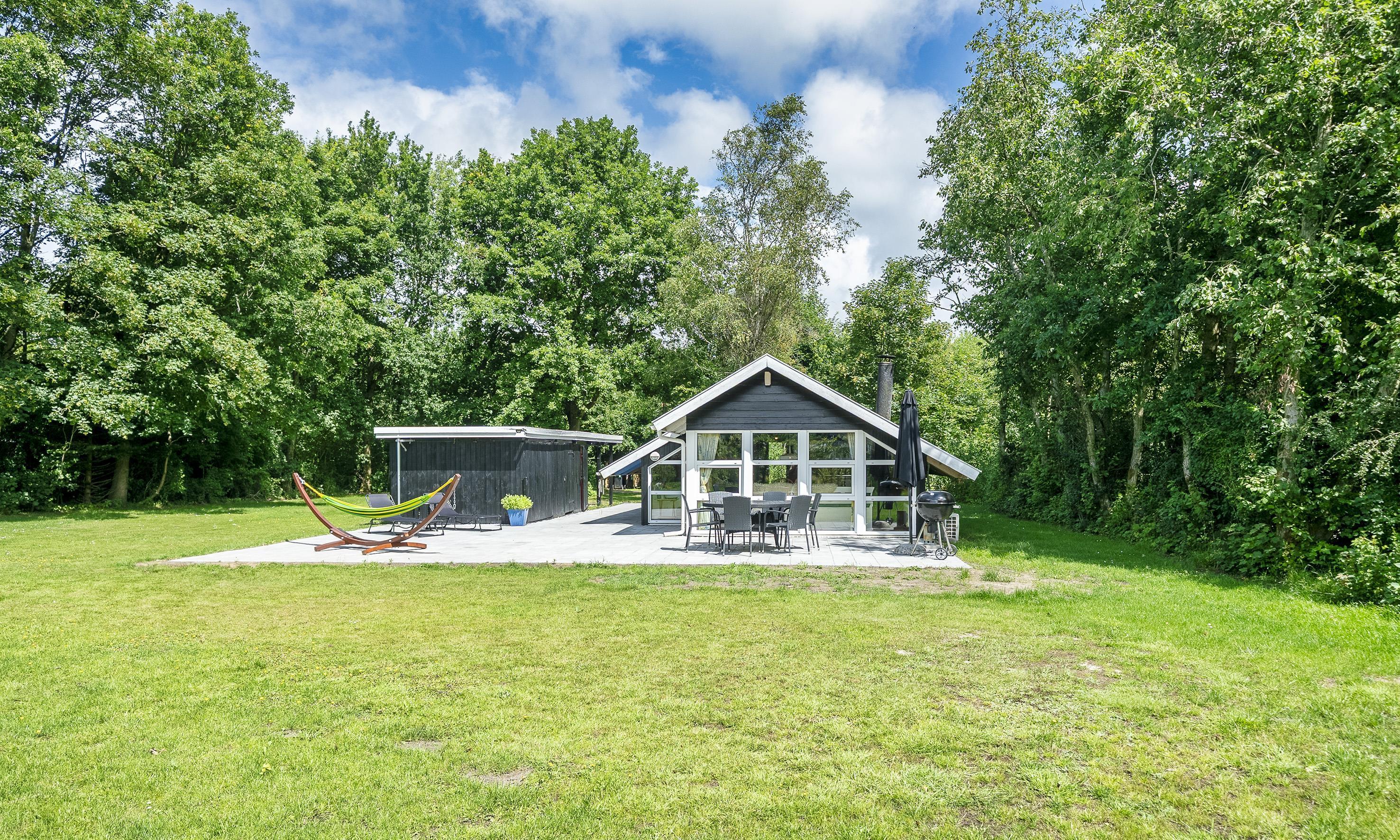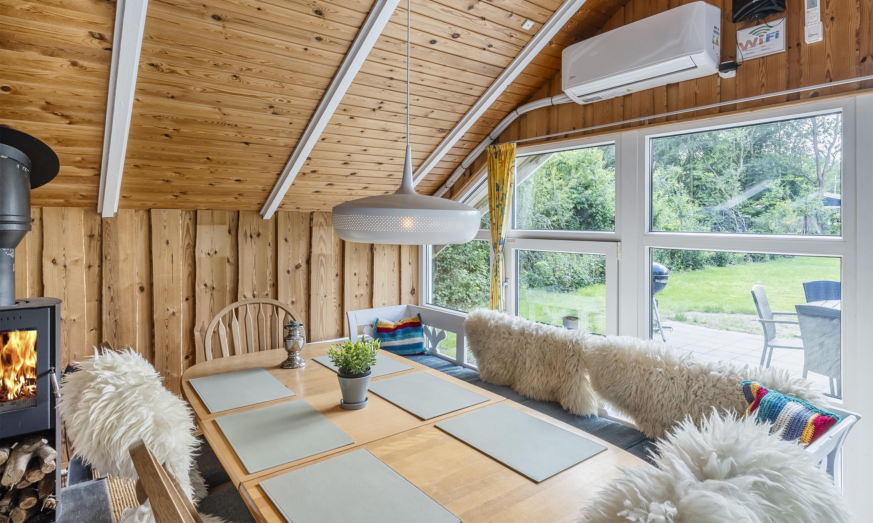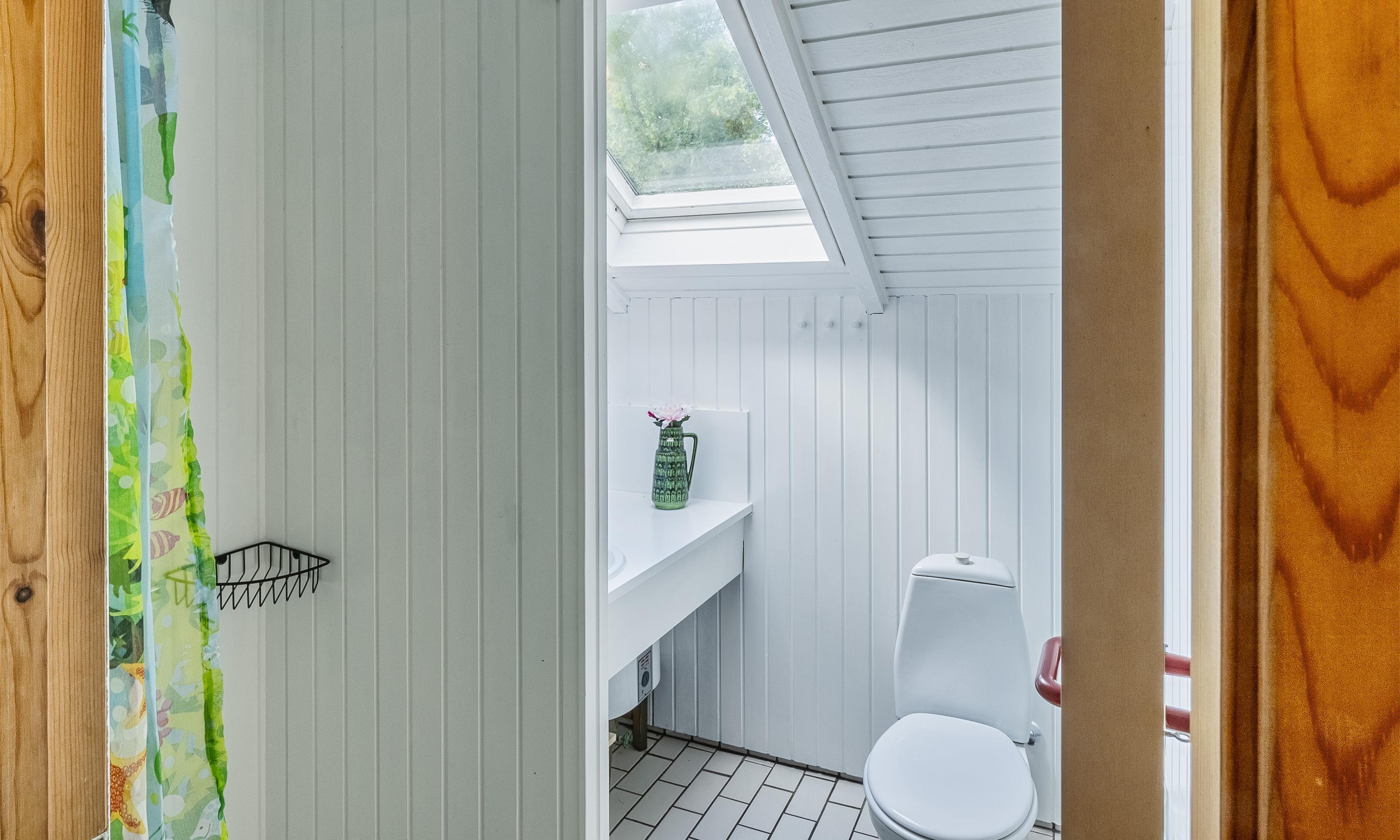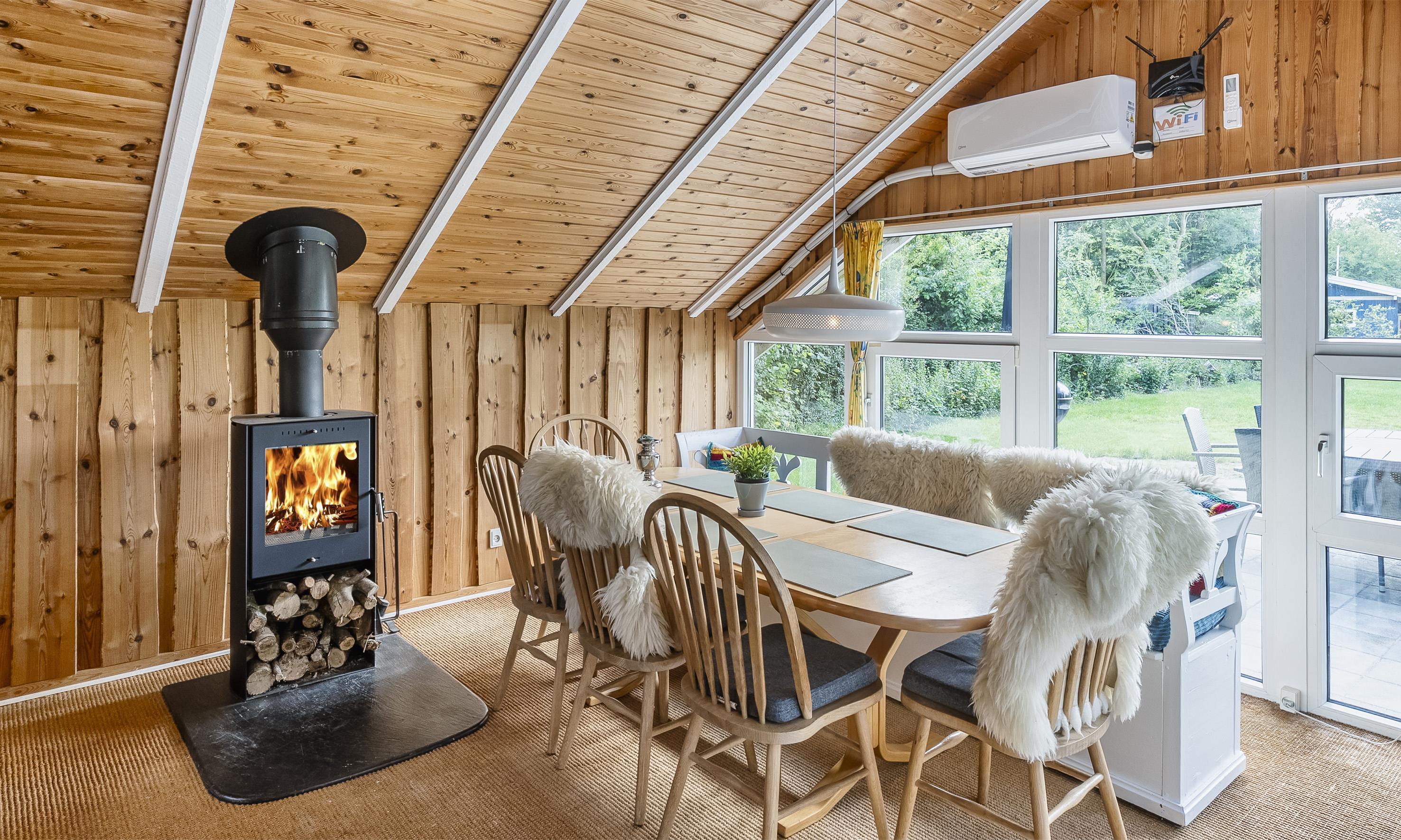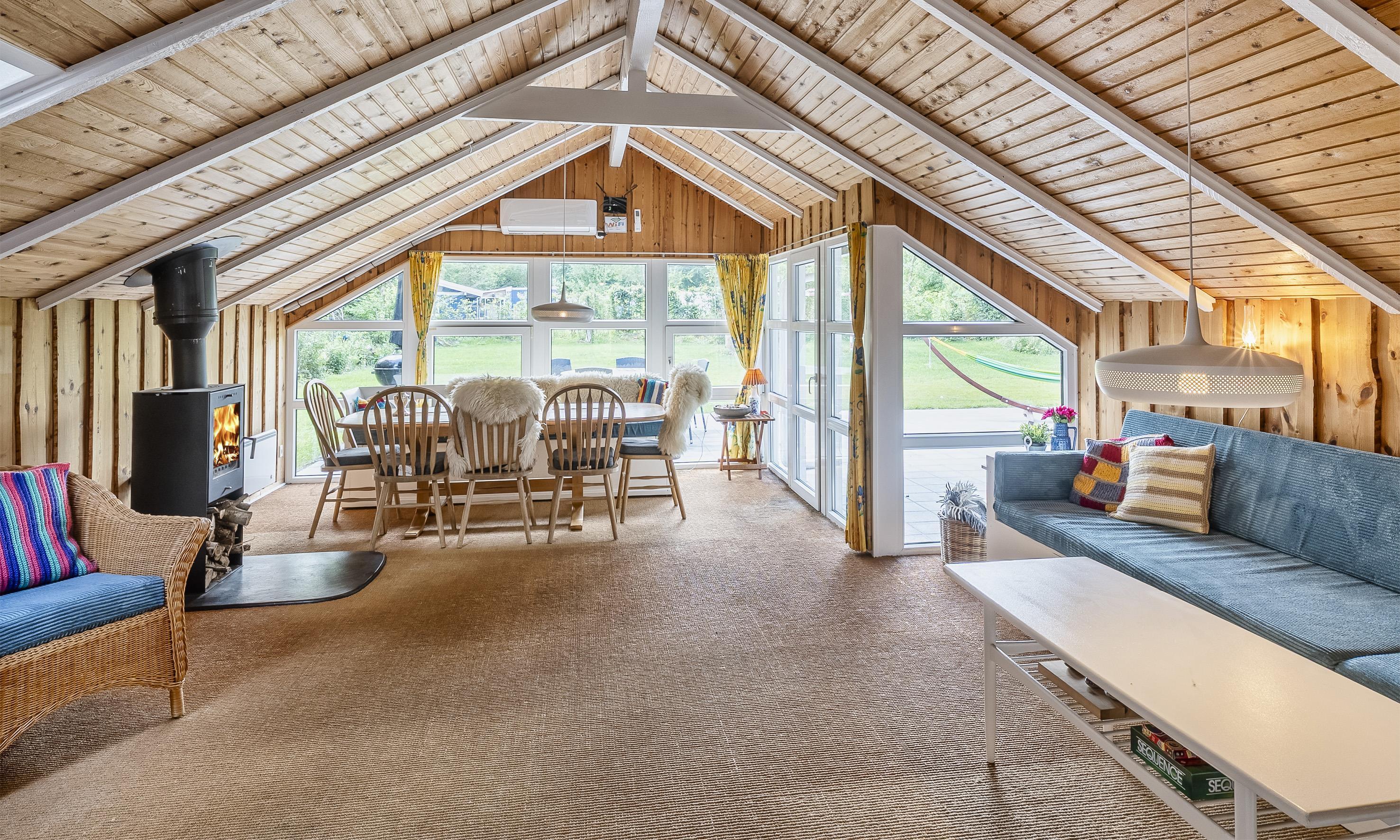 Sommerhuset er indrettet med et åbent køkken i forbindelse med spisepladsen og en stue med loft til kip samt udgang til den store terrasse. Badeværelset har toilet, håndvask og bruser. Der er to soveværelser med plads til i alt fire personer; ét med dobbeltseng og ét med to enkeltsenge (DS + 2 ES). I stuen finder du en brændeovn og energivenlig varmepumpe, som sikrer en hyggelig og behagelig varme. Den store have indbyder til mange aktiviteter for hele familien.
