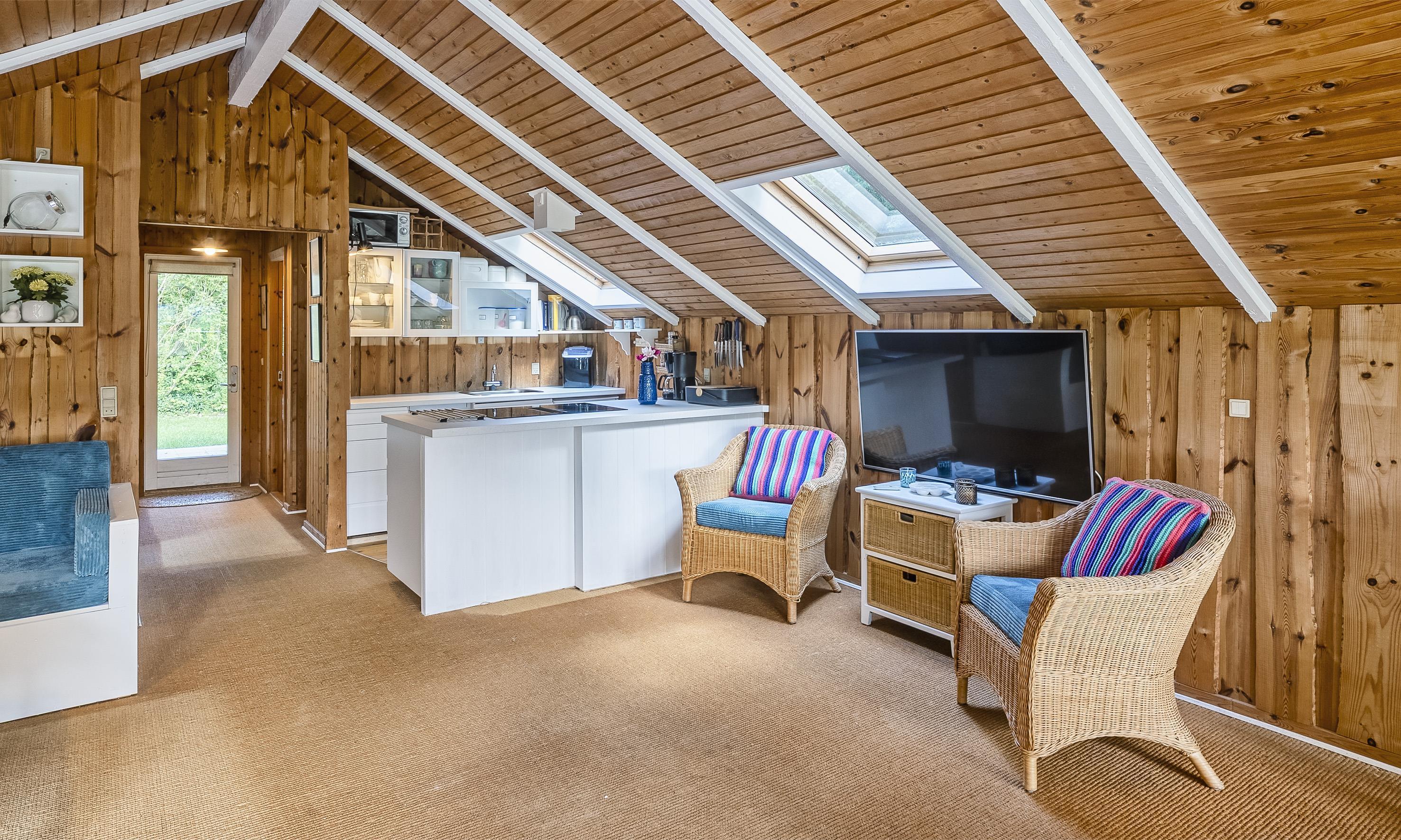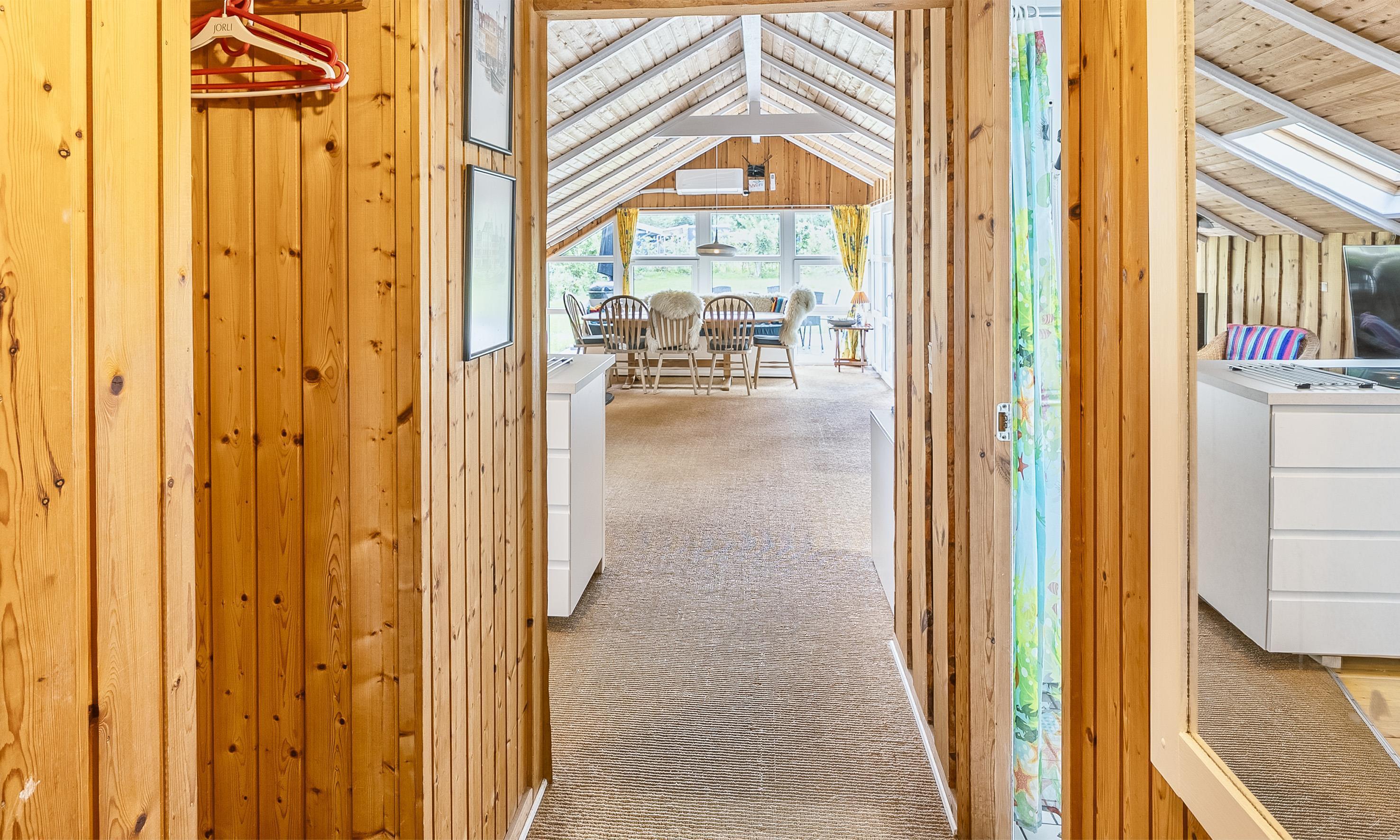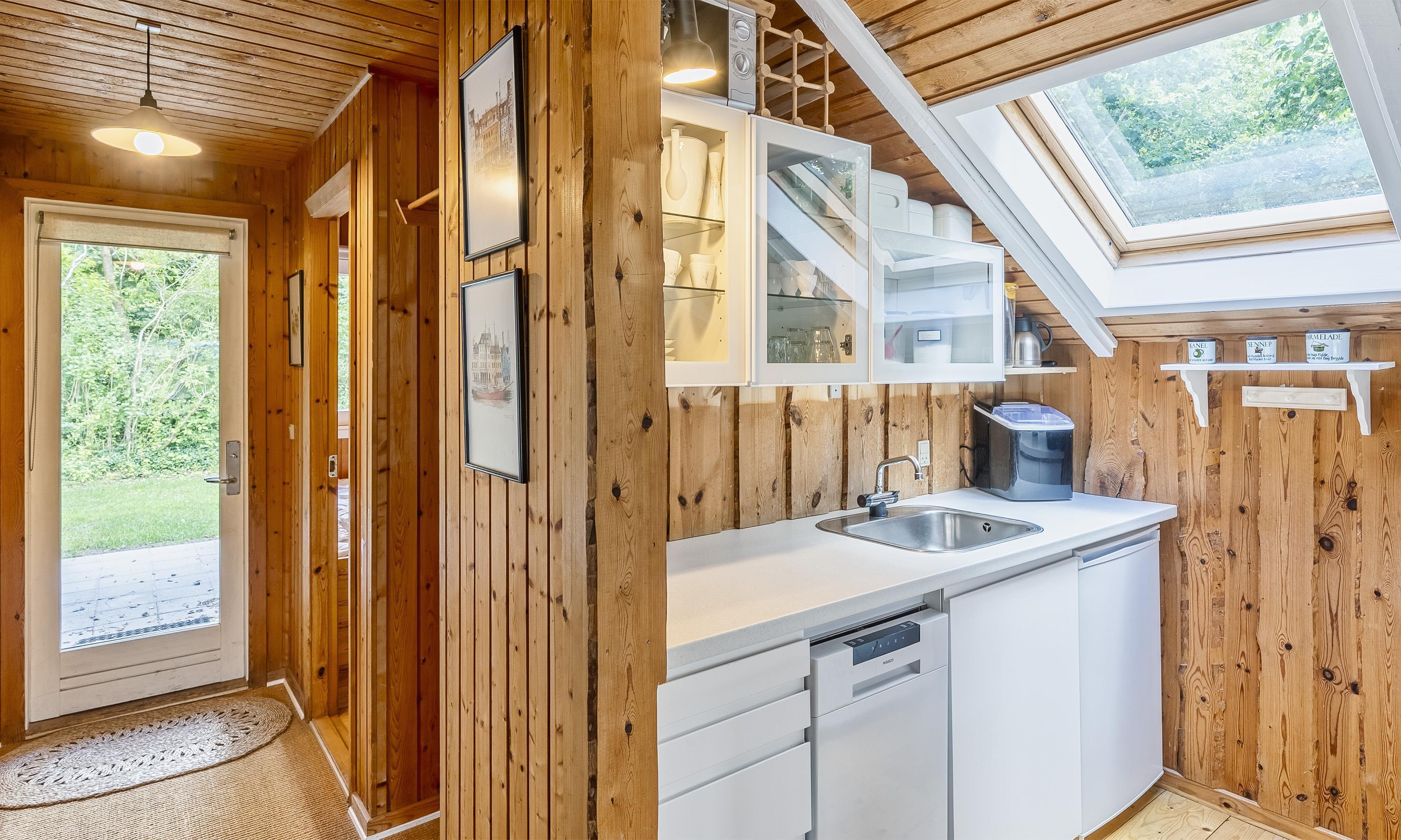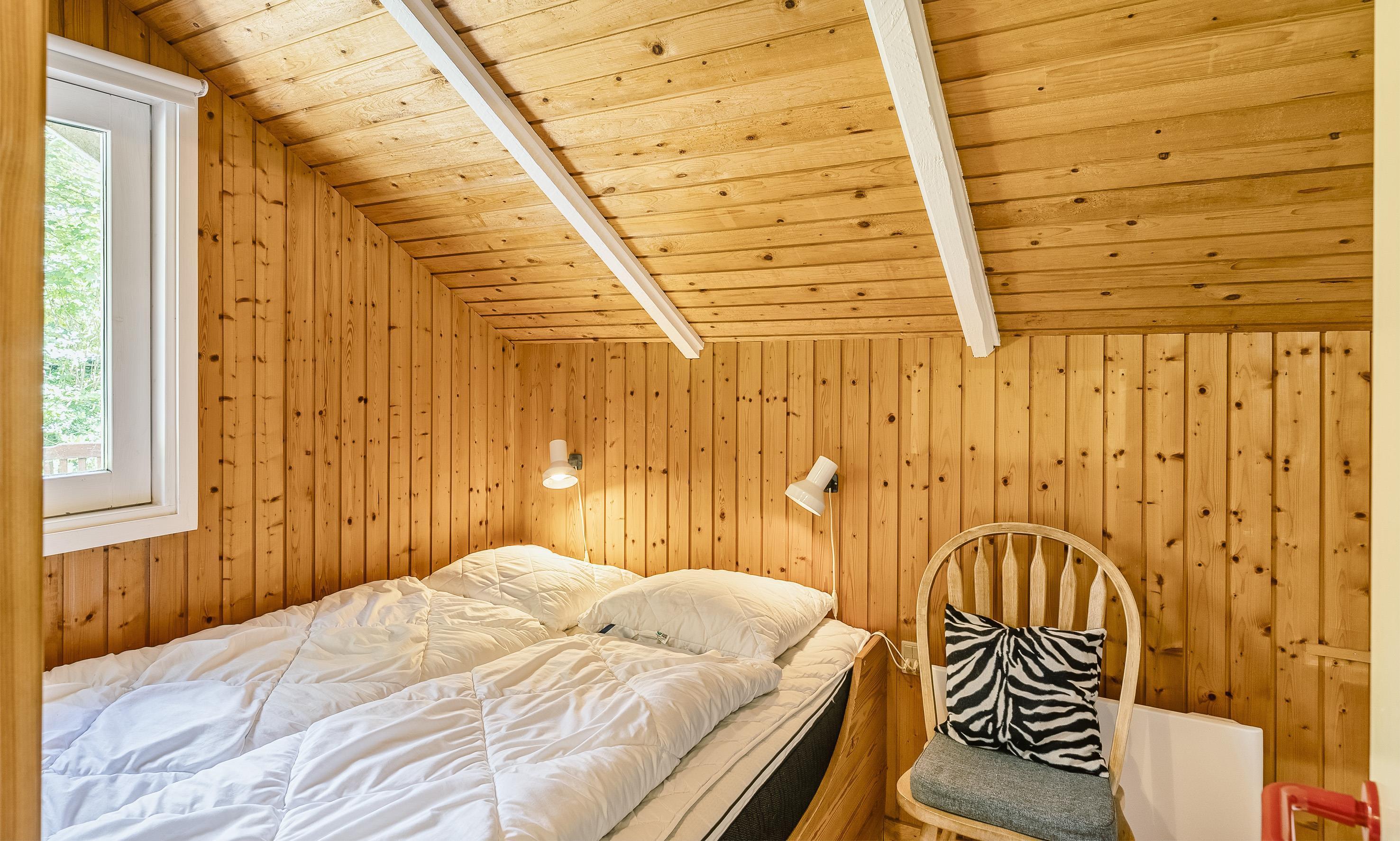 Sommerhuset er indrettet med et åbent køkken i forbindelse med spisepladsen og en stue med loft til kip samt udgang til den store terrasse. Badeværelset har toilet, håndvask og bruser. Der er to soveværelser med plads til i alt fire personer; ét med dobbeltseng og ét med to enkeltsenge (DS + 2 ES). I stuen finder du en brændeovn og energivenlig varmepumpe, som sikrer en hyggelig og behagelig varme. Den store have indbyder til mange aktiviteter for hele familien.