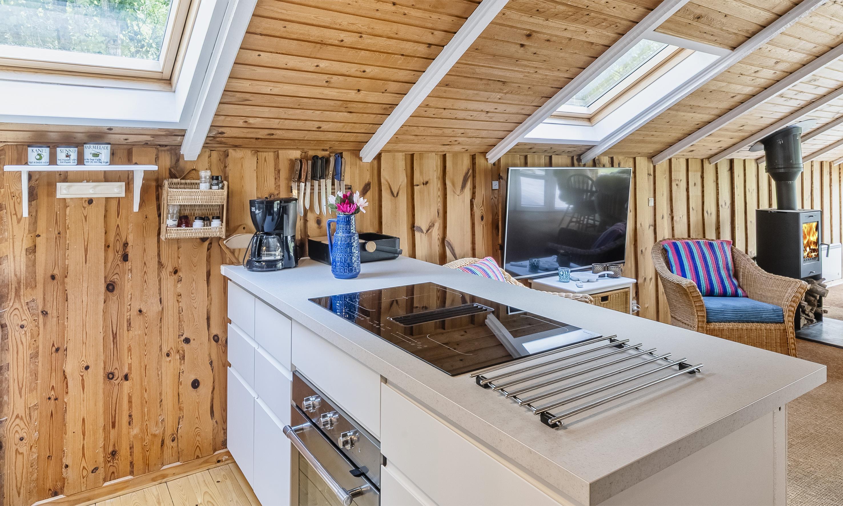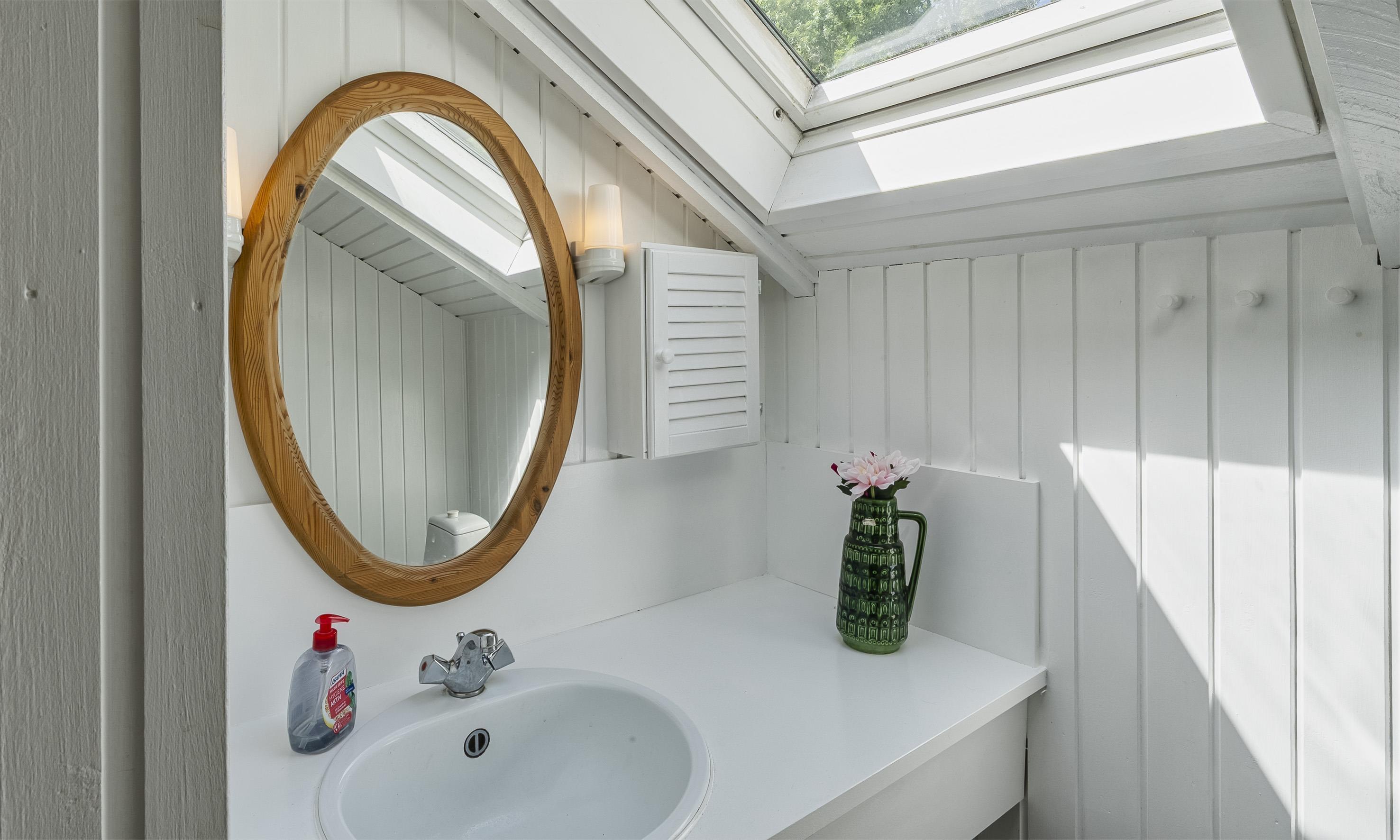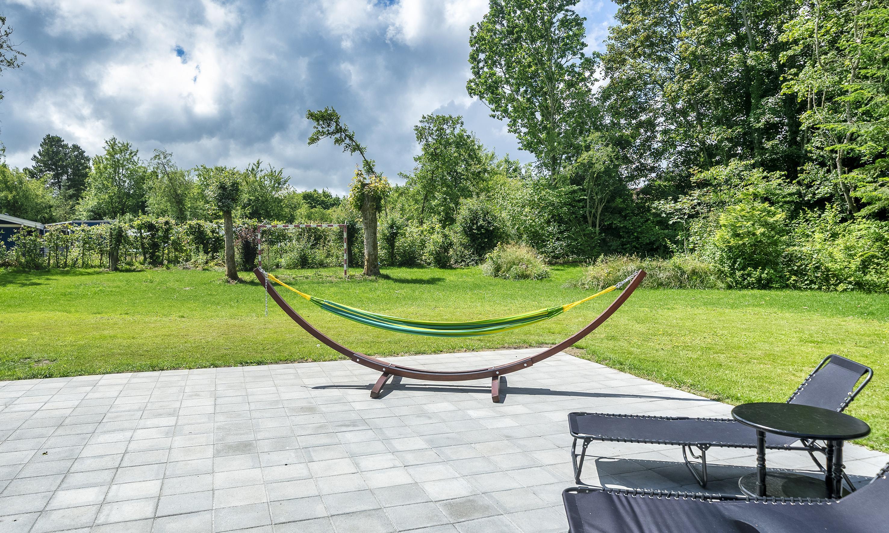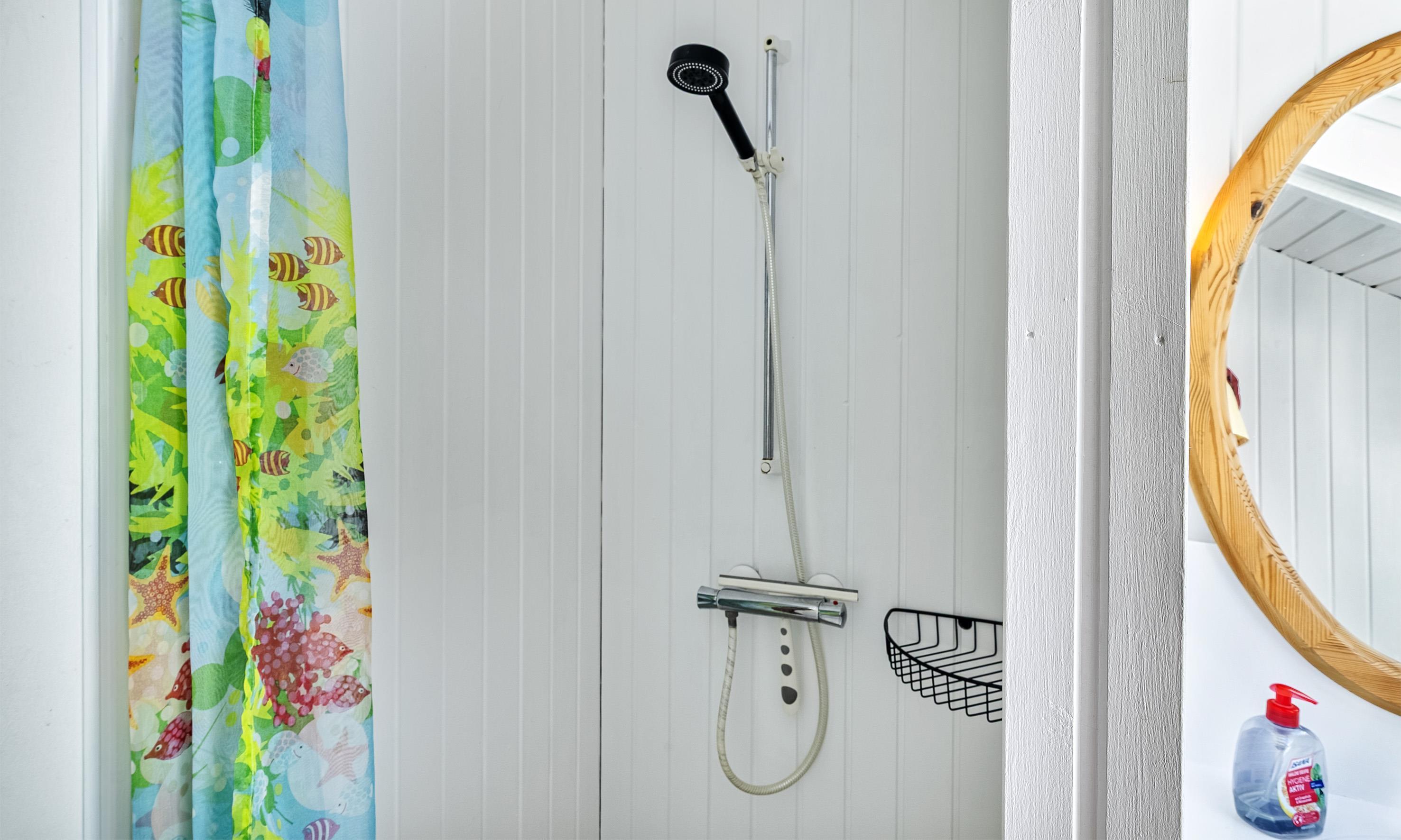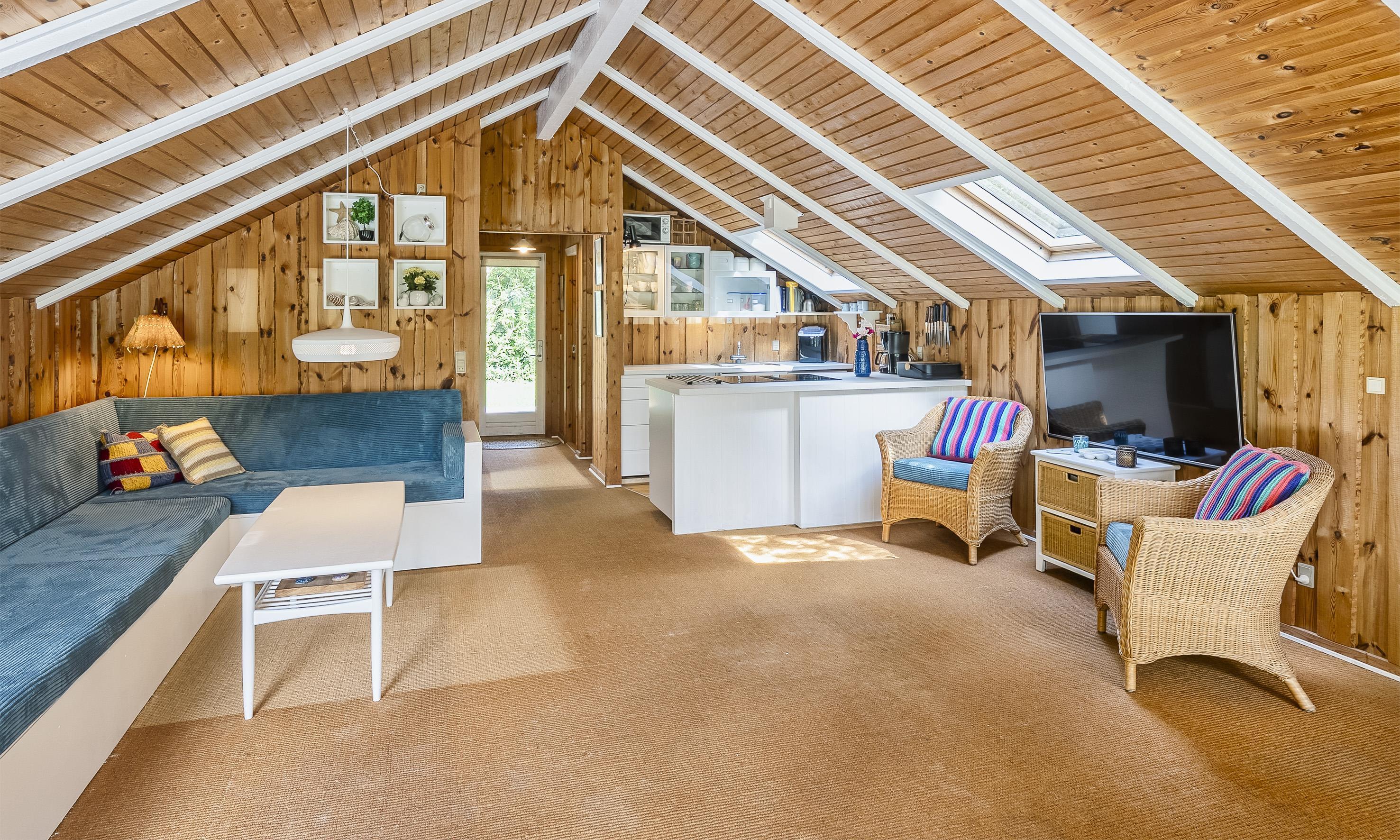 Sommerhuset er indrettet med et åbent køkken i forbindelse med spisepladsen og en stue med loft til kip samt udgang til den store terrasse. Badeværelset har toilet, håndvask og bruser. Der er to soveværelser med plads til i alt fire personer; ét med dobbeltseng og ét med to enkeltsenge (DS + 2 ES). I stuen finder du en brændeovn og energivenlig varmepumpe, som sikrer en hyggelig og behagelig varme. Den store have indbyder til mange aktiviteter for hele familien.