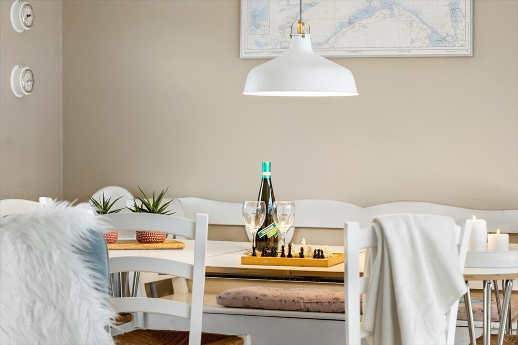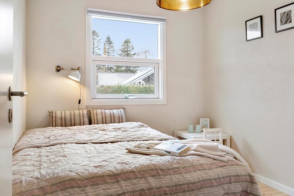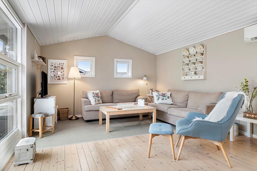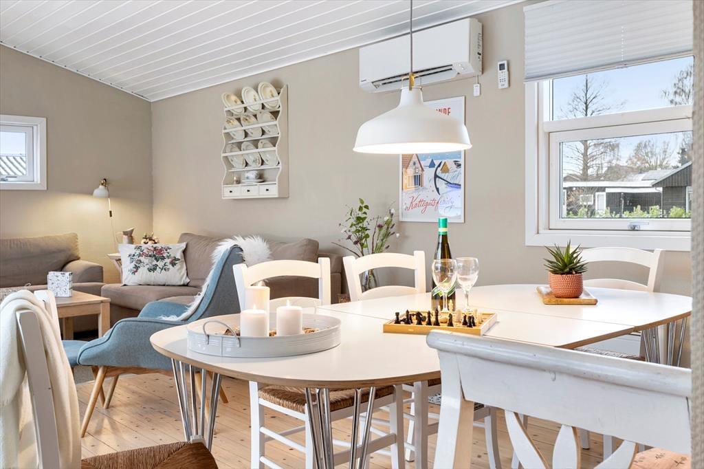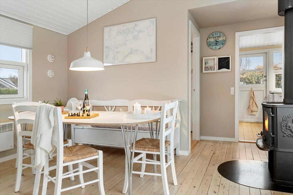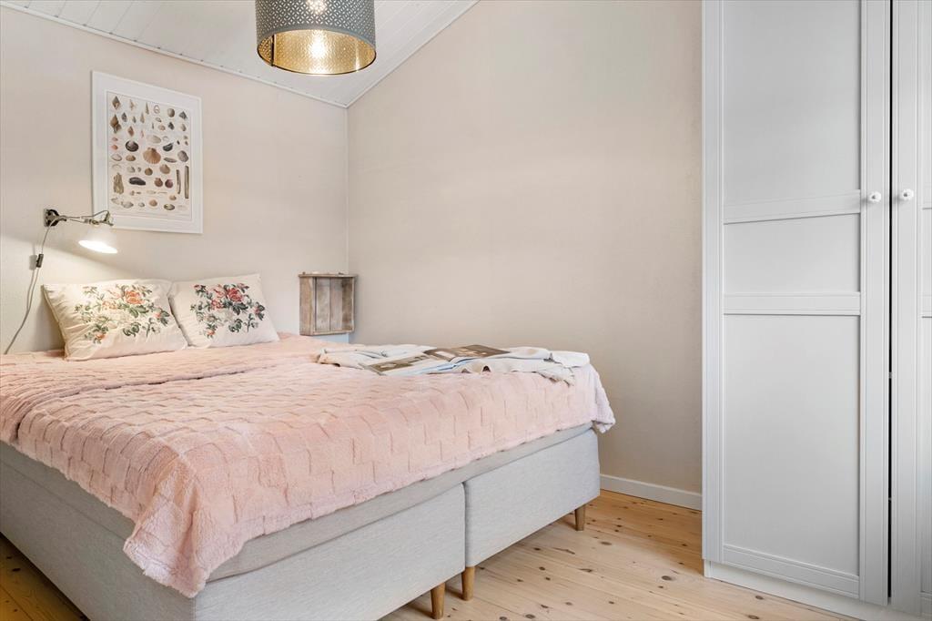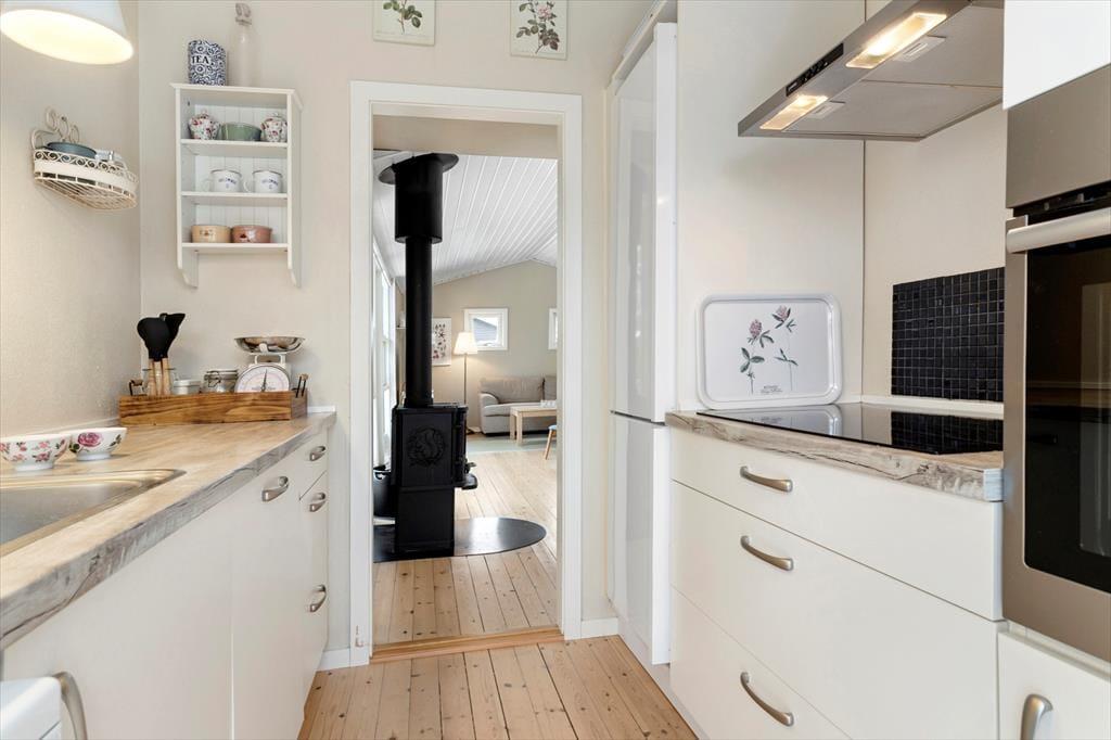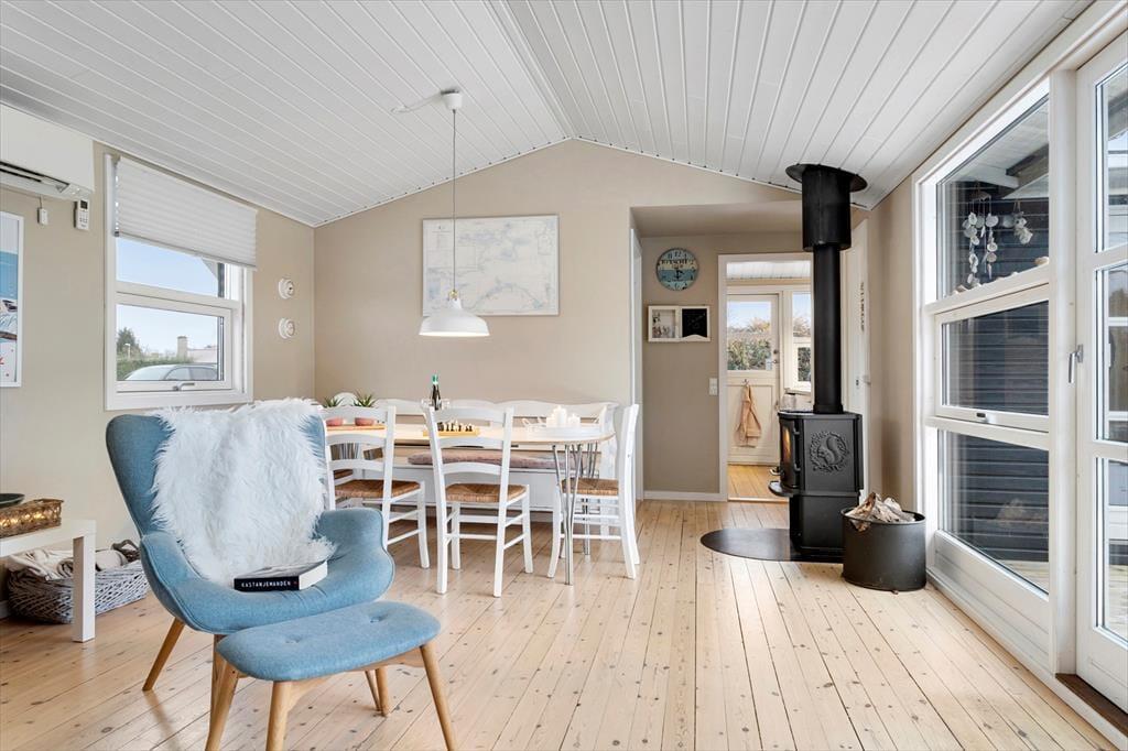 Ved indgangen mødes I af et køkken, der har alt, hvad I behøver under jeres ophold, inklusive opvaskemaskine. Der er en rummelig stue med god spiseplads til hele familien, en flot sofagruppe, brændeovn og TV. Selvom der ikke er traditionelle TV-kanaler, kan I benytte husets Chromecast til at se jeres egne TV- og streamingtjenester via mobil eller tablet. Sommerhuset har en praktisk indretning med to komfortable soveværelser og et badeværelse. Sovepladserne fordeler sig på to dobbeltsenge.