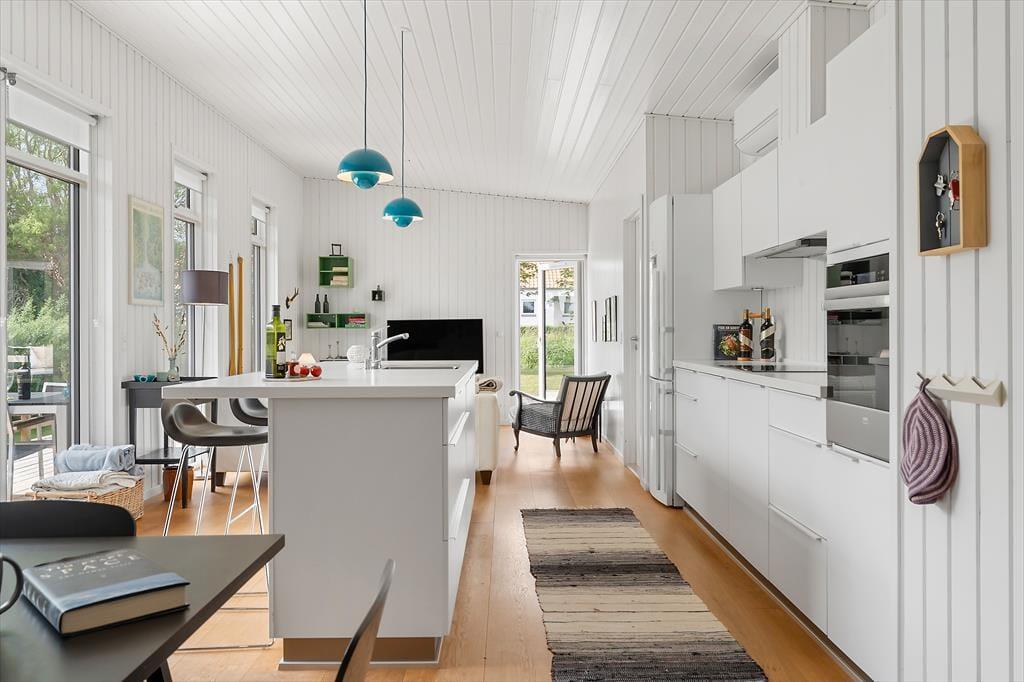 Sommerhuset byder på en dejlig, lys entré, hvorfra der er adgang til husets hjerterum – det lyse køkken-alrum, som er i åben forbindelse med stuen. Her er der god plads til at samle familien til hyggelige måltider, brætspil og afslapning i sofaarrangementet.