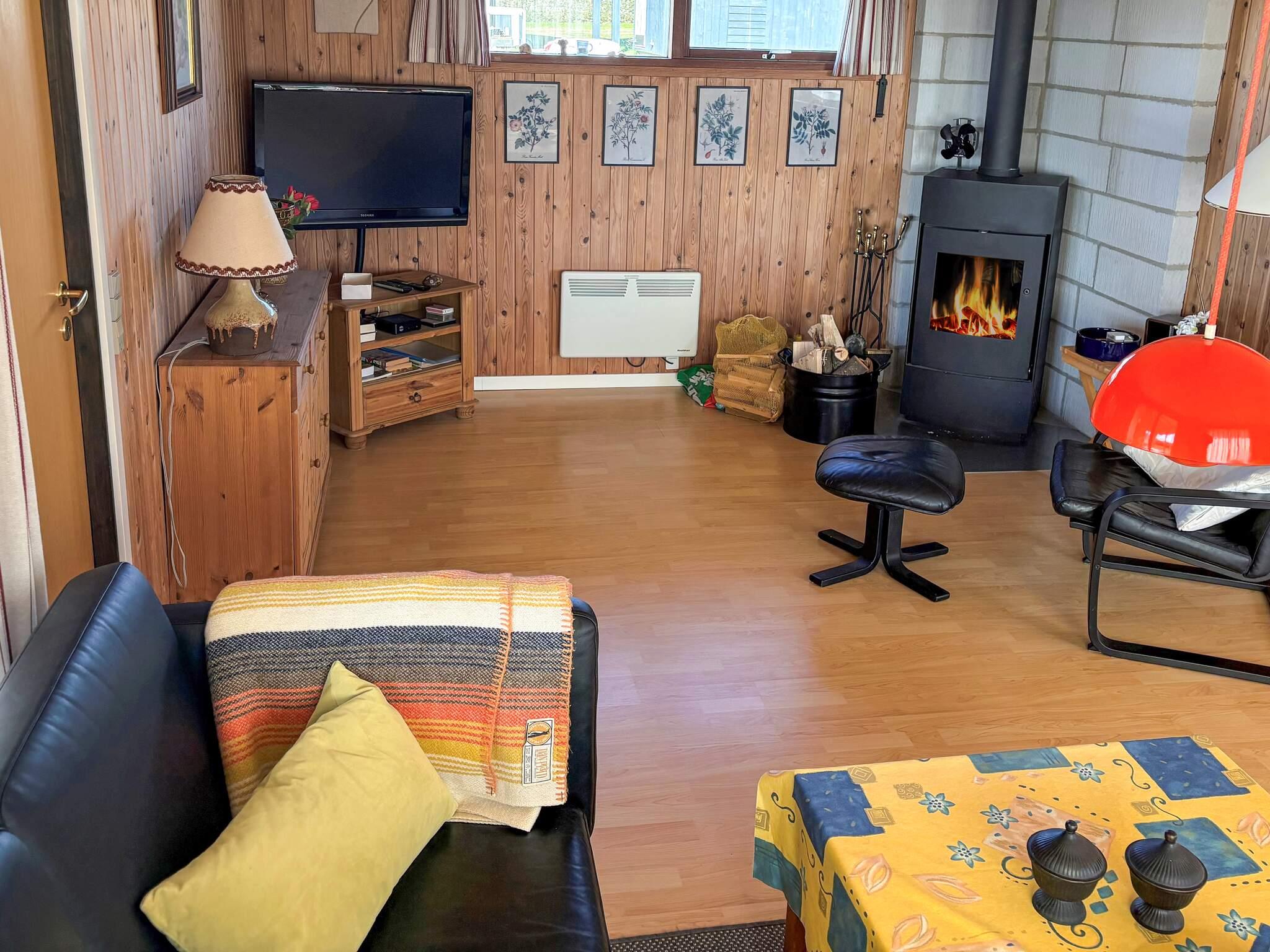 Indendørs skaber brændeovnen en varm og indbydende atmosfære, som gør huset oplagt til ophold året rundt – uanset om det er sommer eller de køligere måneder.