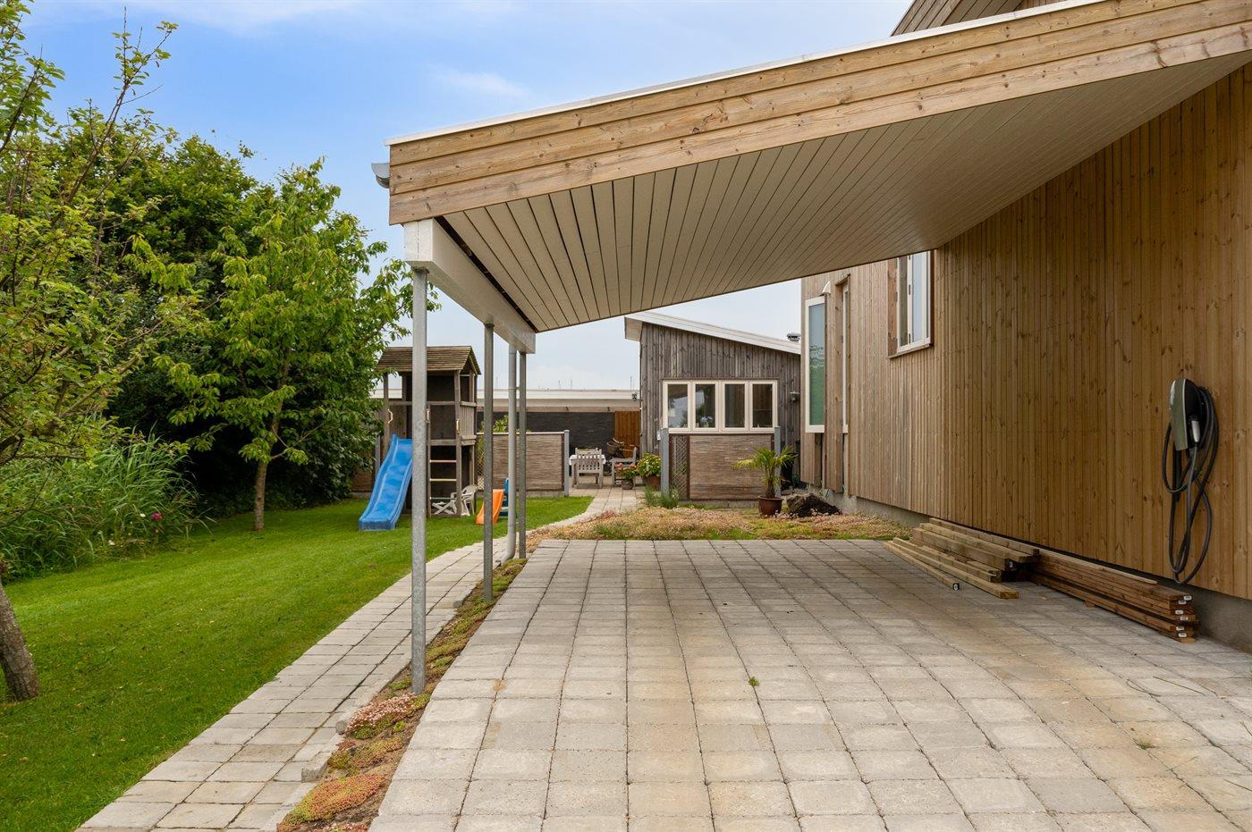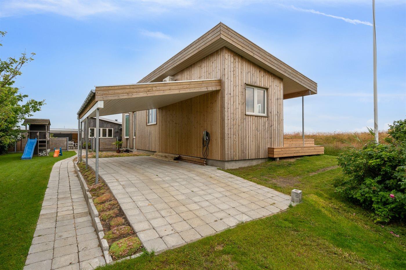 Der er carport til rådighed og parkering ved ferieboligen, hvor der også er installeret stik til opladning af elbil.