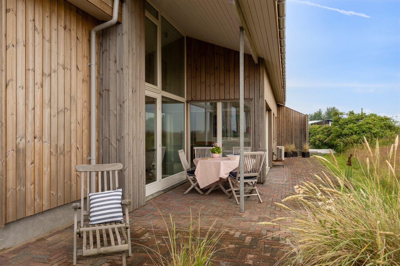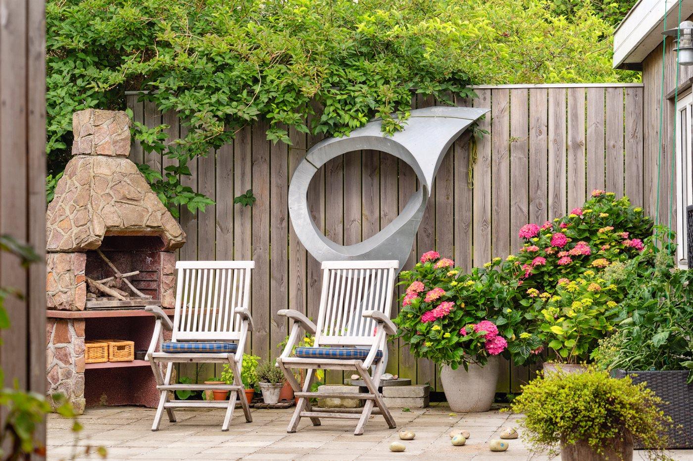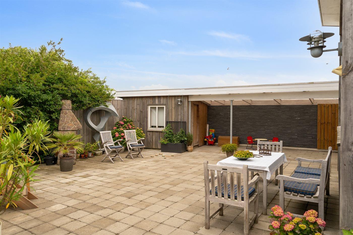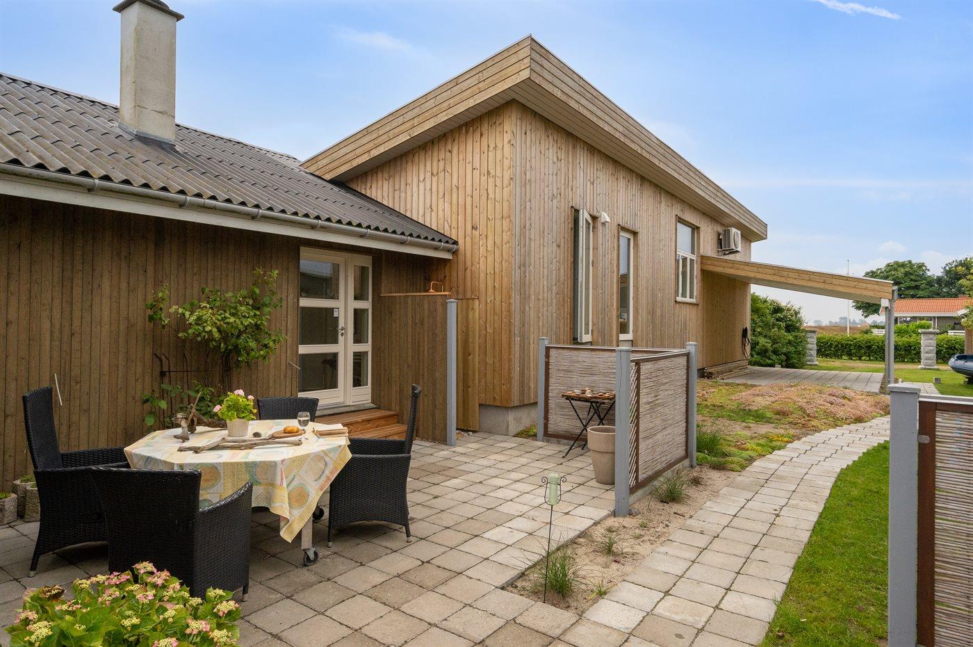 På grunden og terrassen findes der mange hyggekroge med havemøbler, så der er mulighed for at nyde solen fra morgen til aften. Der er både overdækket og åben terrasse. På den overdækkede terrasse bag huset kan I nyde den ugenerte beliggenhed, og på de lune aftener sørger en udendørs pejs for en hyggelig stemning. Til børnene findes legetårn med gynge og sandkasse.