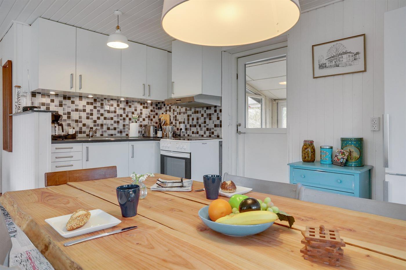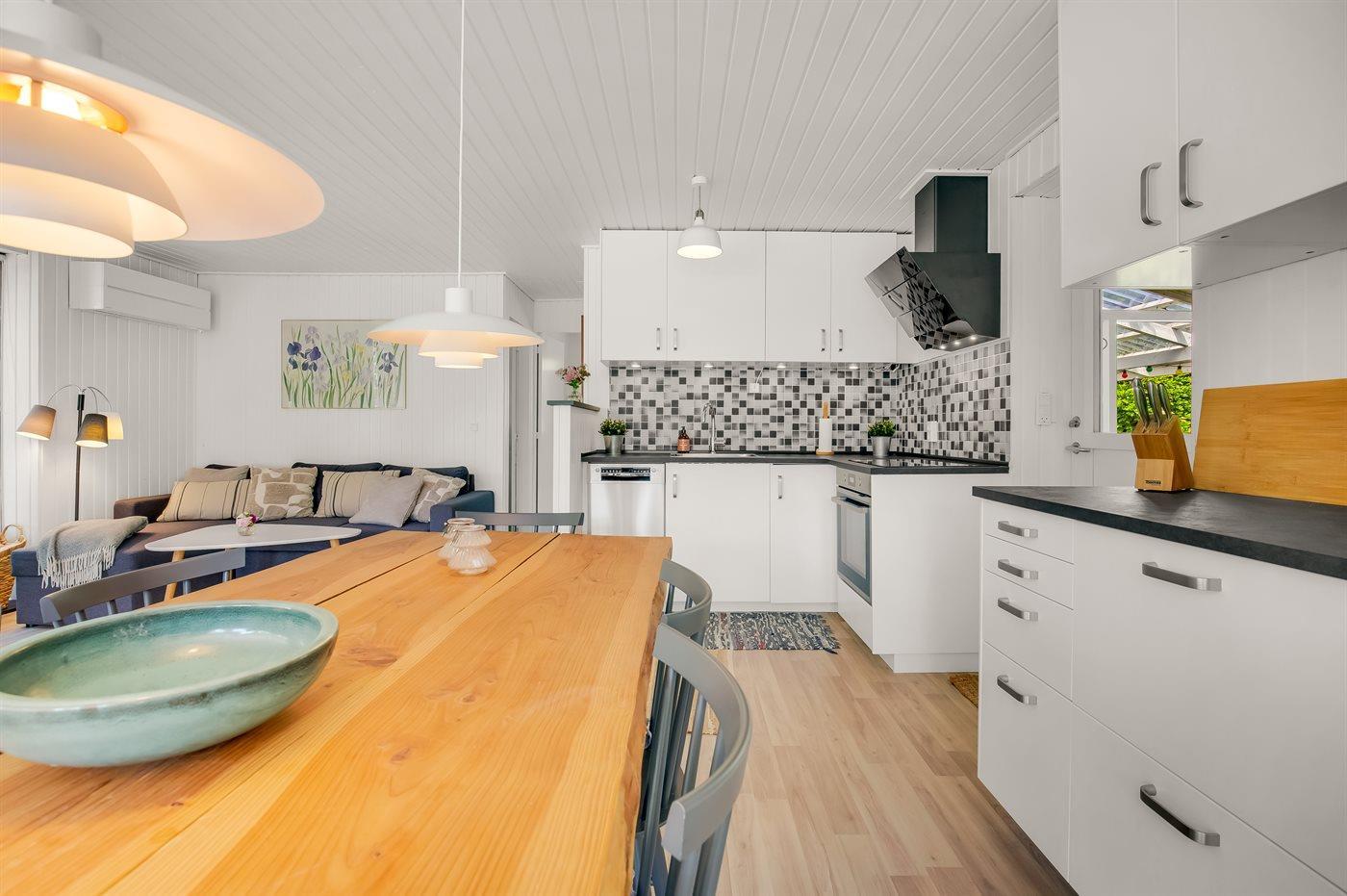 Køkkenet er udstyret med 1 køleskab. Der er 4 keramiske kogeplader, varmluftovn samt opvaskemaskine.