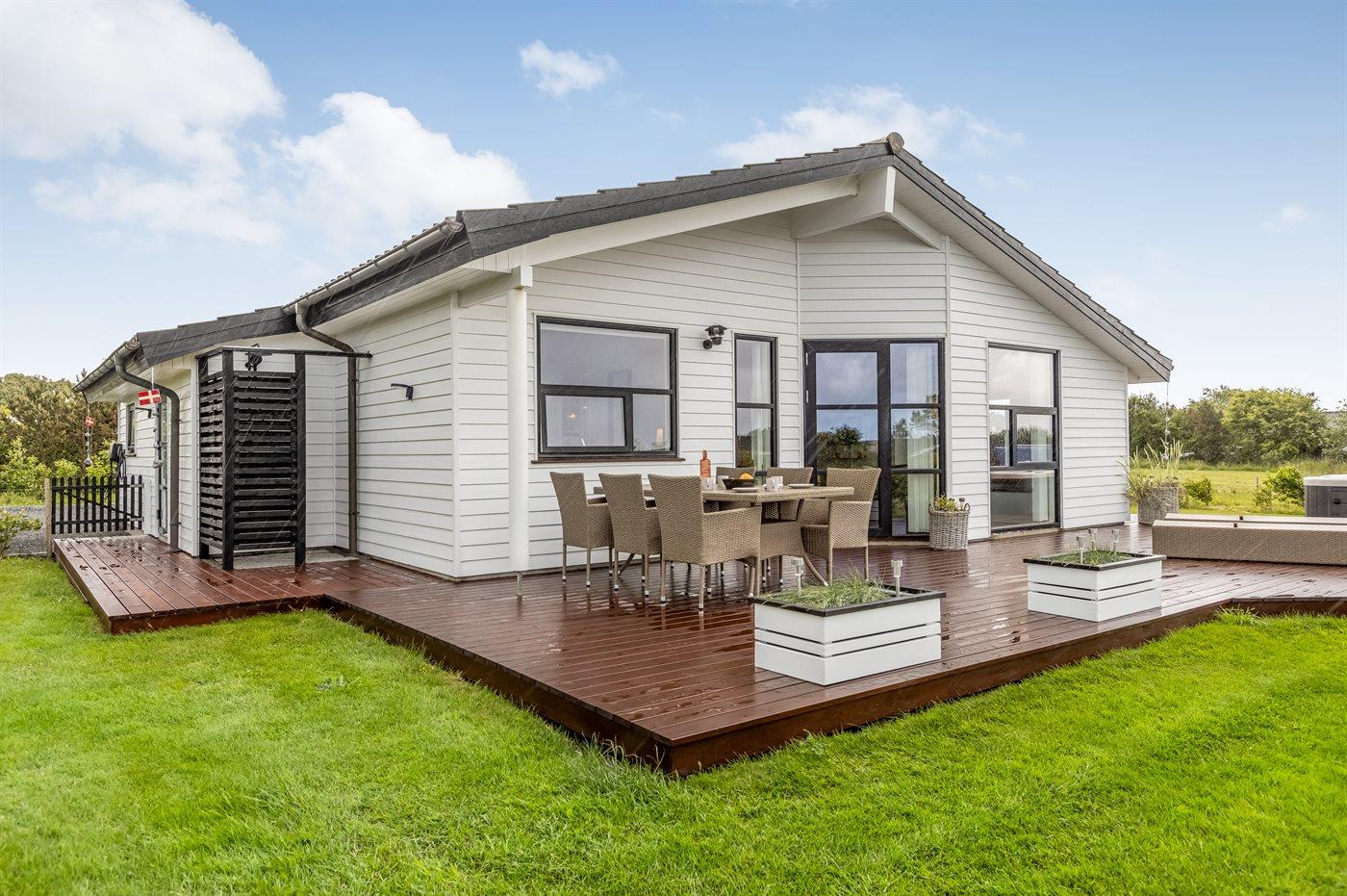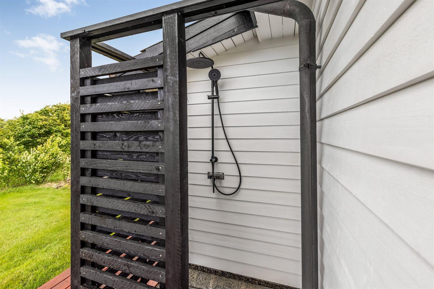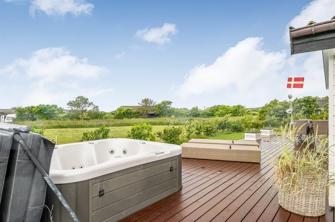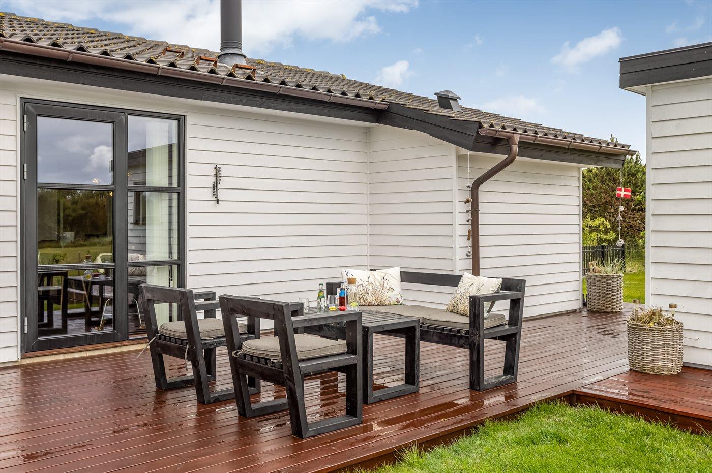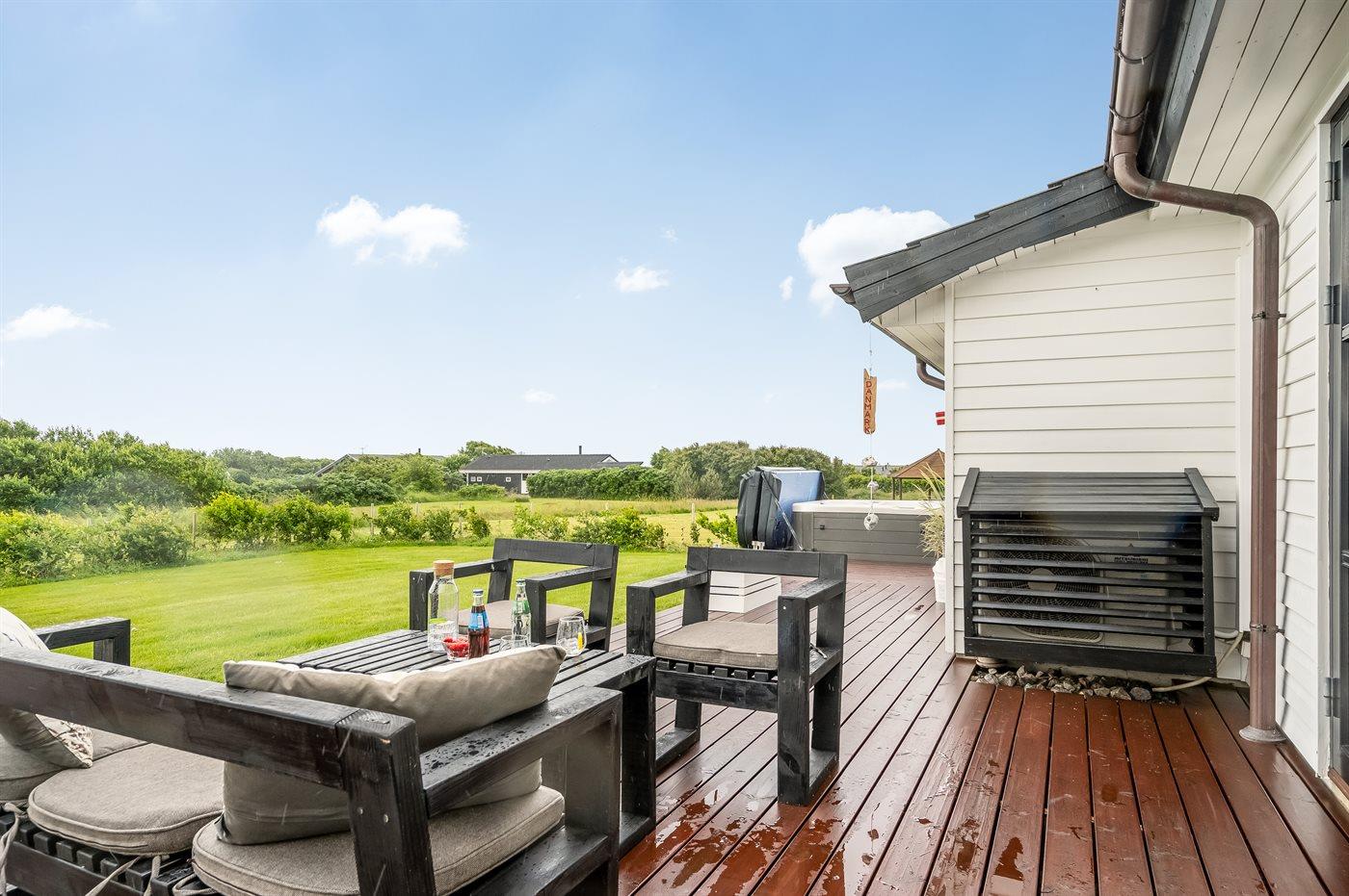 På husets terrasse findes der udover havemøbler også en udendørs spa til 5 personer samt en udebruser, som begge står til rådighed fra påske til med uge 42.