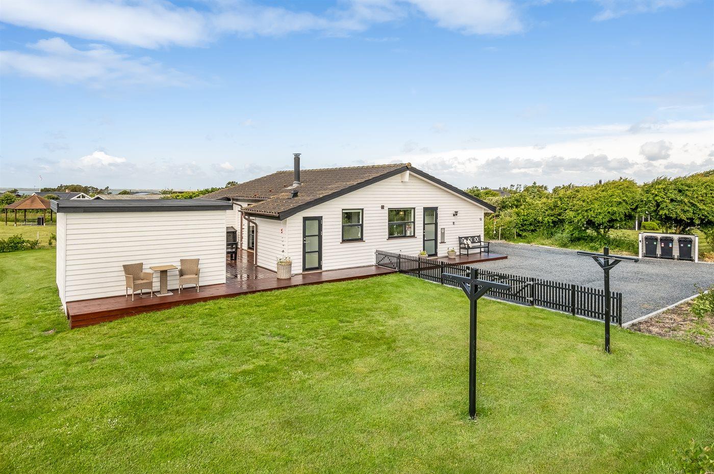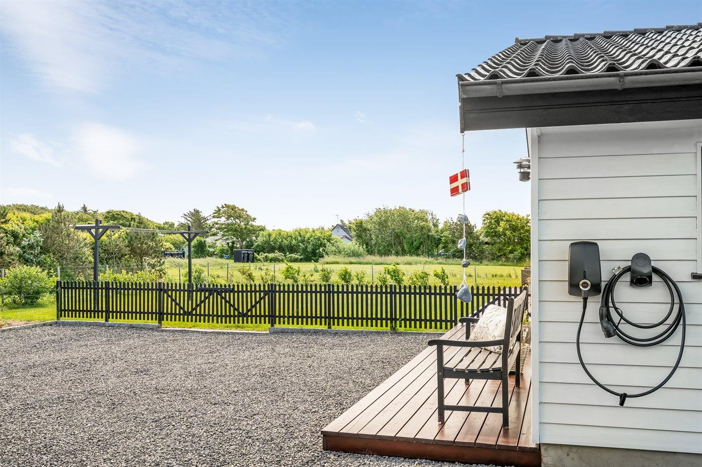 Ferieboligen er beliggende på en 900 m² stor naturgrund. Der er 2000 m til havet. Der er 300 m til fjorden. Nærmeste forretning er beliggende i en afstand af 990 m. Til ferieboligen hører 100 m² terrasseareal. Desuden er der 10 m² overdækket terrasse. Udendørs bruser. Grill til rådighed. Der er installeret stik til opladning af elbil. Parkering ved ferieboligen.
