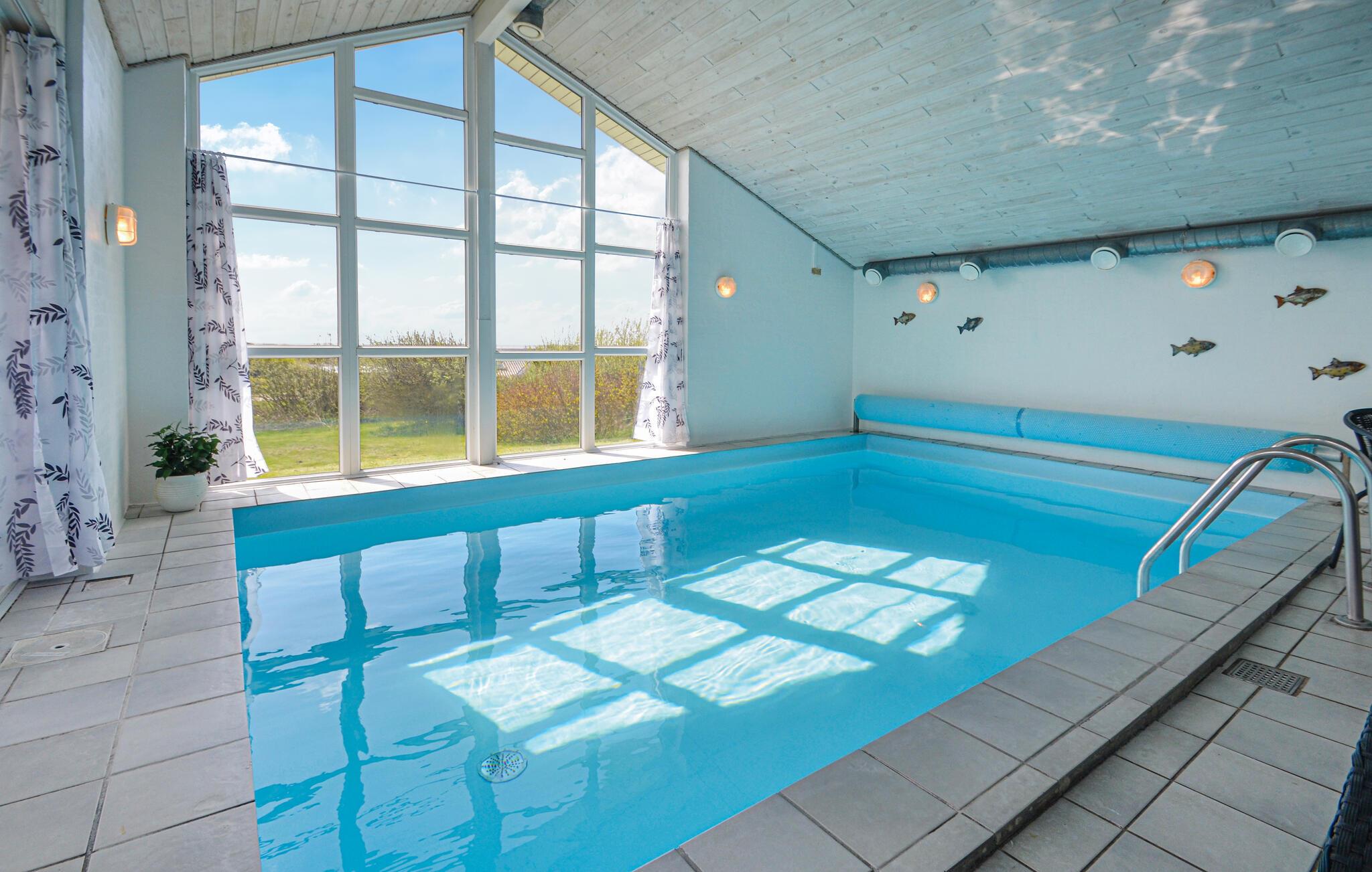 Den store stue er omdrejningspunktet i huset og ligger i tilknytning til det lyse og funktionelle køkken. Det flotte poolrum har store vinduer med udsigt og i den ene ende er der en maritim udsmykning. Her kan fordrives mange dejlige timer med leg og vandsprøjt, ligesom I kan sidde tilbagetrukket og hyggesnakke, mens I kigger på børnene i bassinet. Husets ene badeværelse med spa og sauna, ligger ved siden af poolområdet og det andet i forbindelse med værelserne i husets anden side.