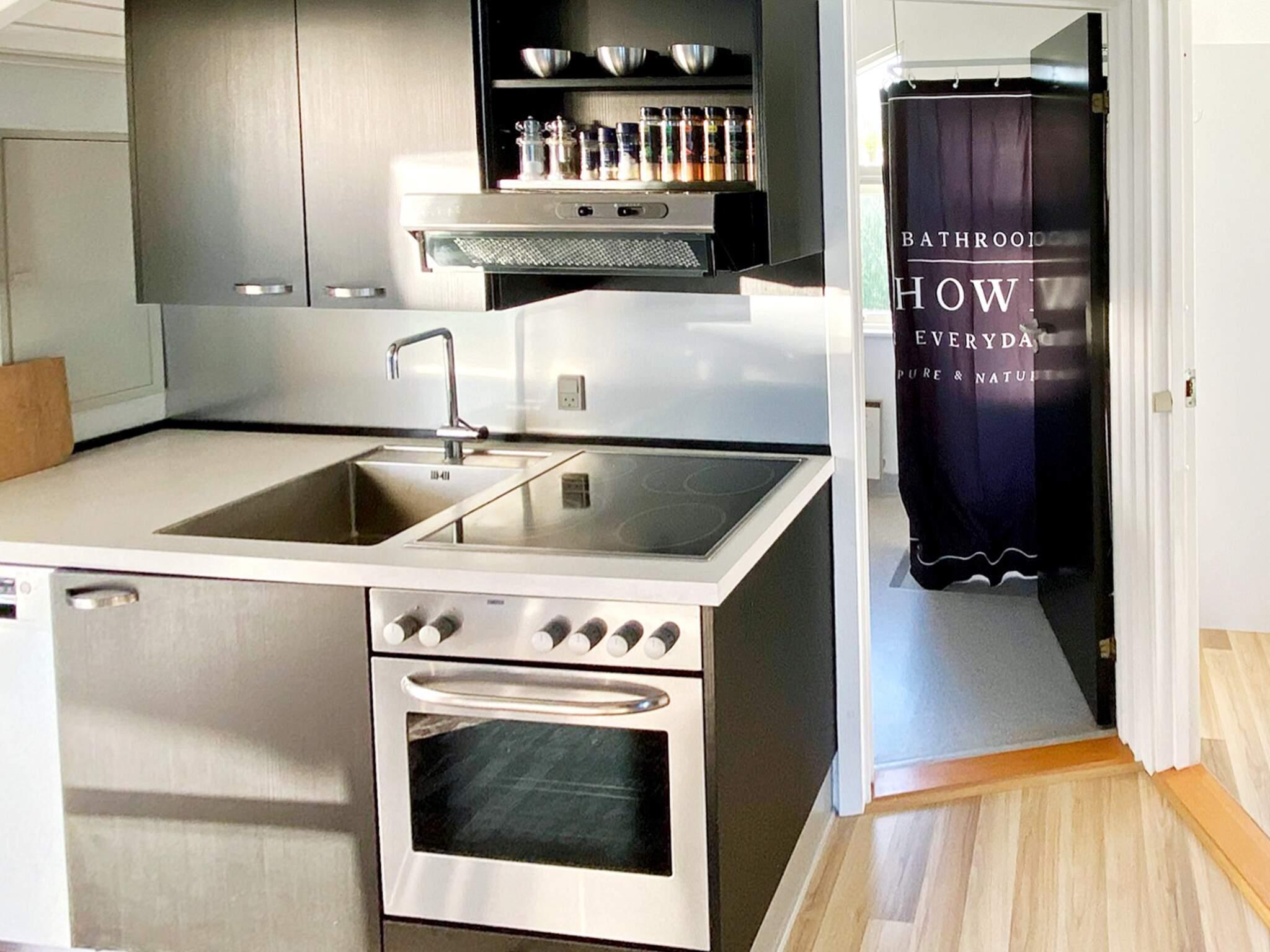 Køkkenet er udstyret med køleskab, keramisk kogeplade, varmluftsovn, mikroovn og opvaskemaskine. Derudover er der en 80-liters fryser, vaskemaskine, og brændeovn.