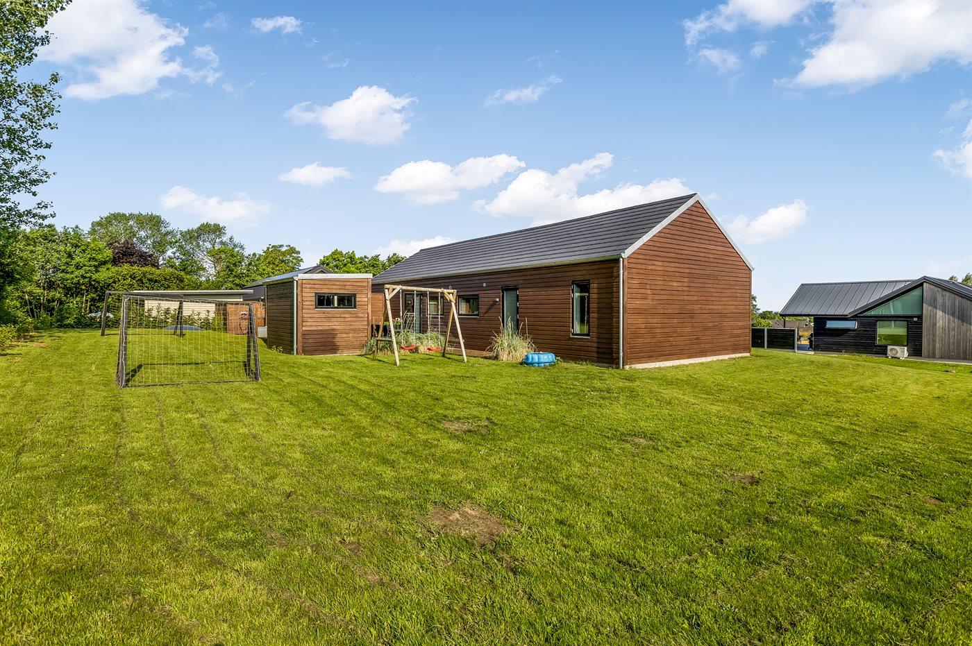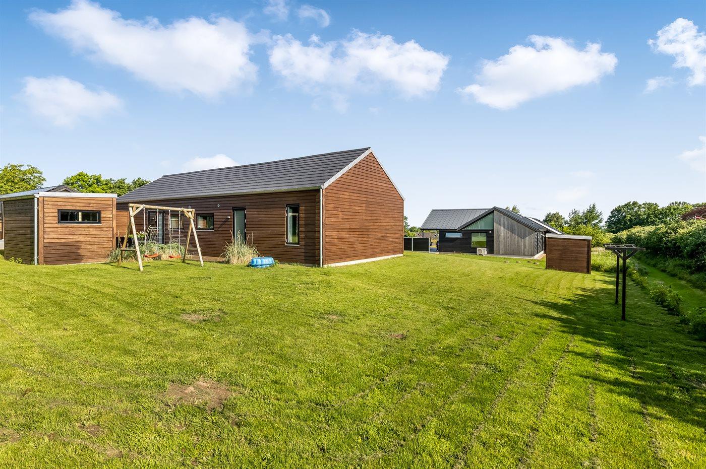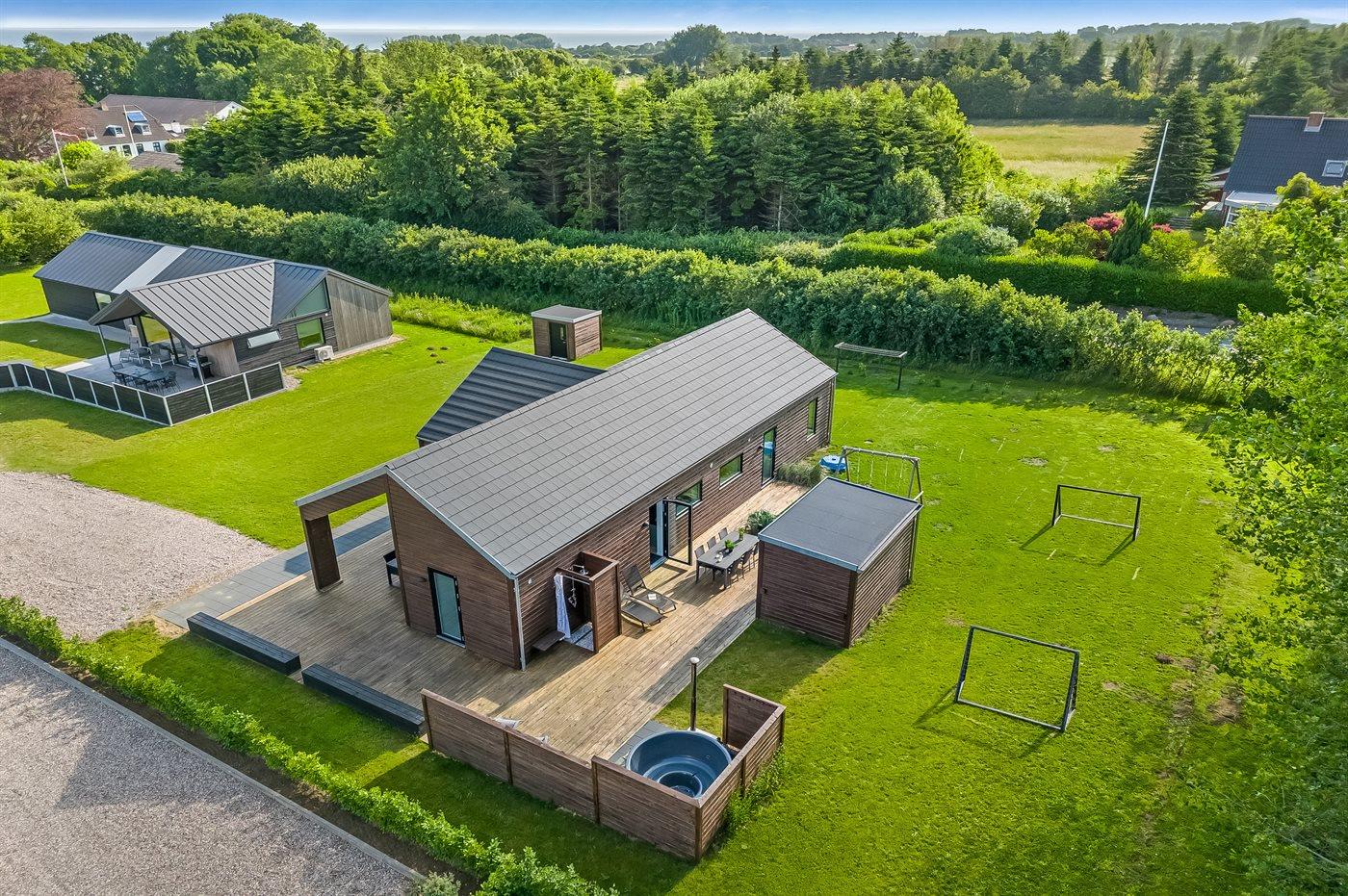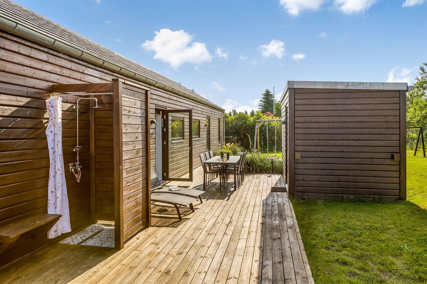 Ferieboligen er beliggende på en 1200 m² stor havegrund. Der er 400 m til havet. Nærmeste forretning er beliggende i en afstand af 2000 m. Der er en golfbane i en afstand af 6000 m. Til ferieboligen hører åbent og 18 m2 overdækket terrasseareal. Der er redskabsrum. Gynge. Sandkasse. Udendørs bruser. Grill til rådighed. Der er installeret stik til opladning af elbil. CEE stik. Parkering ved ferieboligen.