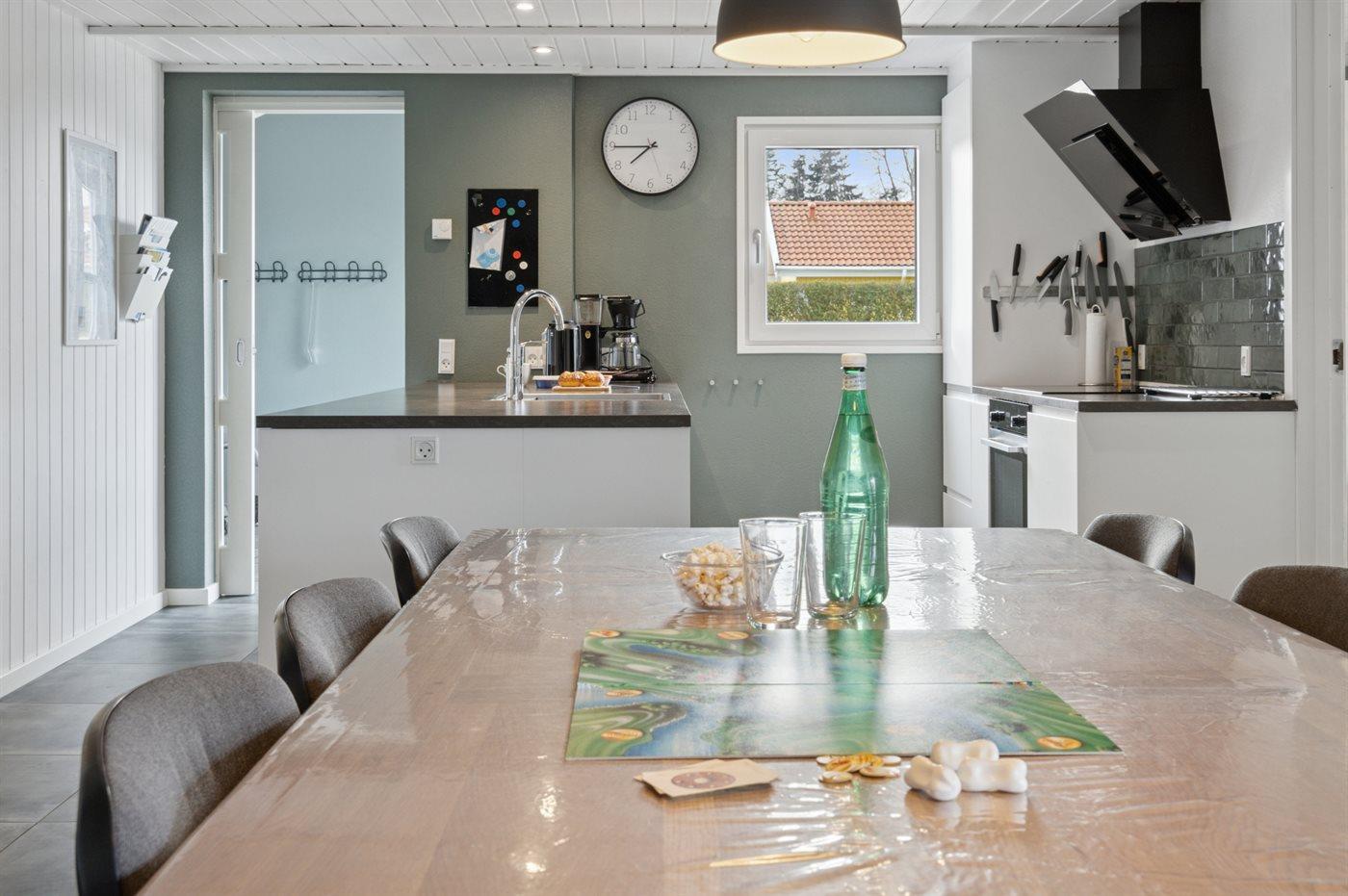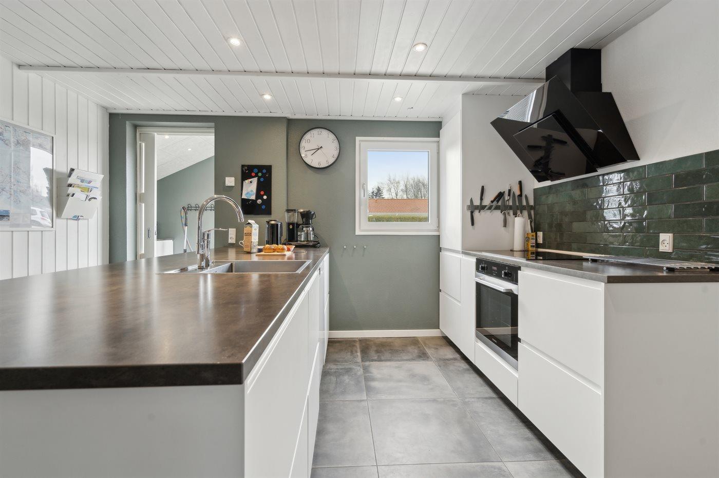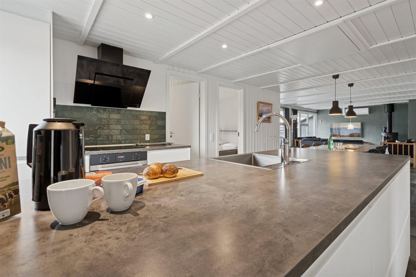 Køkkenet er udstyret med 2 køleskabe. Der er 4 induktionskogeplader, varmluftovn, mikrobølgeovn samt opvaskemaskine.