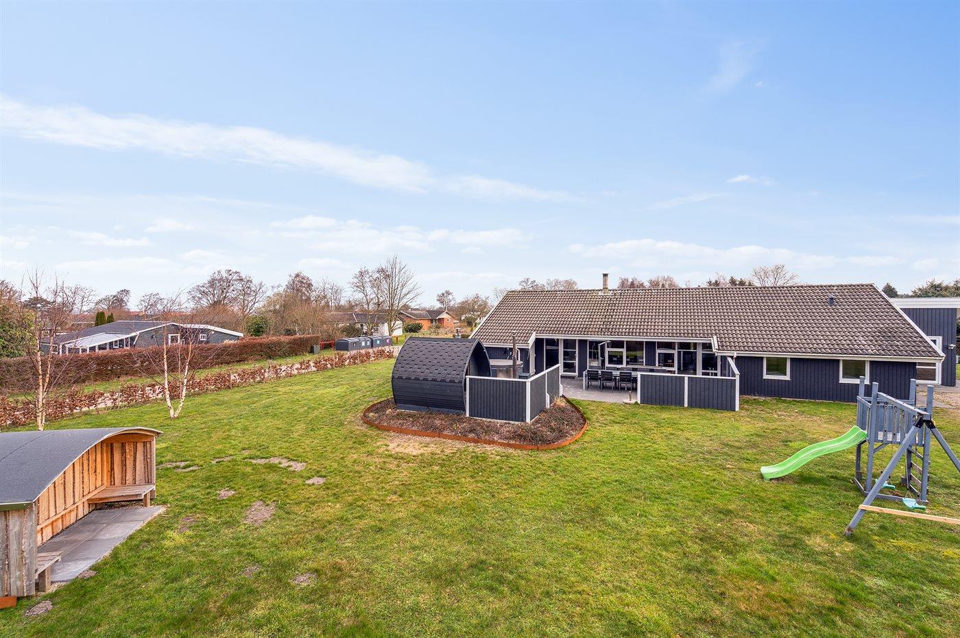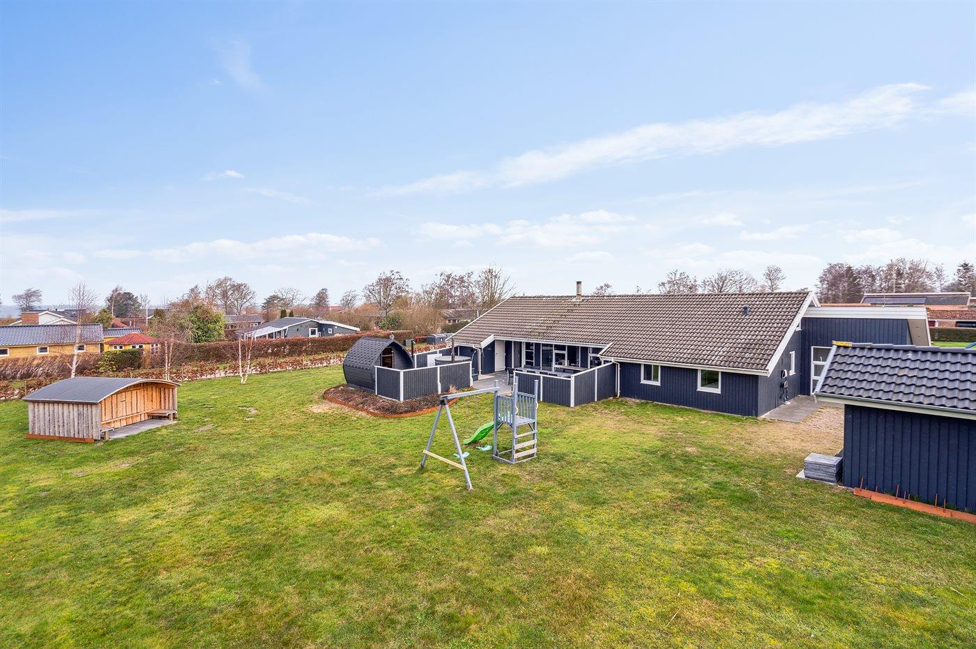 Ferieboligen er beliggende på en 1500 m² stor havegrund. Der er 250 m til havet. Der er en badebro i nærheden. Nærmeste forretning er beliggende i en afstand af 4000 m. Der er en golfbane i en afstand af 8000 m. Til ferieboligen hører åbent terrasseareal. Der er redskabsrum. Gynge. Legetårn. Rutchebane. Udendørs sauna. Udendørs bruser. Grill til rådighed. Der er installeret stik til opladning af elbil. Type 2 stik. Med 11 kW ladeeffekt. Parkering ved ferieboligen.