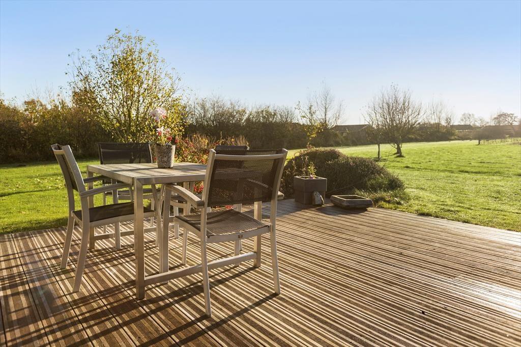 Udenfor finder I en skøn, stor træterrasse, hvor morgenkaffen kan nydes i solens første stråler, og aftensmaden tilberedes på grillen. Haven er en drøm for både børn og voksne med masser af plads til leg, boldspil og måske en tur på trampolinen. Mens børnene brænder energi af, kan de voksne slappe af med en bog i solen eller nyde de fredelige omgivelser. Haven er omkranset af frodig natur, som skaber en privat og rolig atmosfære – perfekt til at koble af og mærke feriestemningen helt ind under huden.