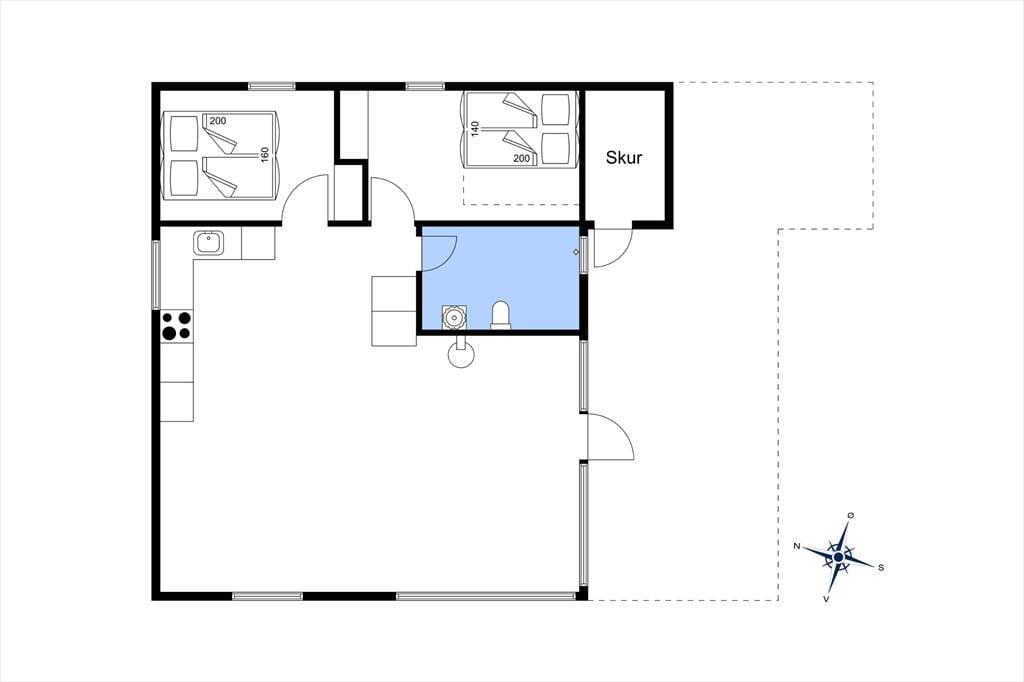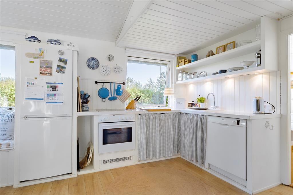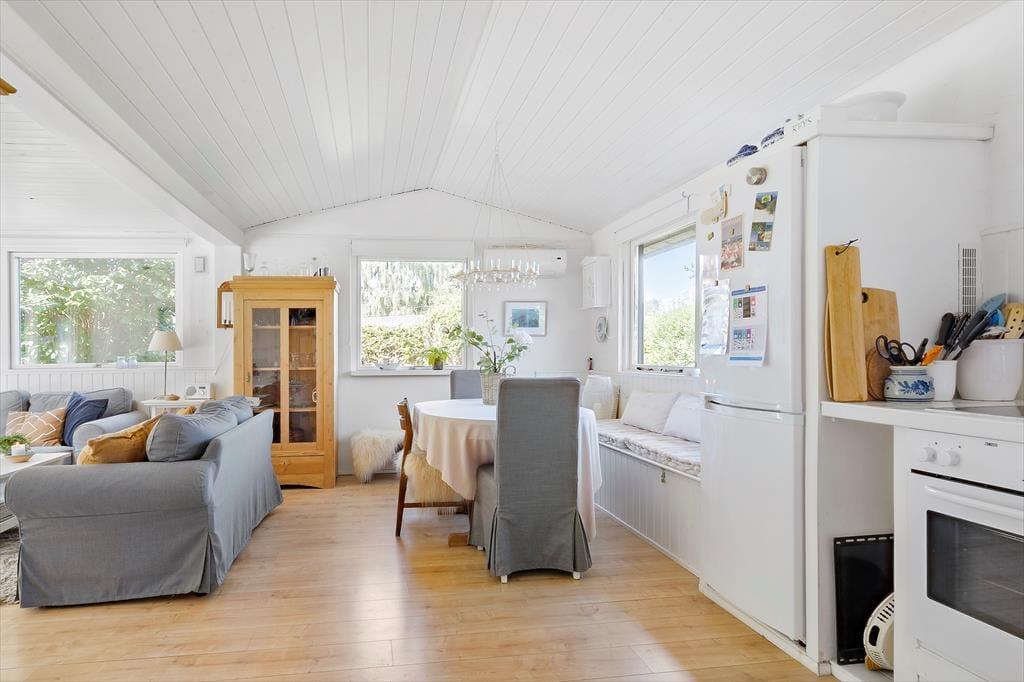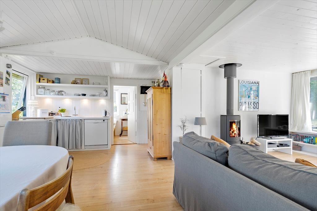 Denne hyggelige fritidsbolig indeholder et køkken i åben forbindelse med stuen med spiseplads, brændeovn, energibesparende varmepumpe samt udgang til terrassen. Derudover er der et soveværelse med dobbeltseng, et værelse med en sovesofa samt et badeværelse. Bemærk at der ikke er internetforbindelse i huset. Ønsker man at være online på ferien, kan der lejes en internetboks hos .