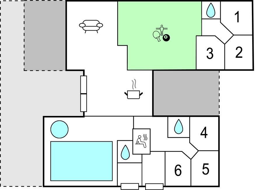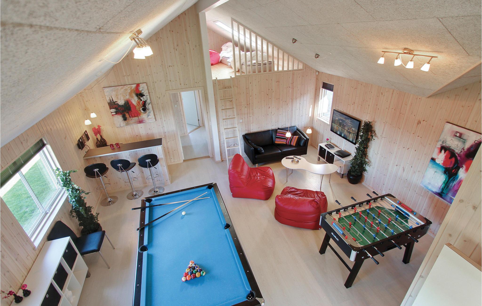 Velkommen til et flot og rummeligt feriehus, hvor I kan se frem til et stort udvalg af fælles aktiviteter i enhver sæson. I poolområdet er der både vandrutsjebane og modstrømssystem, så her får I nemt timerne til at gå. Sæt jer til rette i det store spabad eller nyd varmen i saunaen. Mellem dagens udflugter kan I hygge jer med et spil billard, bordtennis, bordfodbold eller dart i aktivitetsrummet. Der er også gode rammer det åbne køkken og opholdsstuen, som har udsigt til poolområdet. Efter dagens aktiviteter er det hyggeligt at nyde varmen i brændeovnen i stuen.