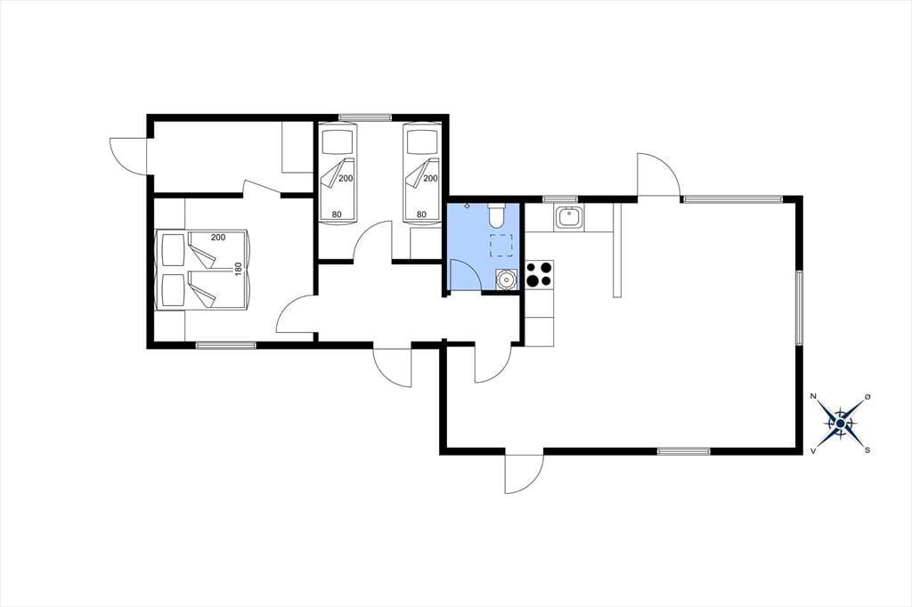 Velkommen indenfor: Indendørs finder du et lyst og hyggeligt åbent køkken, der sammen med spise- og opholdsstuen er perfekt til fælles hygge og gode måltider. Huset rummer to soveværelser: ét med en komfortabel dobbeltseng og et andet med to enkeltsenge, hvilket gør det ideelt både for par og mindre familier. Badeværelset er praktisk indrettet med bruser, toilet og vask. Sommerhusets indretning er meget lys og indbydende, hvilket skaber en dejlig rolig atmosfære.