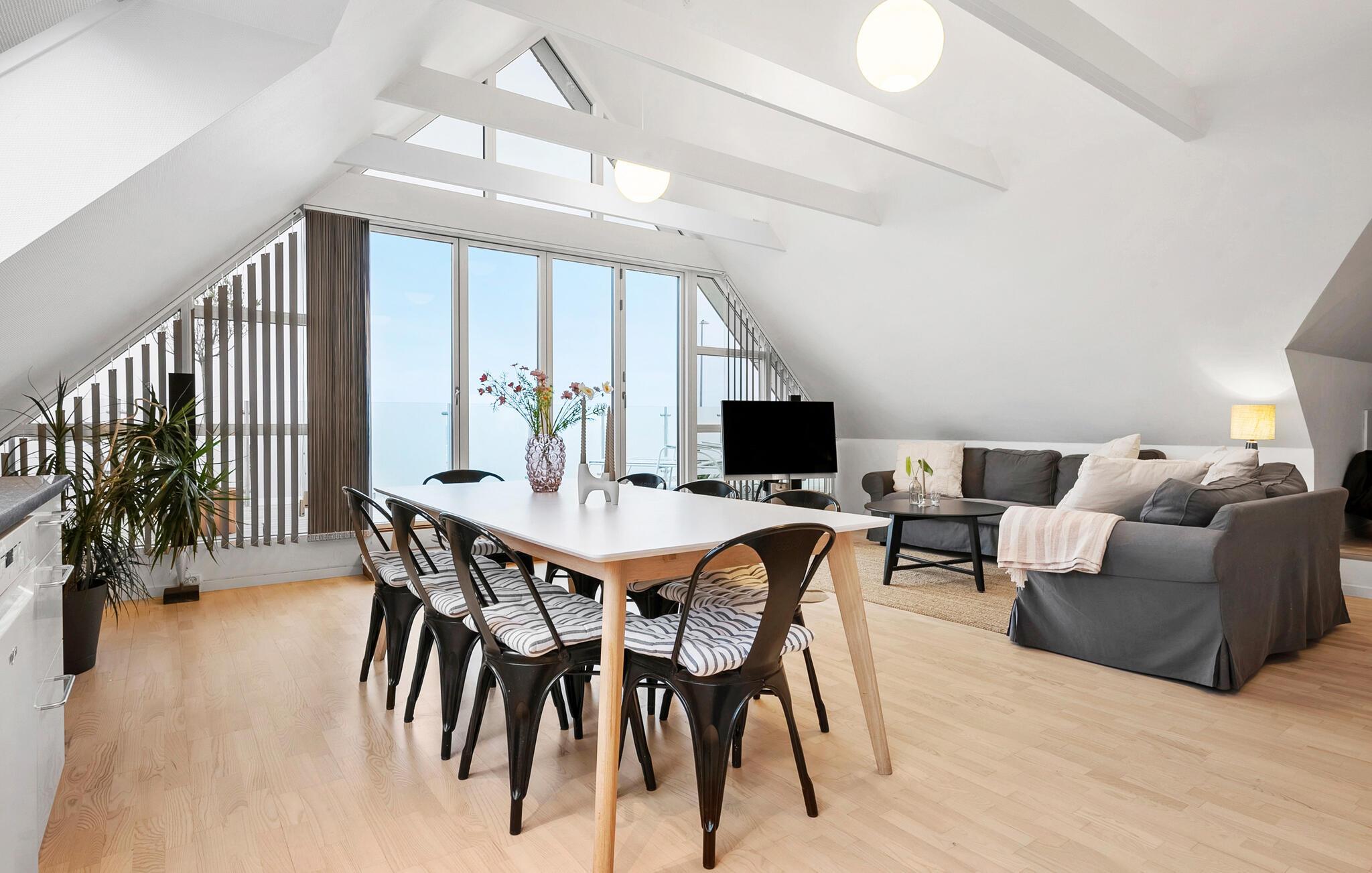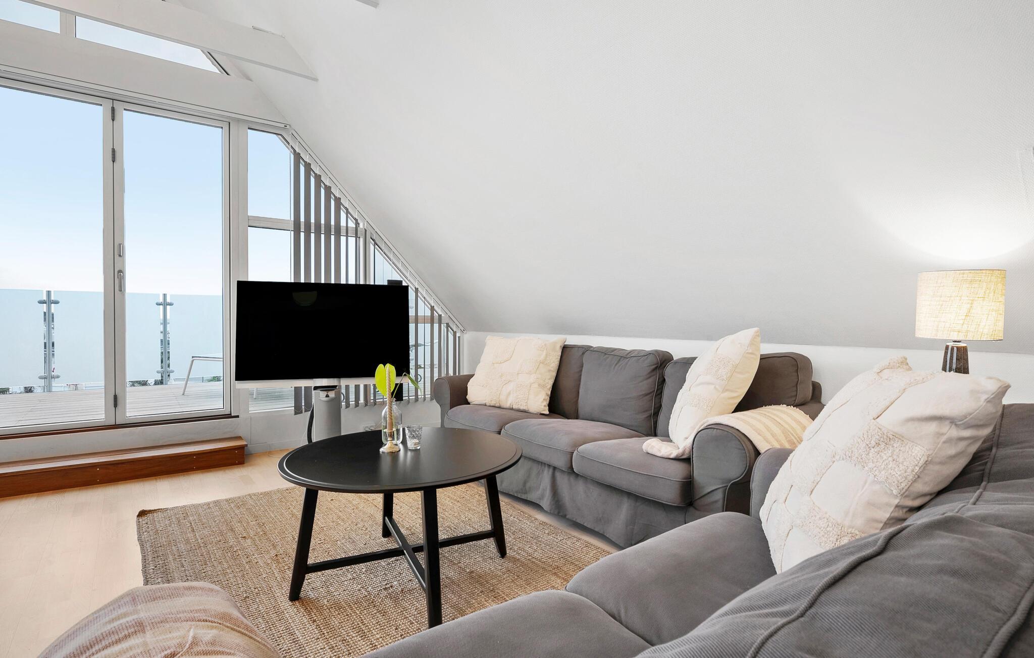 Skøn ferielejlighed i Karrebæksminde med panoramaudsigt til strand og lystbådehavn, tæt på restauranter og shopping.