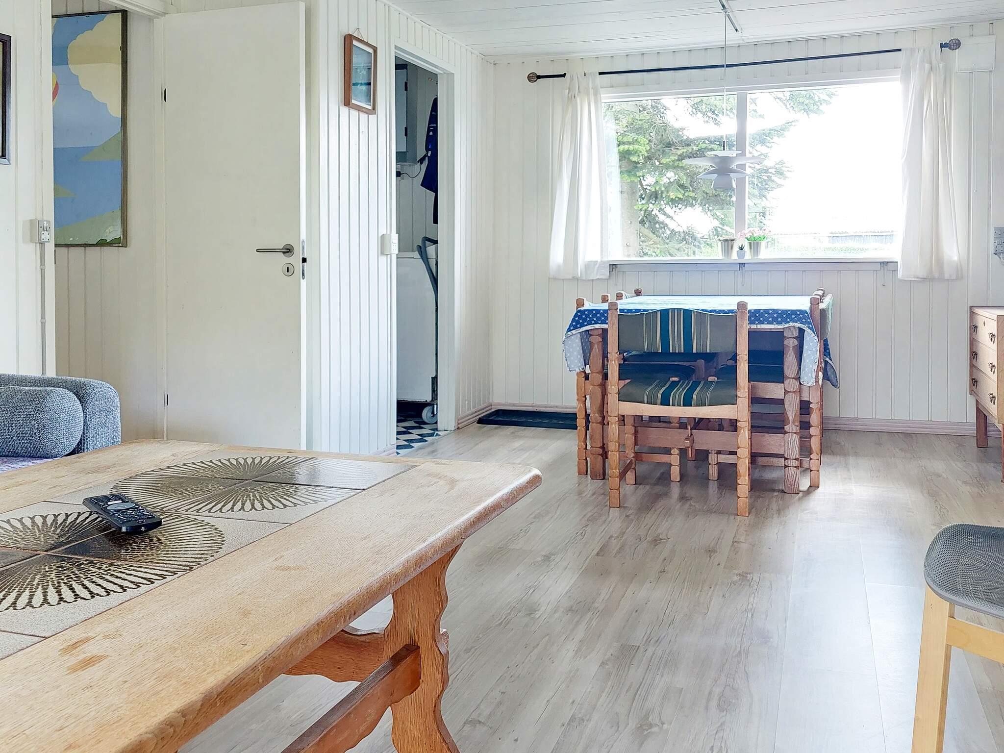 Indvendigt rummer huset en entré, der fører til et åbent køkken, som igen forbinder to kombinerede opholds- og soveområder. Køkkenet er fuldt udstyret til selvforplejning, herunder et køleskab, fryser, komfur/ovn og en lille vaskemaskine, så gæsterne nemt kan tilberede måltider under deres ophold. De to soveværelser er indrettet med dobbeltsenge, og det ene har også en enkeltseng, hvilket giver fleksible sovemuligheder for familier eller små grupper. Badeværelset er udstyret med håndvask, toilet og bruser, som tilbyder alle de praktiske faciliteter, der er nødvendige for et behageligt ophold.