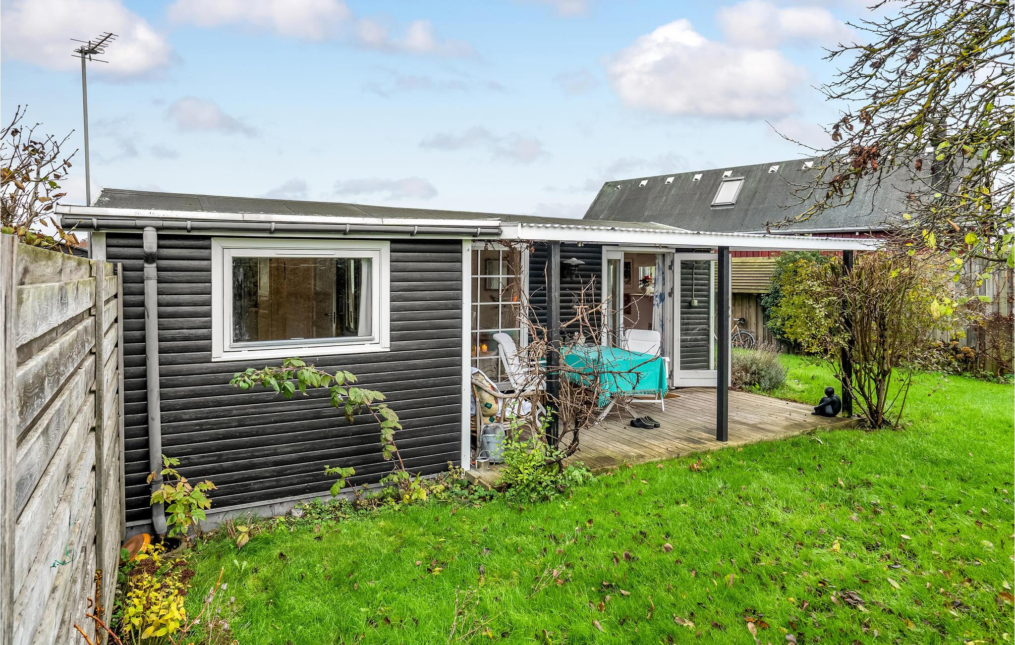 Hyggeligt sommerhus nær Karrebæksminde strand med overdækket terrasse og privat have, perfekt til afslapning ved vandet.