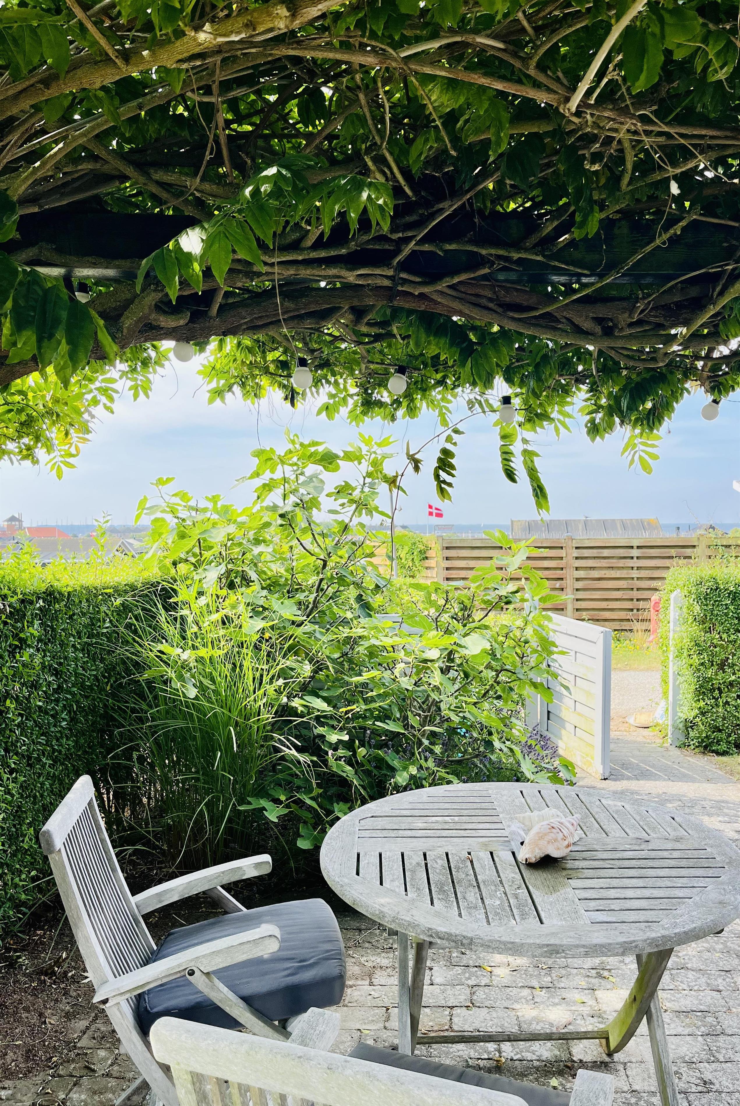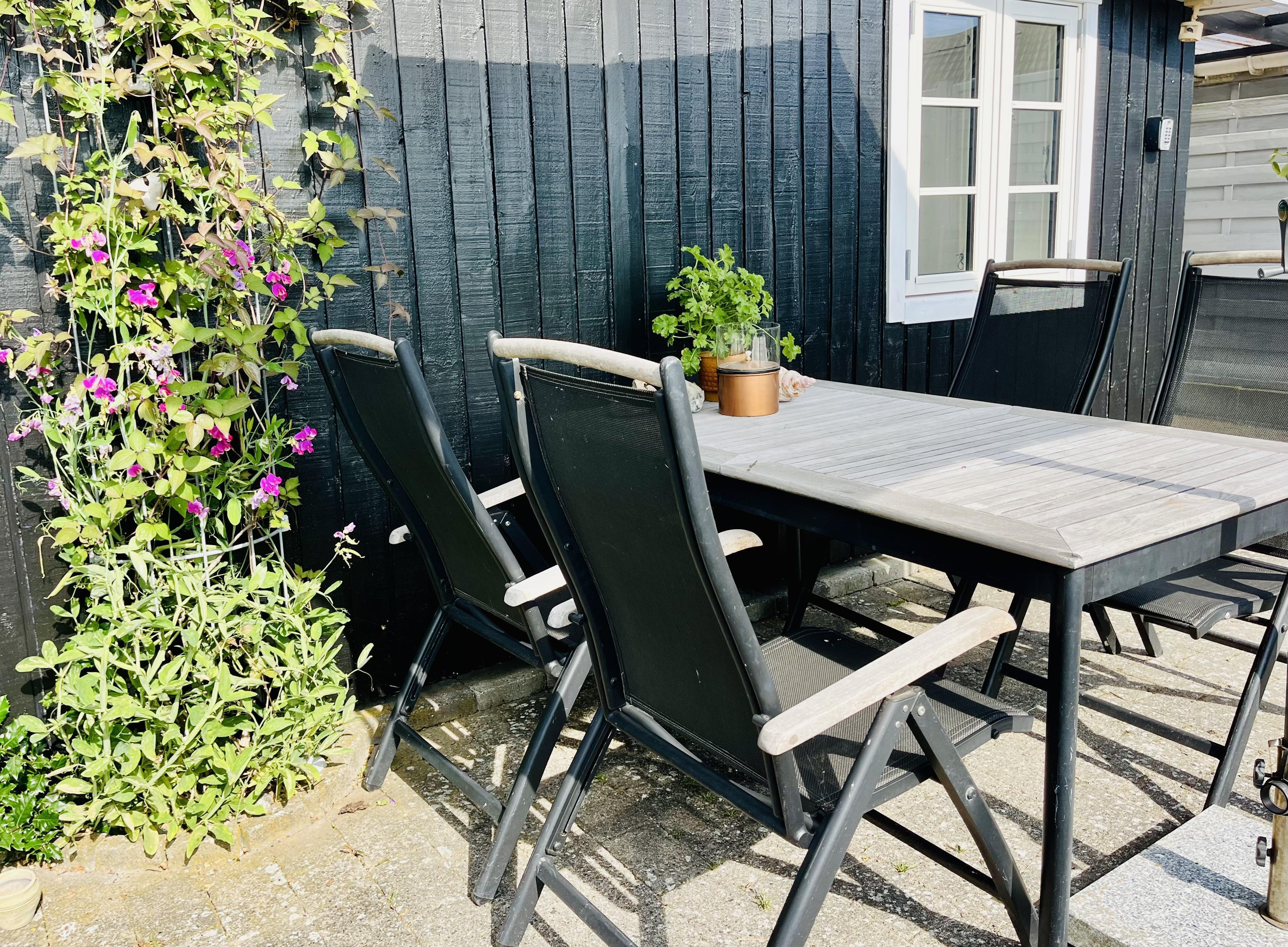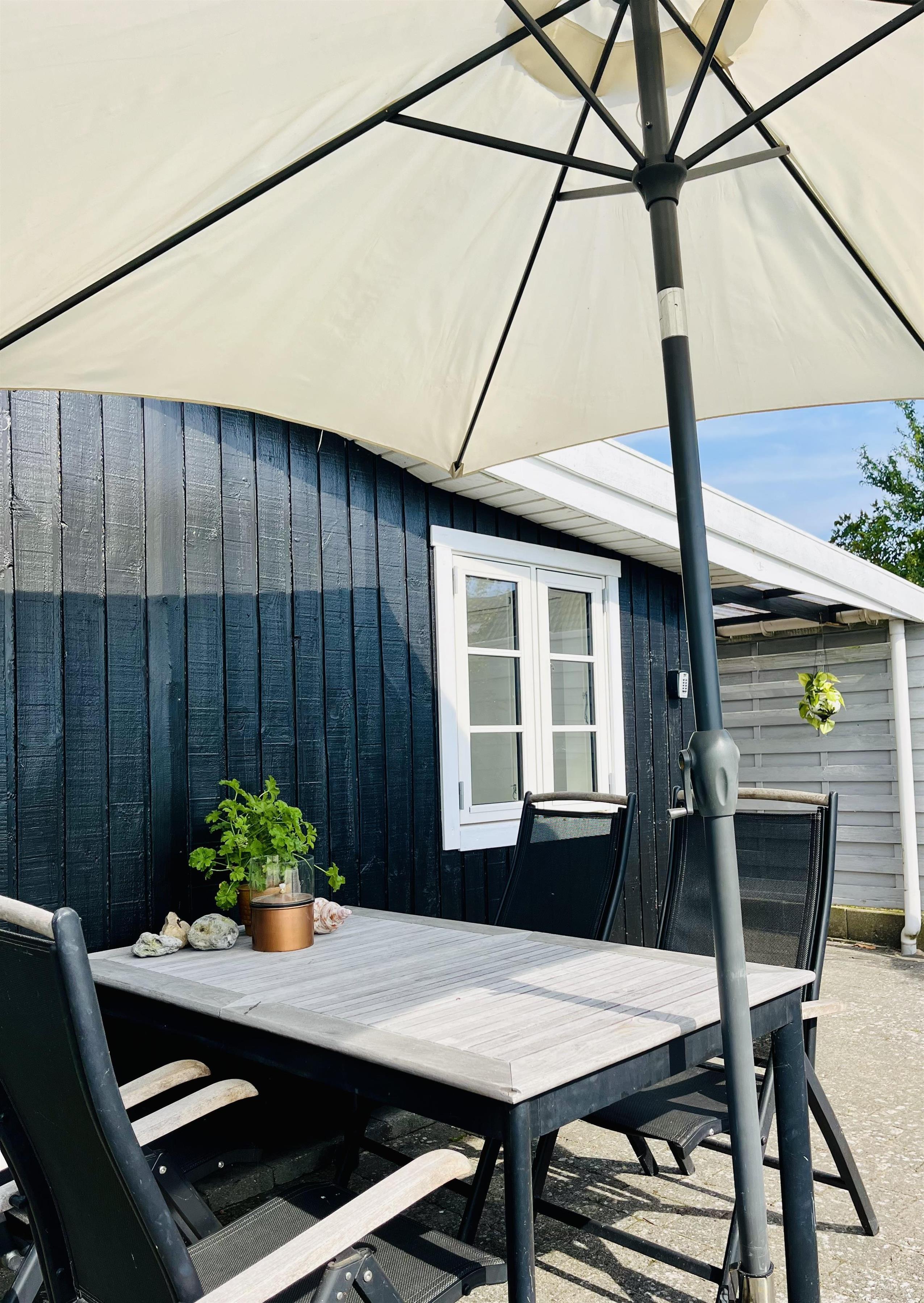 Udenfor er der både en åben og en overdækket terrasse og en lille have med havemøbler og grill. Grunden er indhegnet.
