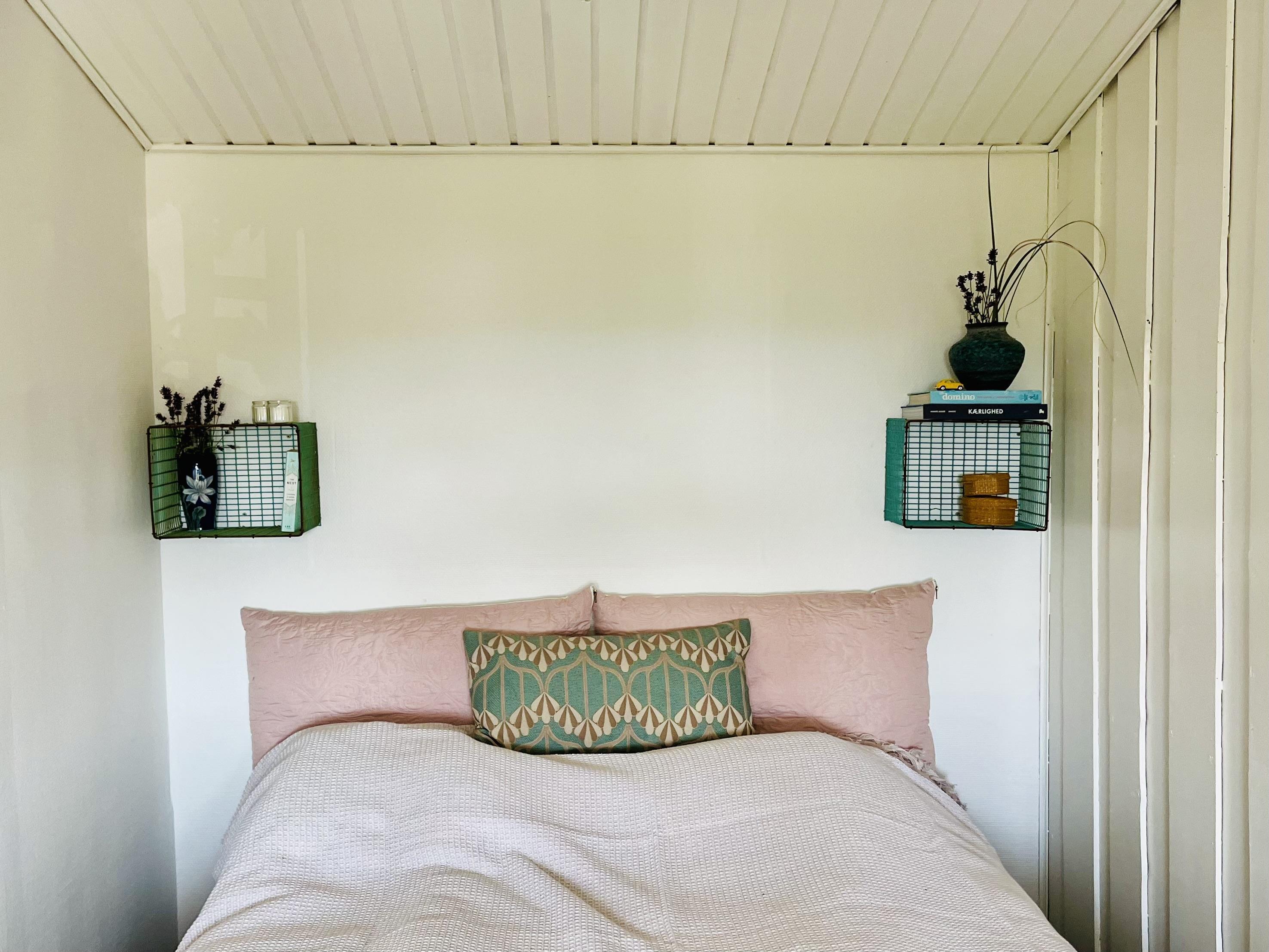 Her er to soveværelser med gode dobbeltsenge, og her er også en barneseng til et lille barn. Badeværelset er indrettet med brusebad.