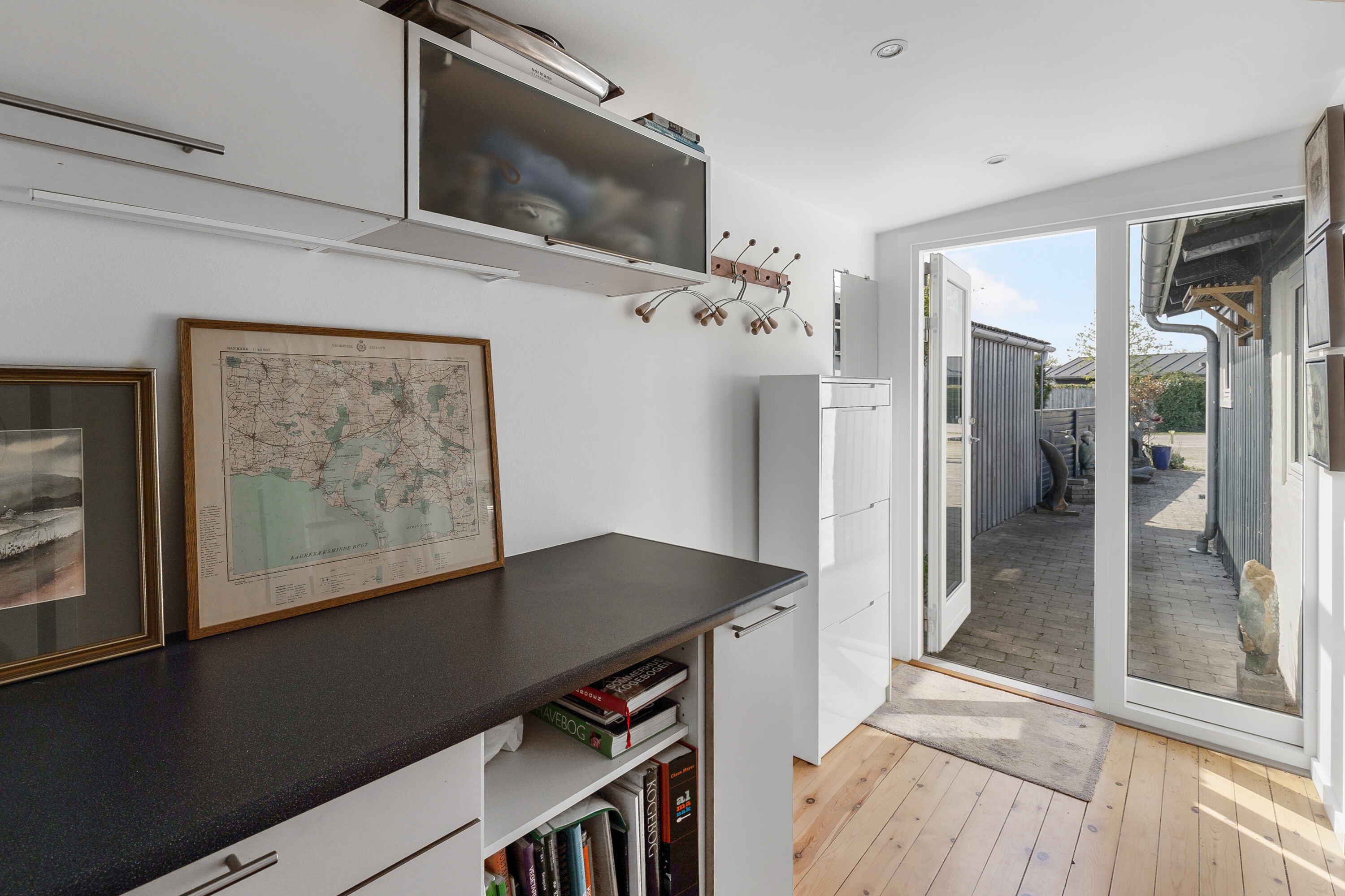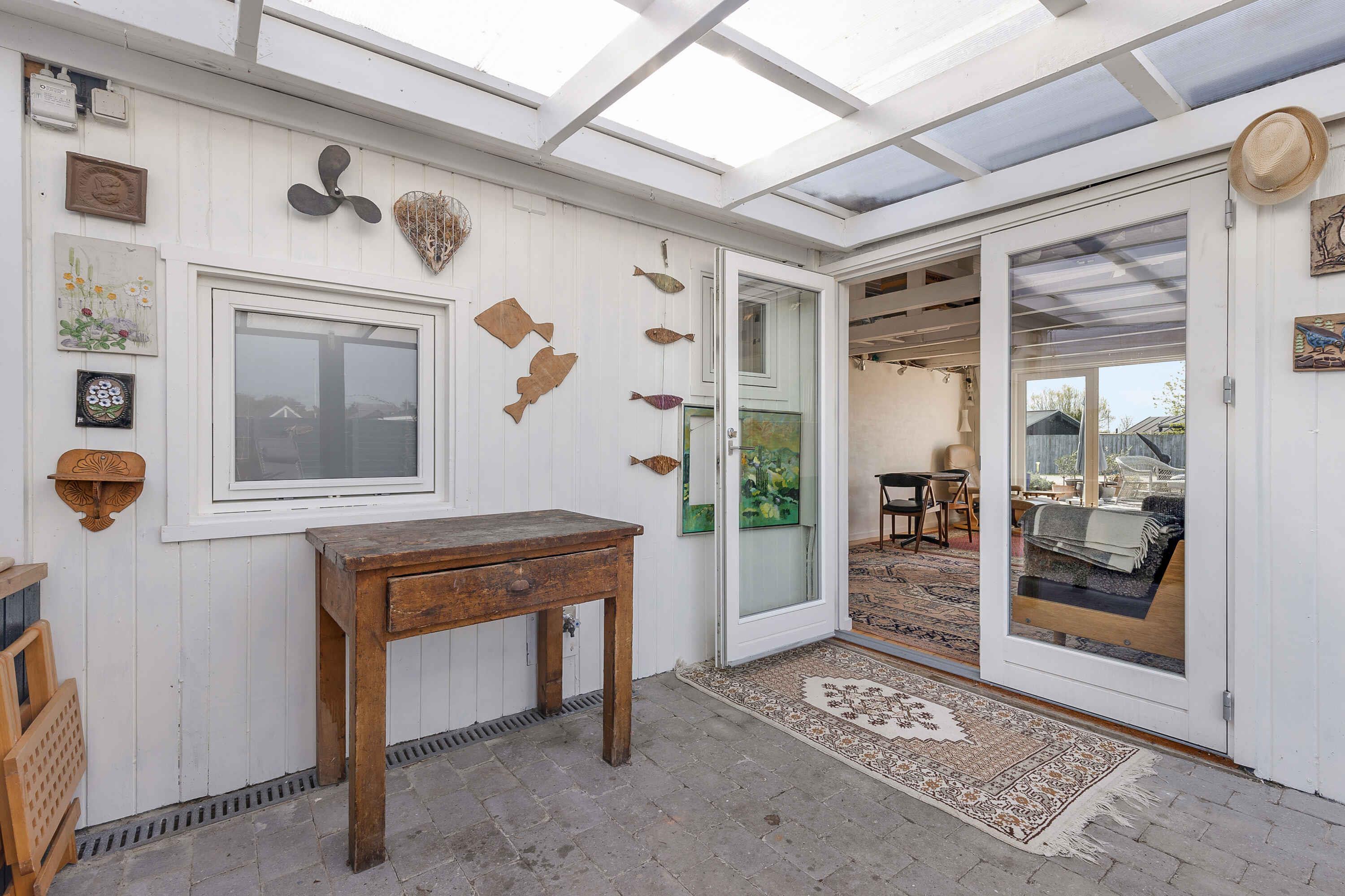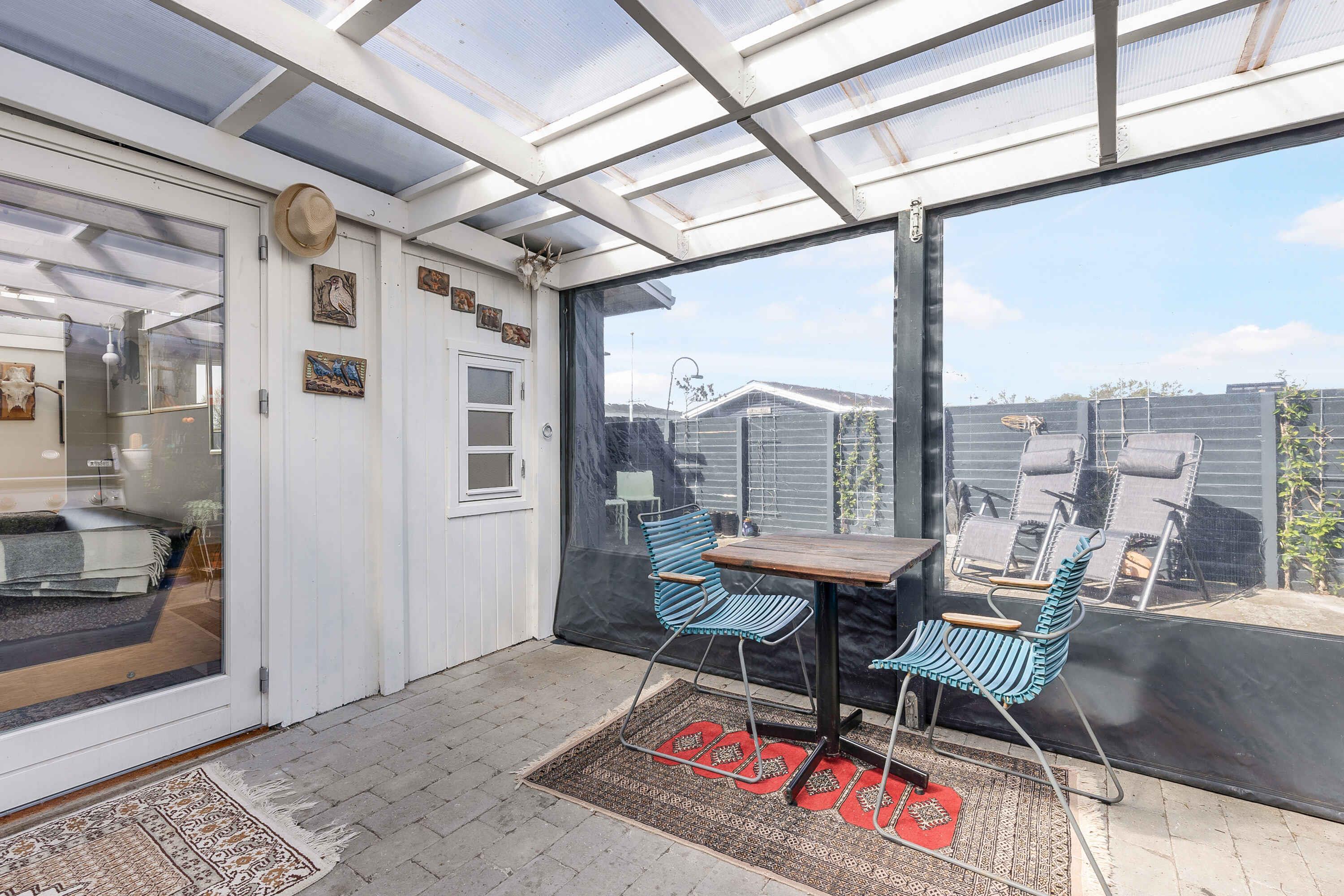 Sommerhuset er smukt og hyggeligt. Når du ankommer til huset, bliver du mødt af kunst og skulpture - der er i alt 25 stykker stenkunst. Det næste der møder dig er at huset ligger på en hjørnegrund med udsigt til en lille sø og med udsigt til en stille vej, med livlig trafik af badegæster enten på vej til stranden eller hjem fra den. Huset er lyst og venligt, og der er hyggehjørner og liggestole, en lukket og privat terrasse og inde- og udekøkken. Boligen er indrettet med to soveværelser med en dobbeltseng i hver. Derudover findes en 5. soveplads på stuens sovesofa. Derfor er der plads til i alt 5 personer. Det indendørs køkken er forsynet med moderne hvidevare og udstyr til den daglige madlavning. Udekøkkenet er en grill og en nok, hvor det er hurtigt og nemt at tilberede sunde måltider. Badeværelset er nyrenoveret og med 60 liters varmvandsbeholder, så du løber ikke tør for det varme vandt. Varmekilderne er brændeovn og varmeblæser, som er let at indstille. Den private terrasse er delvist overdækket, og det er muligt at lukke den overdækkede terrasse helt af, hvis vejret er til den kolde side. Stranden ligge 300 meter fra huset - hvid og børnevenlig strand med en lille badebro. Dybden stiger meget langsom, så stranden er børnevenlig. Der er masser af plads og stranden breder sig over godt en kilometer. Der er 500 meter til nærmeste købmand, der har alle daglige varegrupper. På Enø er der en bager, en slagter og 3 fiskehandler. Der er meget streetfood, som kan variere igennem sæsonen. Der er en bro mellem Karrebæksminde og Enø - broen hedder Græshoppebroen. Der sejler en rutebåd "Friheden" mellem Næstved og Enø - en absolut skøn tur at tage i Susåkanalen. Ud over rutefart, er der flere fragtskibe, der passerer broen dagligt. Det er rigtigt hyggeligt. Der er 4 store lystbådehavne, hvor der er masser af liv og leben hele sæsonen. Obs, udlejes ikke til erhversmæssigt brug.