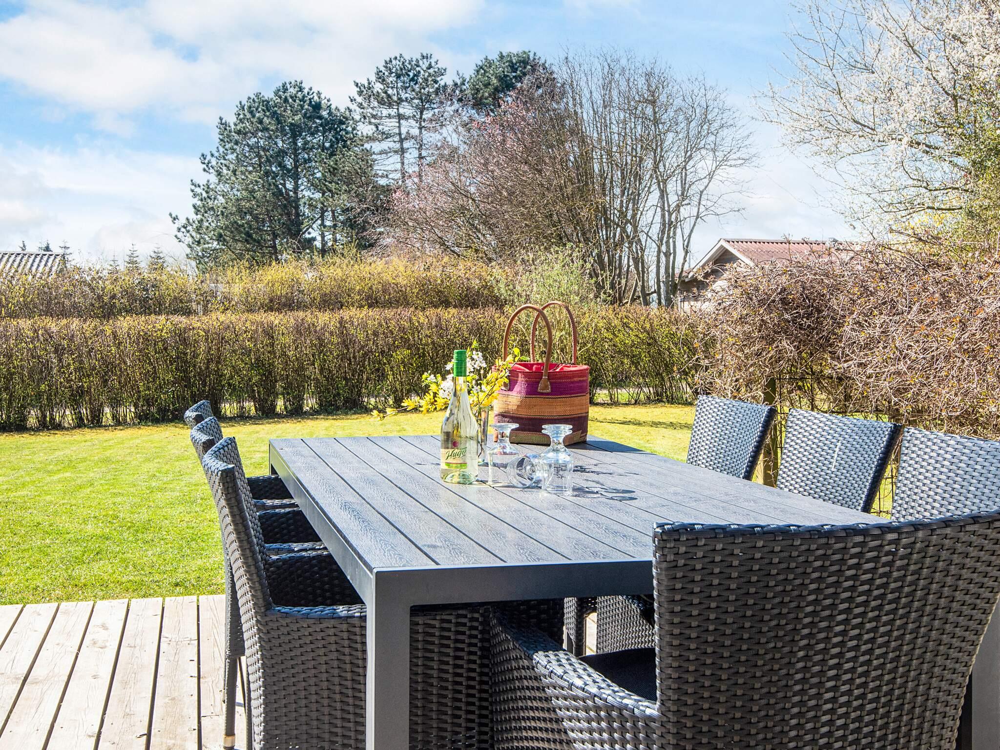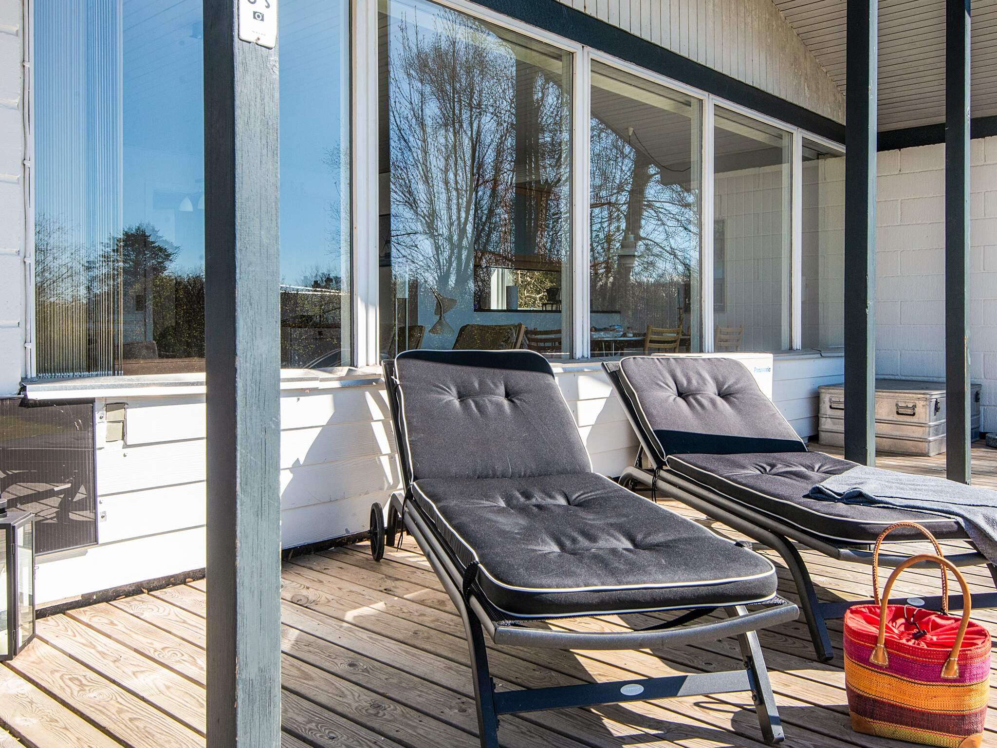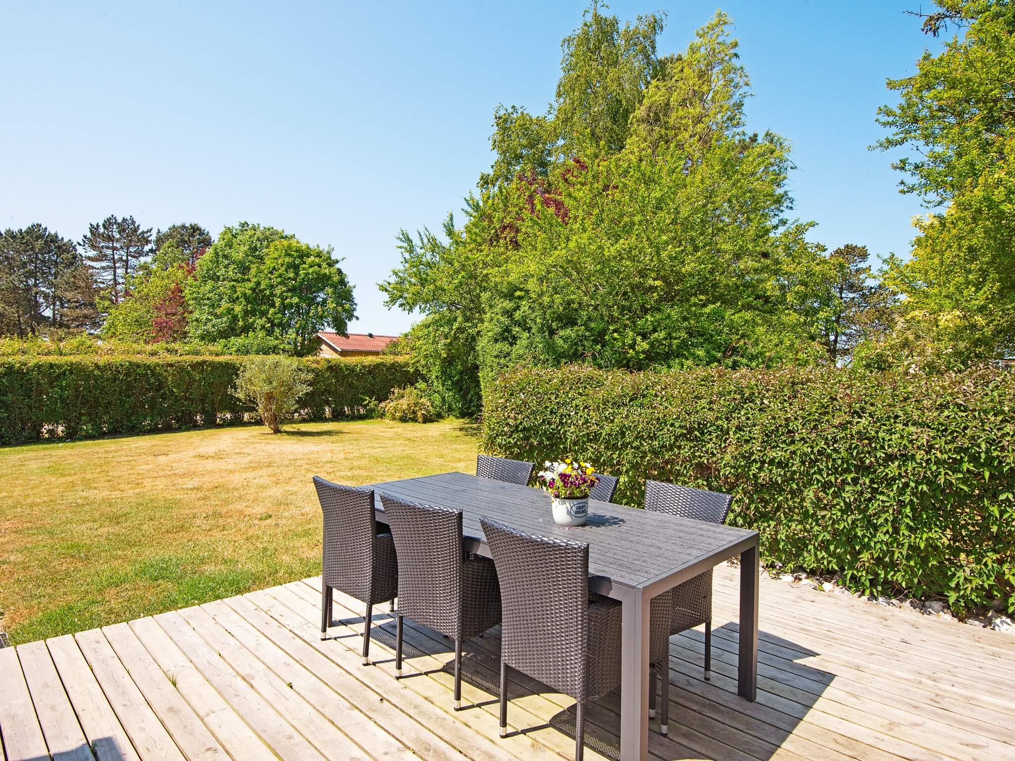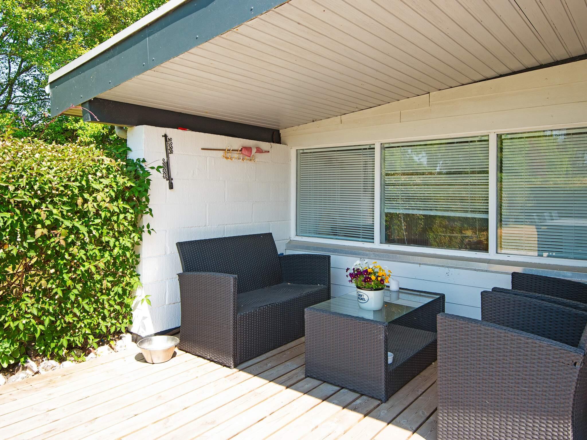 Fra opholdsrummet er der direkte adgang til en stor, delvist overdækket træterrasse med havemøbler og grill. Haven giver god plads til leg og udendørs aktiviteter.