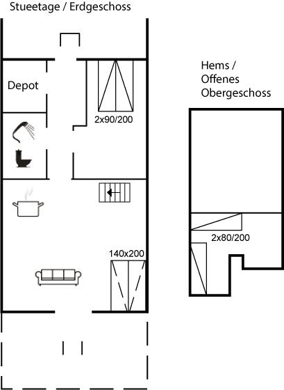 Der er i alt 1 soveværelse. Sovepladserne fordeler sig på: 2 sovepladser i elevationssenge. 2 sovepladser i sovesofa (dobbelt). 2 sovepladser på madrasser. 2 af disse sovepladser befinder sig på husets hems. Derudover er der 1 stk. barneseng.