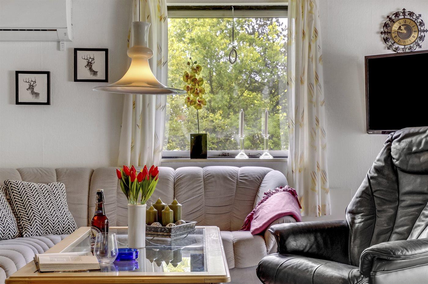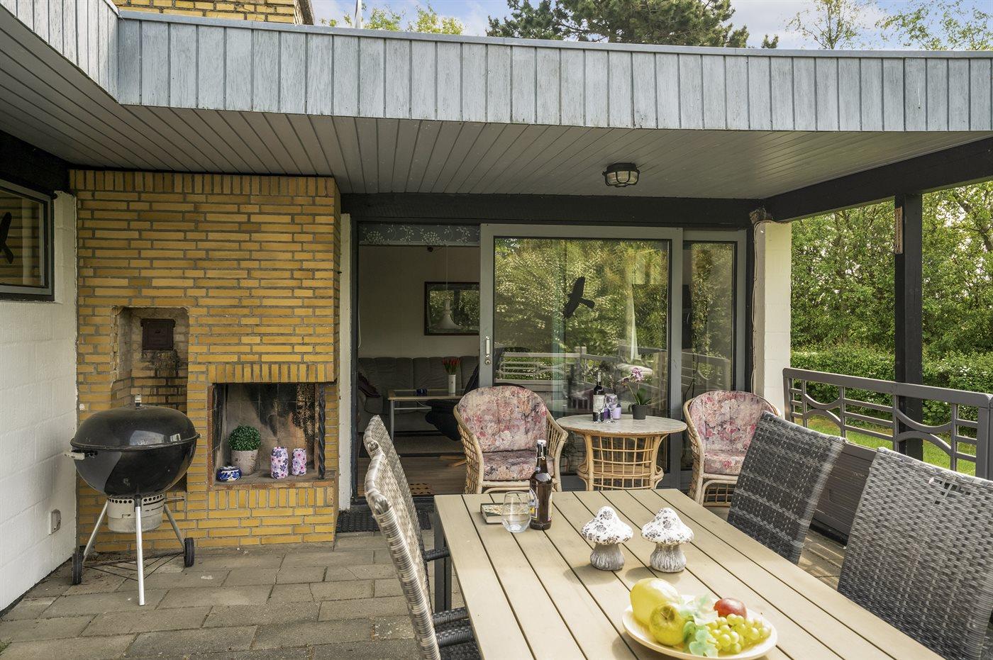 Sommerhuset, som har en stor og delvis overdækket terrasse, ligger på et frodigt grundstykke omgivet at høje træer og buske.
