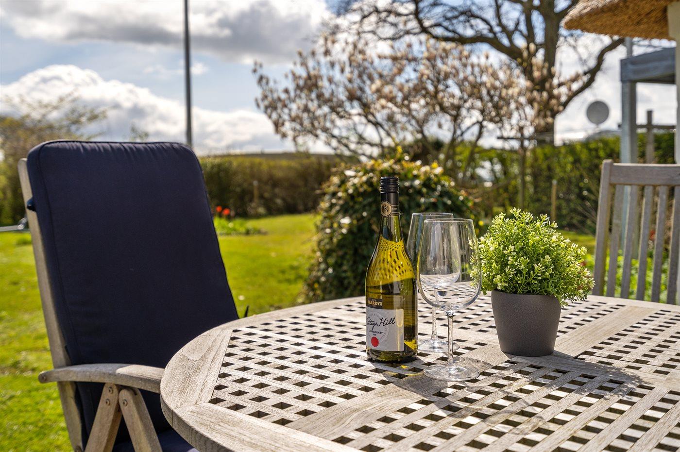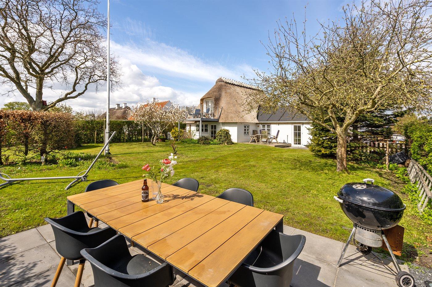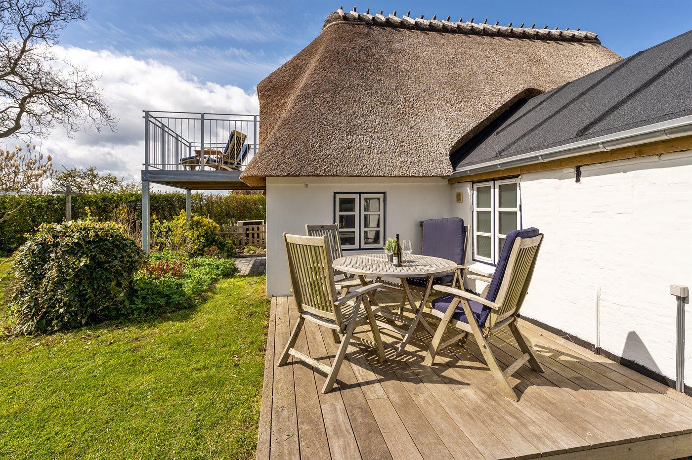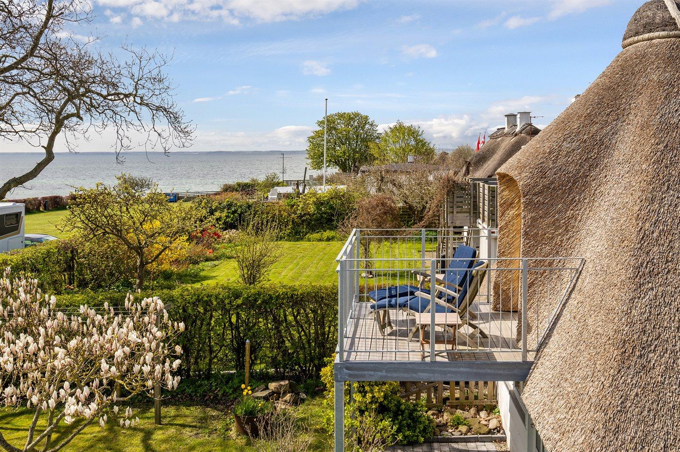 Hyggeligt stråtækt sommerhus på Kegnæs med havudsigt og dejlig lukket have tæt på vandet.