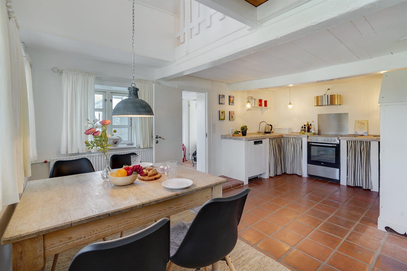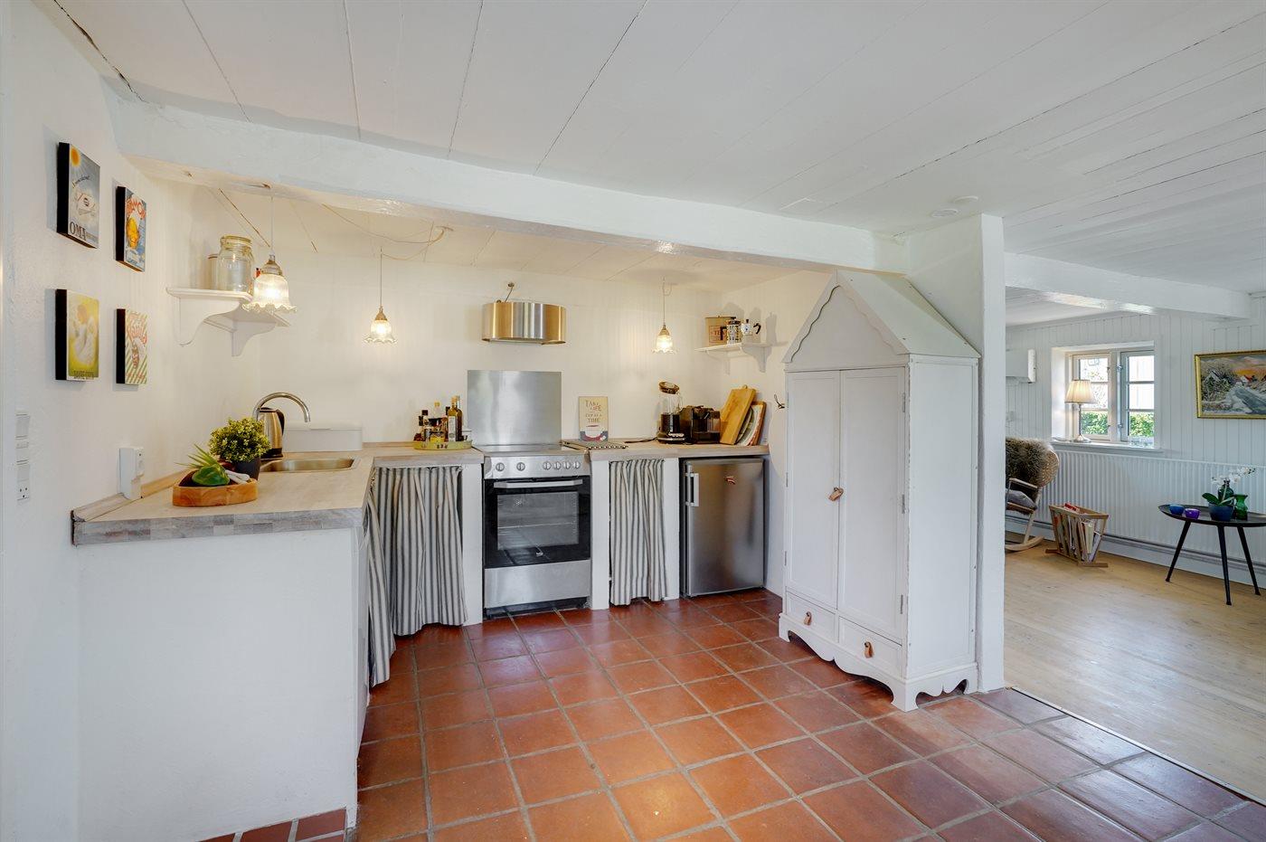 Køkkenet er udstyret med 1 køleskab. Der er 4 keramiske kogeplader, varmluftovn samt opvaskemaskine.