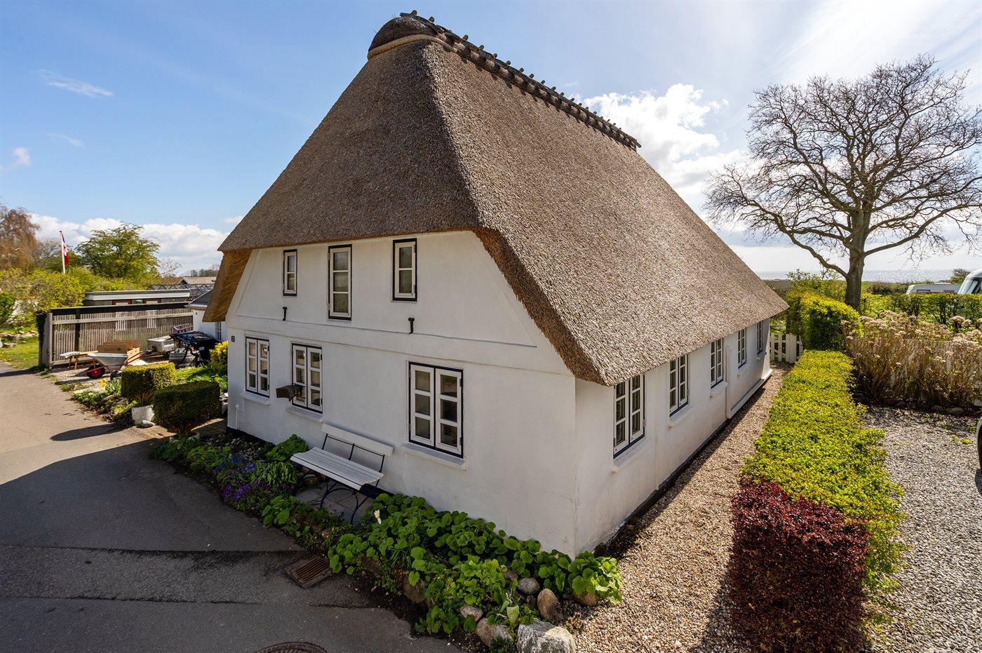 Et fint beliggende stråtækt sommerhus med sprossede vinduer og udsigt til vandet samt udgang til en dejlig lukket have - en meget hyggelig lille oase på Kegnæs.