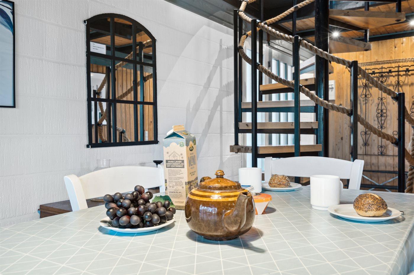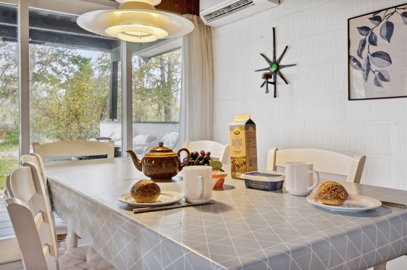 Køkkenet er udstyret med 1 køleskab. Der er 4 keramiske kogeplader, varmluftovn, mikrobølgeovn samt opvaskemaskine.