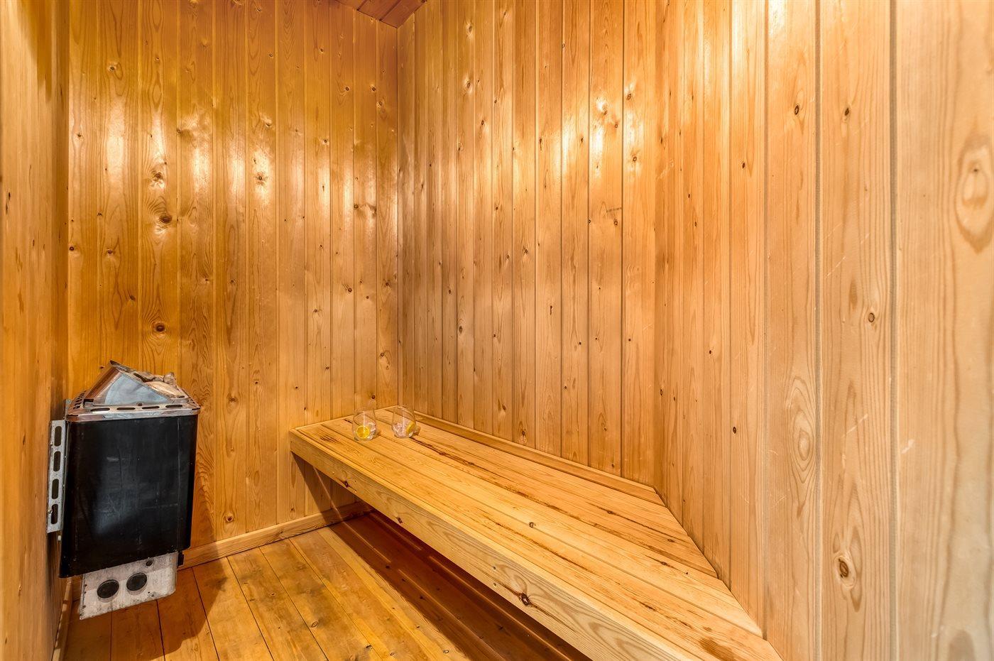 Der er 1 badeværelse med bruseniche og 2 toiletter, heraf 1 gæstetoilet I saunaen er der mulighed for afslapning.