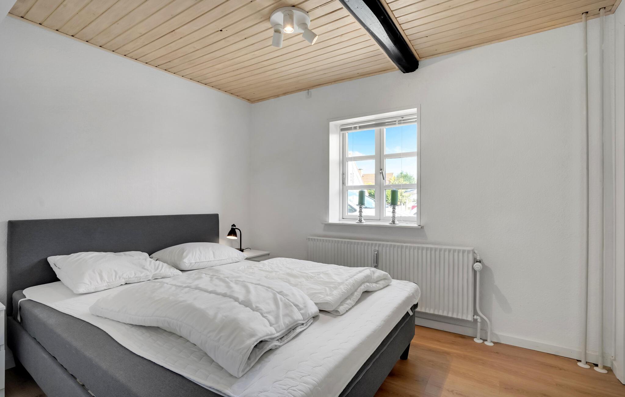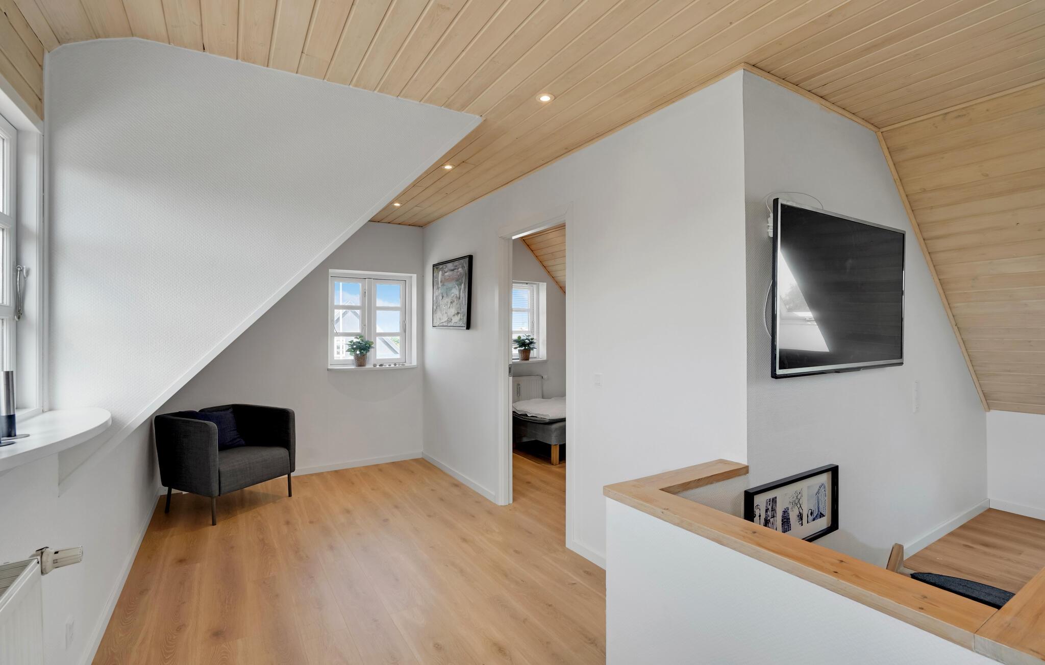 Glæd jer til afslappende ferier i dette familievenlige hus, som giver jer et vidunderligt grundlag for en vellykket ferie. Dette roligt beliggende feriehus er ideelt for alle, der ønsker at lade batterierne op tæt på naturen og kysten. Træd ind i den lyse, moderne møblerede lejlighed med rene linjer og et gennemtænkt rumkoncept. Slap af i den åbne opholdsstue med en komfortabel sofa og et stort tv under det lyse træloft. Udnyt det åbne, moderne køkken og find sammen omkring spisebordet til fælles måltider eller en spilleaften.