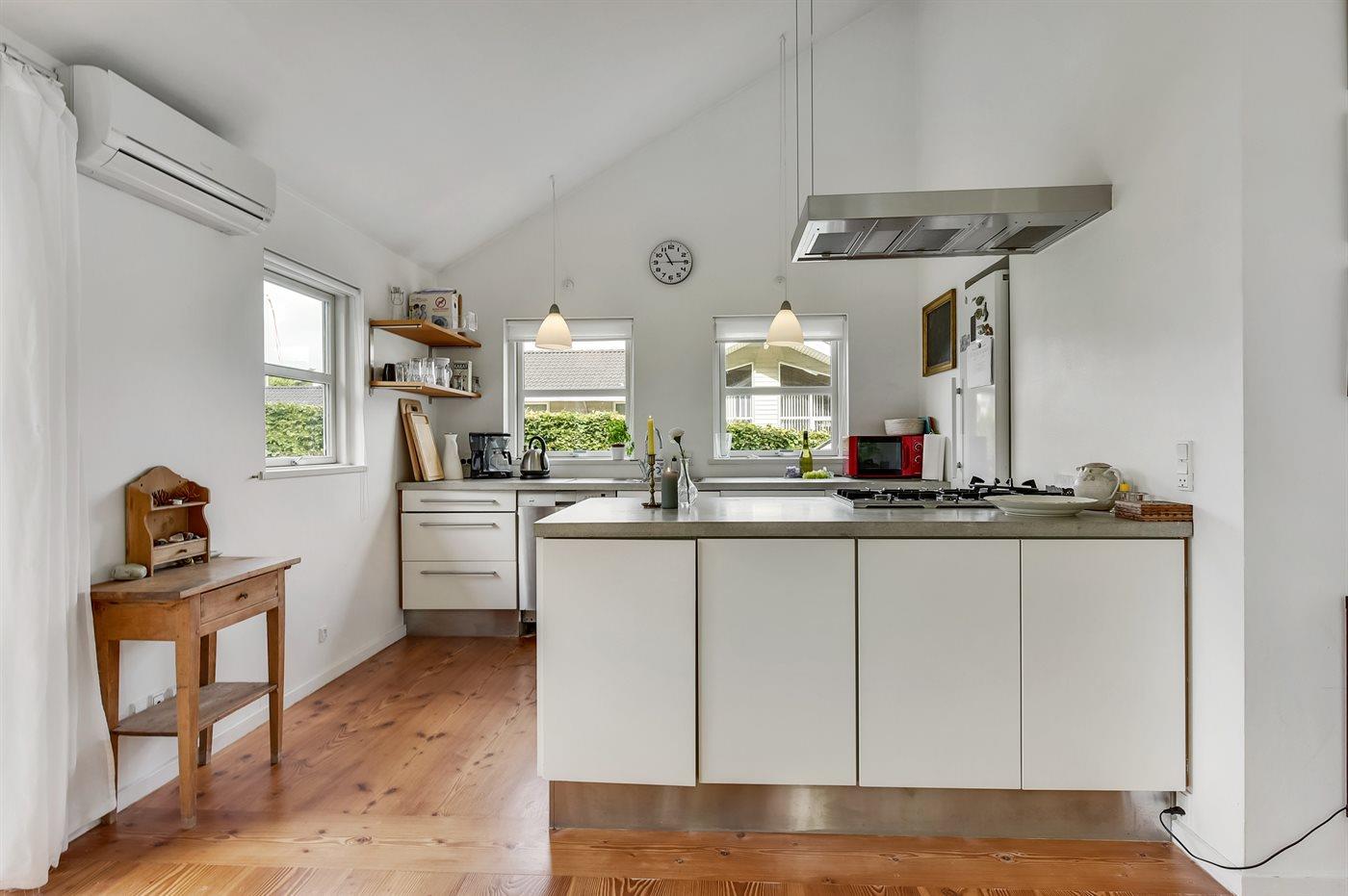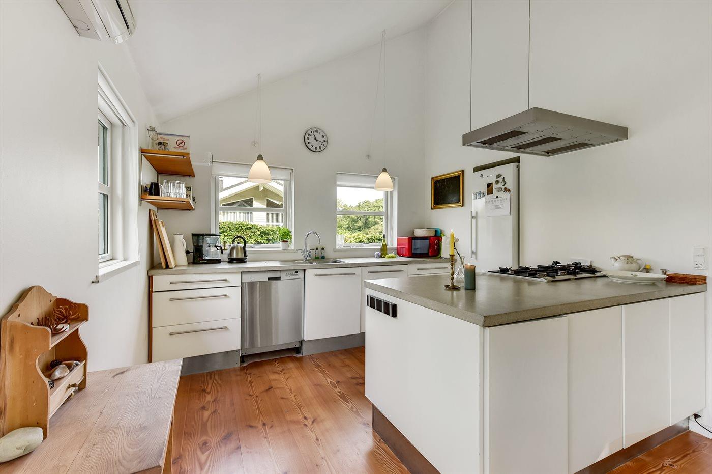 Køkkenet er udstyret med 1 køleskab. Der er 5 gasblus, bageovn samt opvaskemaskine.
