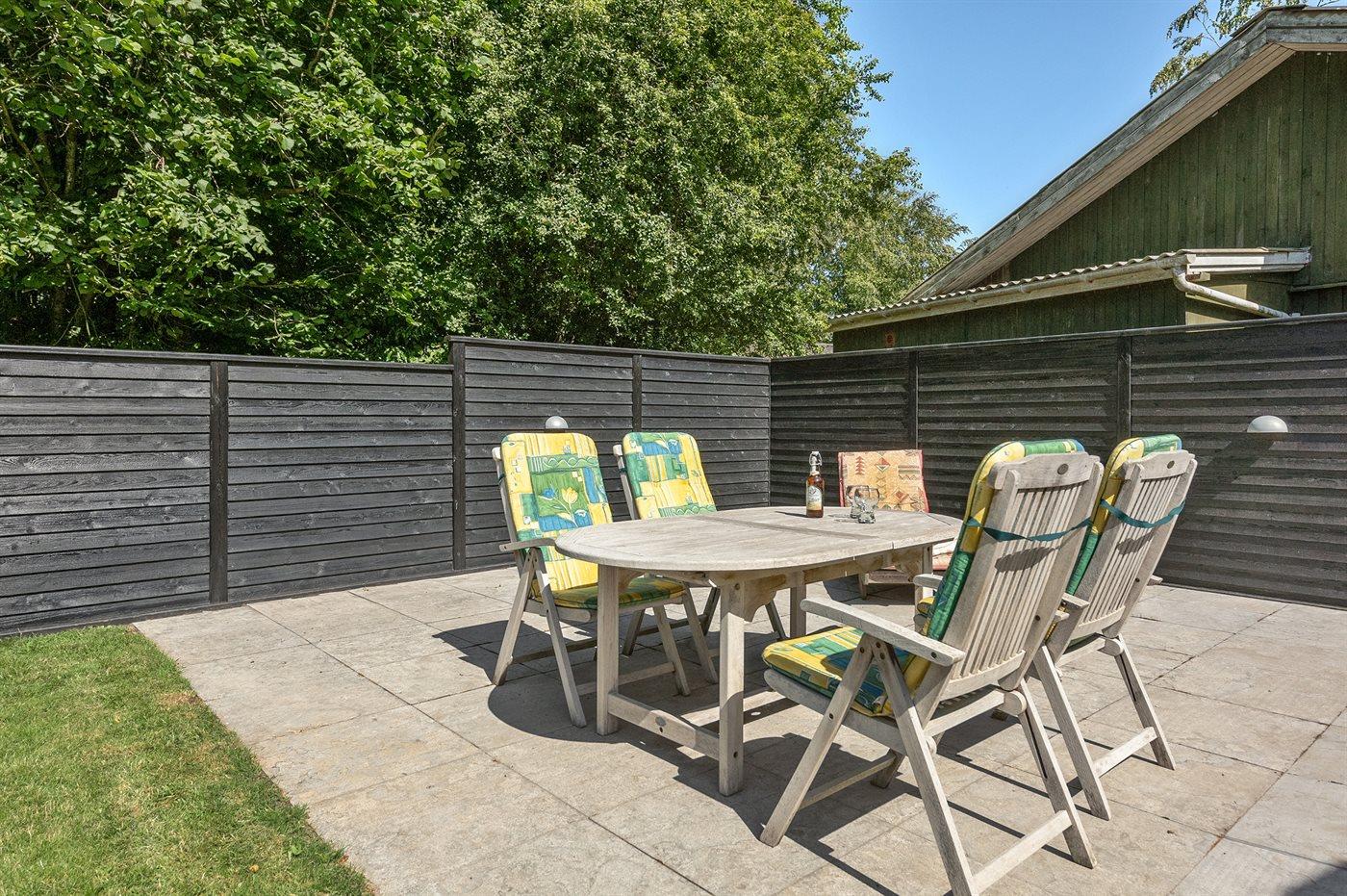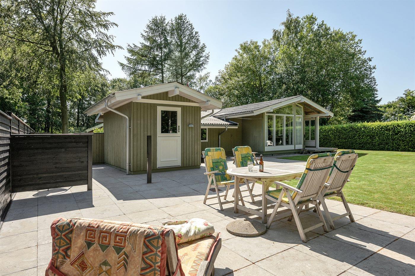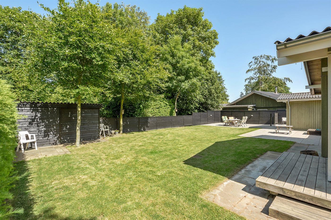 Ferieboligen er beliggende på en 824 m² stor havegrund. Der er 150 m til havet. Nærmeste forretning er beliggende i en afstand af 8000 m. Der er en golfbane i en afstand af 8000 m. Til ferieboligen hører 60 m² terrasseareal. Desuden er der 25 m² overdækket terrasse. Der er redskabsrum. Sandkasse. Parkering ved ferieboligen.