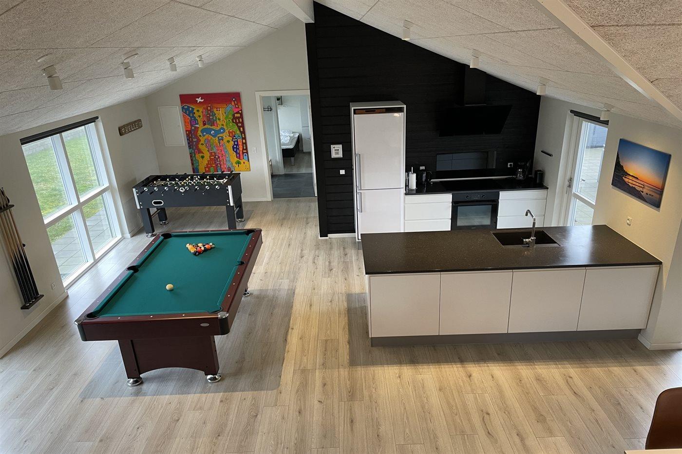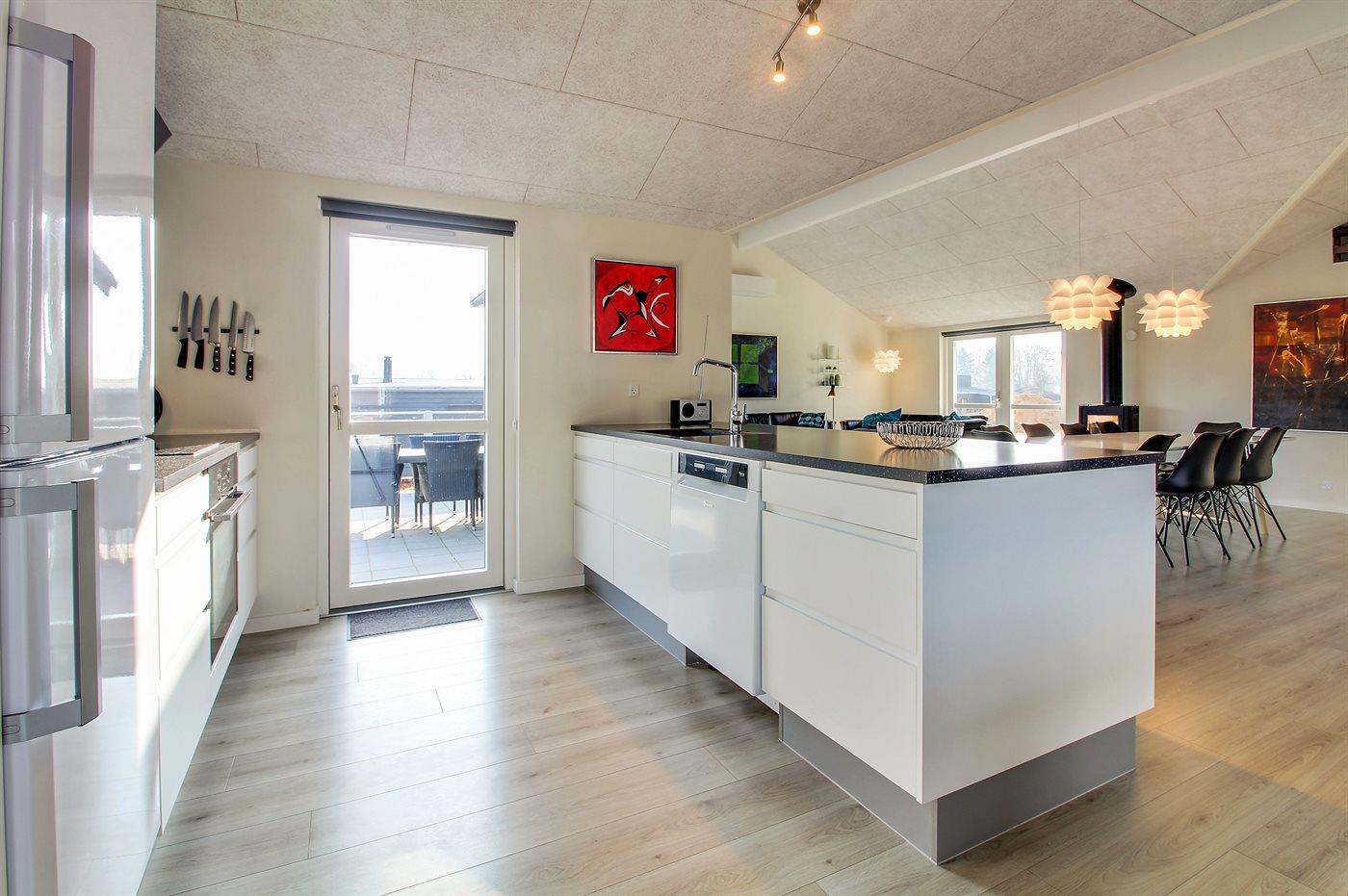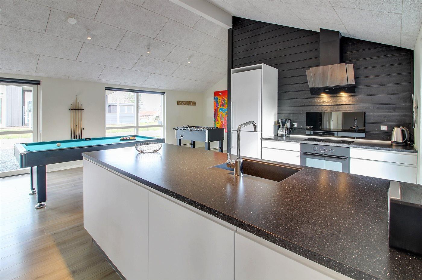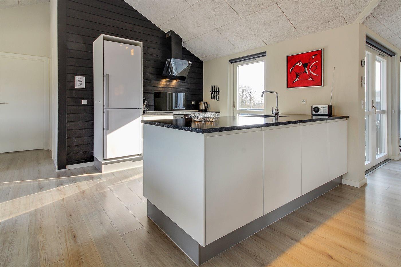 Køkkenet er udstyret med 1 køleskab. Der er 4 induktionskogeplader, varmluftovn, mikrobølgeovn samt opvaskemaskine.