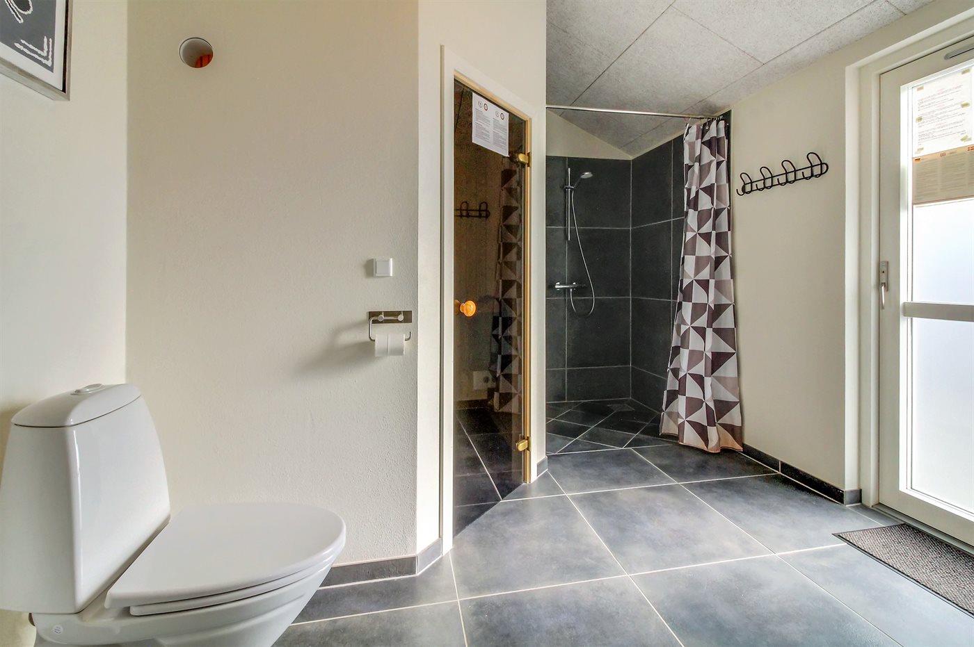 Der er 2 badeværelser med bruseniche og 2 toiletter. Der er gulvvarme på 2 badeværelser. I saunaen er der mulighed for afslapning.