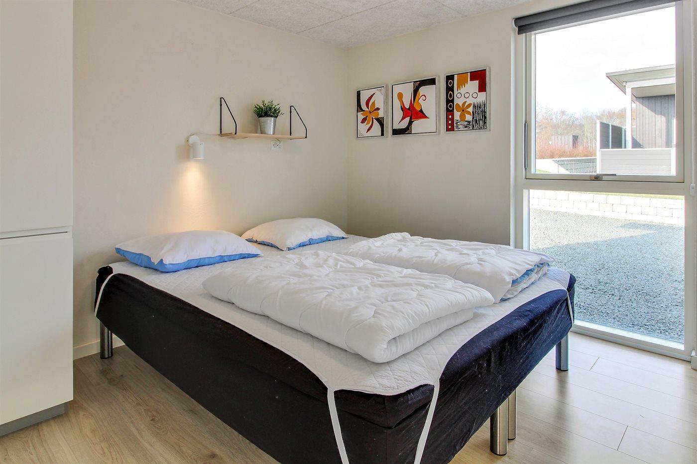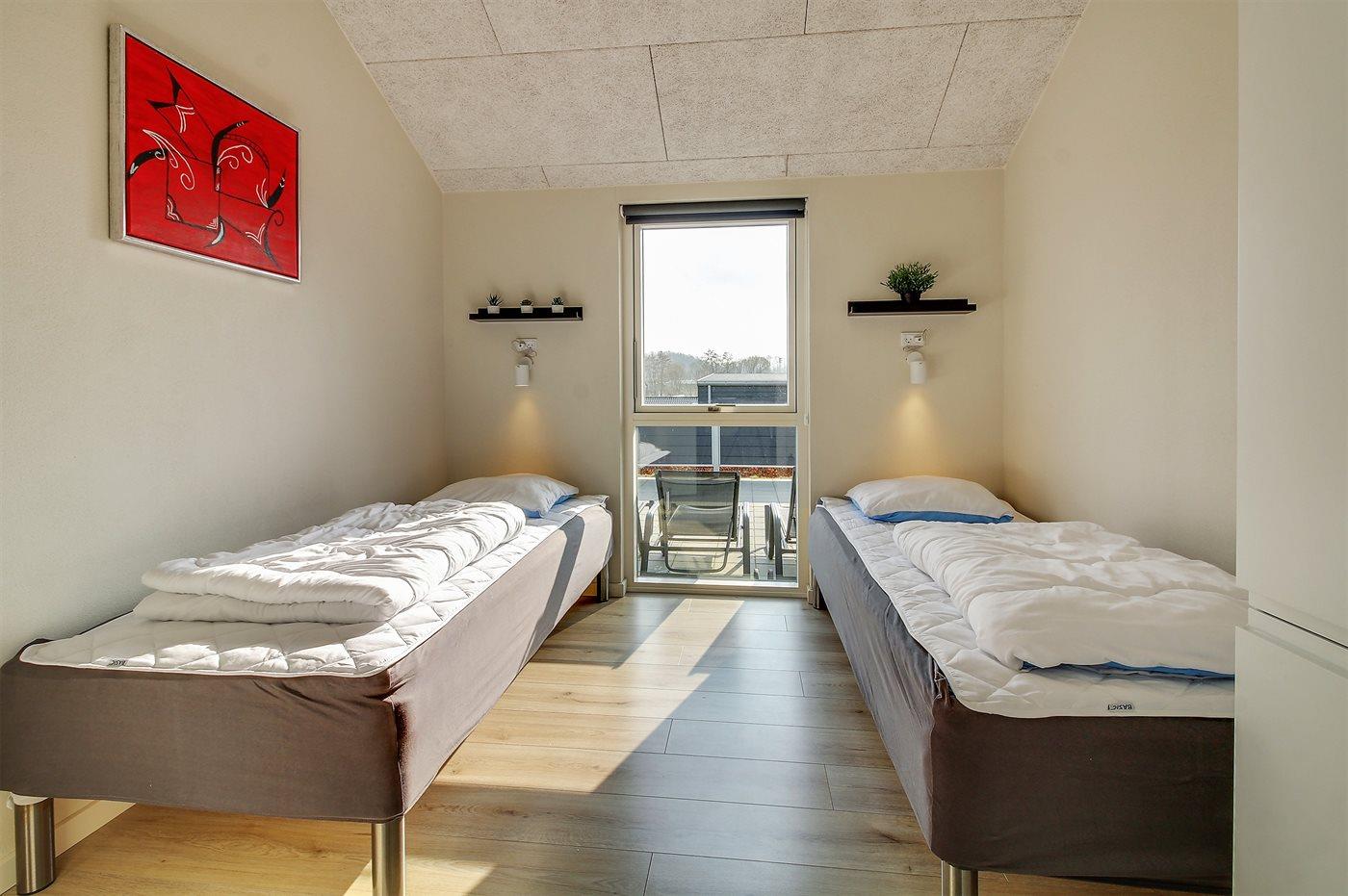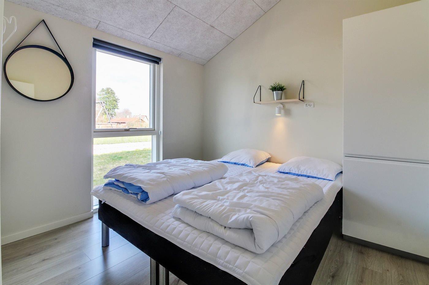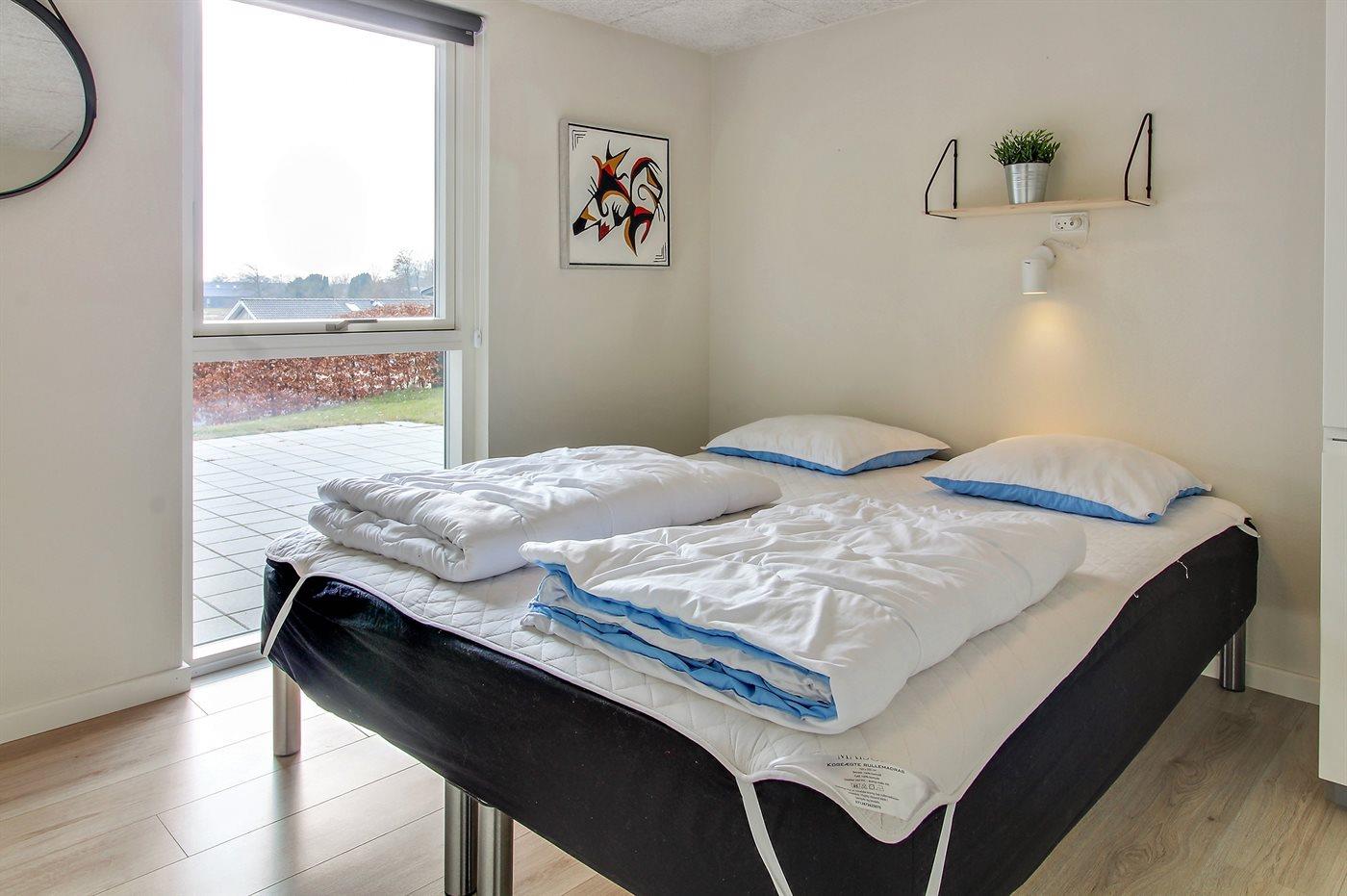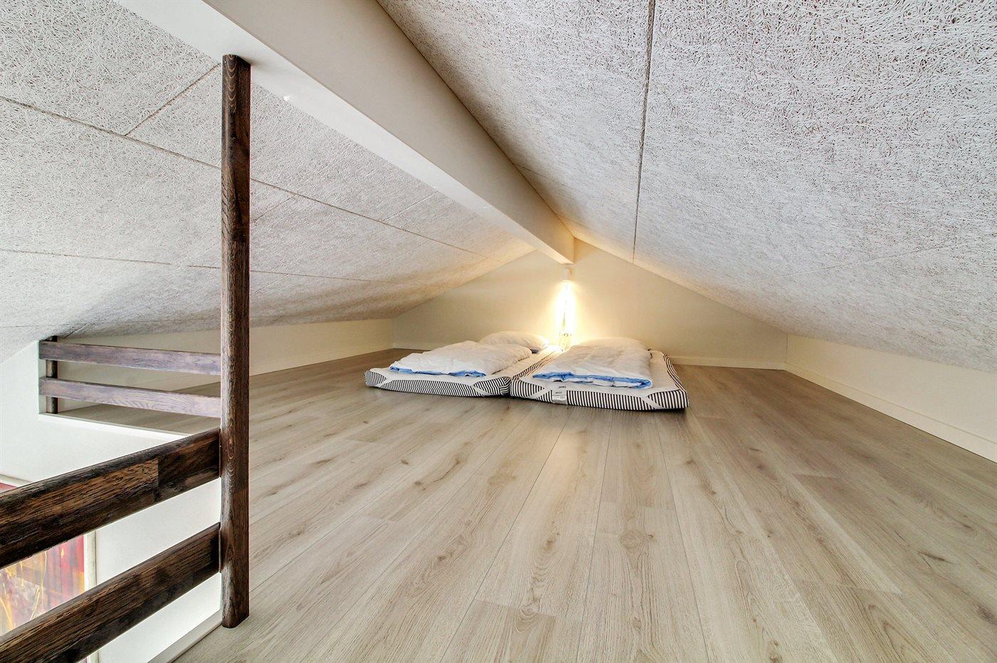 Der er i alt 4 soveværelser. Sovepladserne fordeler sig på: 6 sovepladser i dobbeltsenge. 2 sovepladser i enkeltsenge. 2 sovepladser på madrasser. 2 af disse sovepladser befinder sig på husets hems. Derudover er der 1 stk. barneseng.