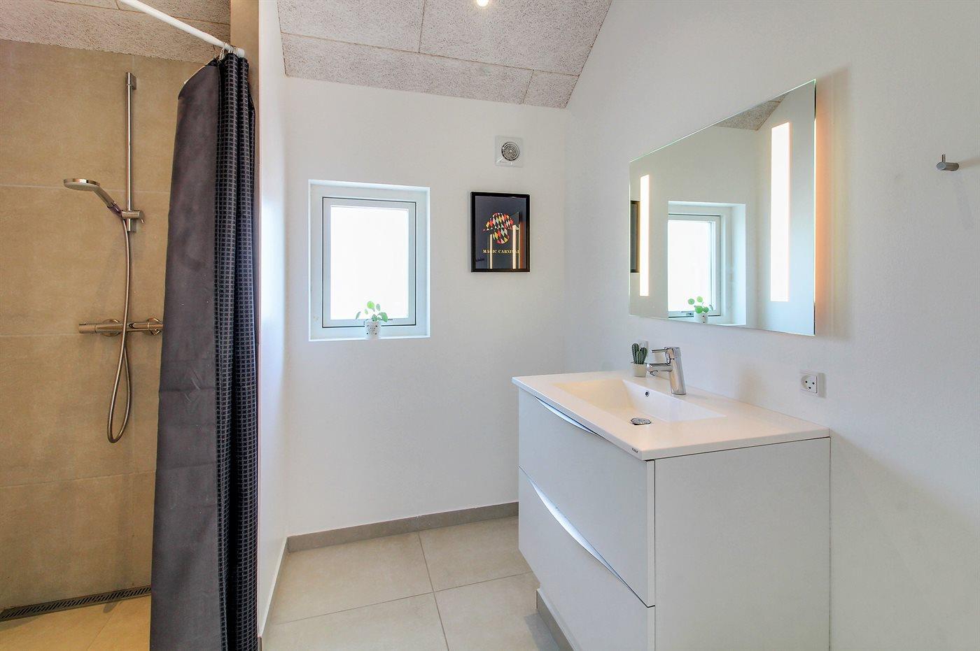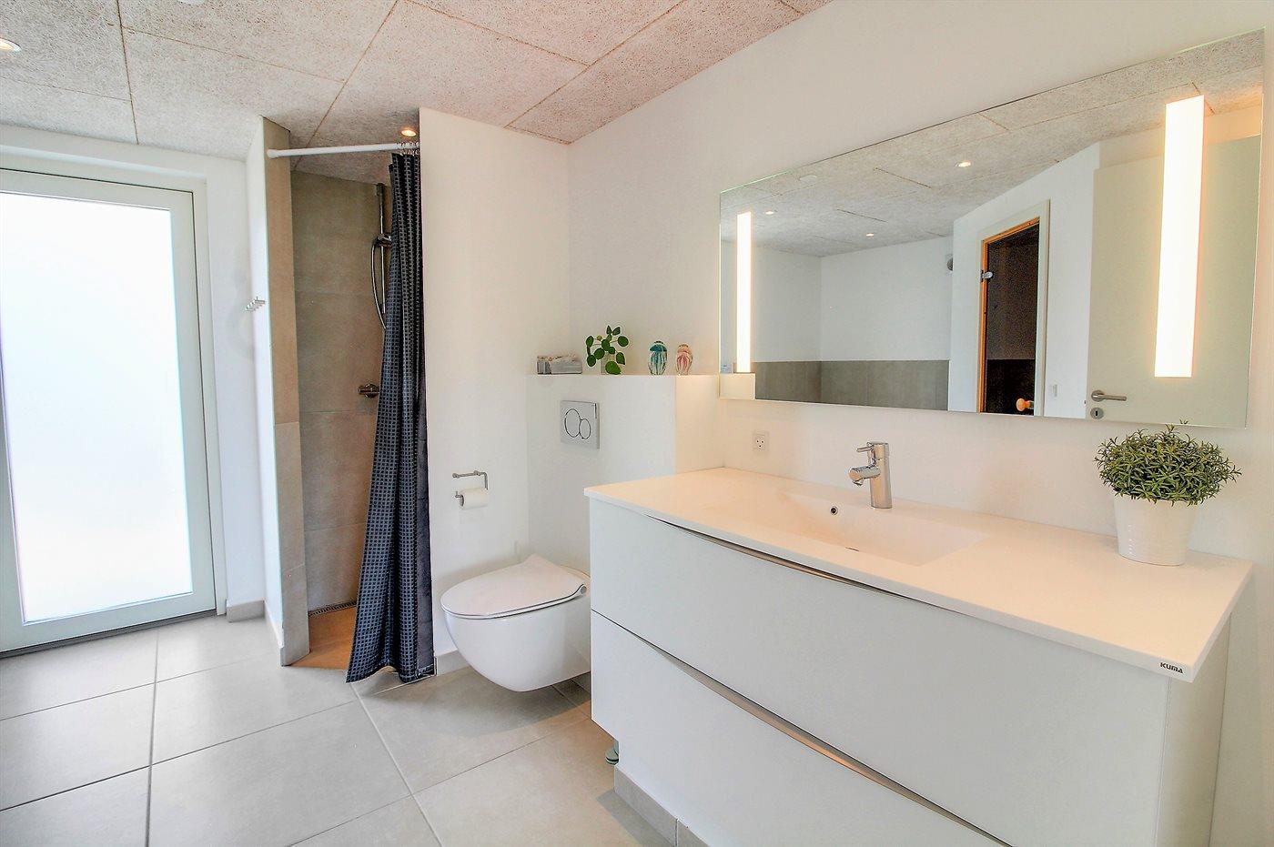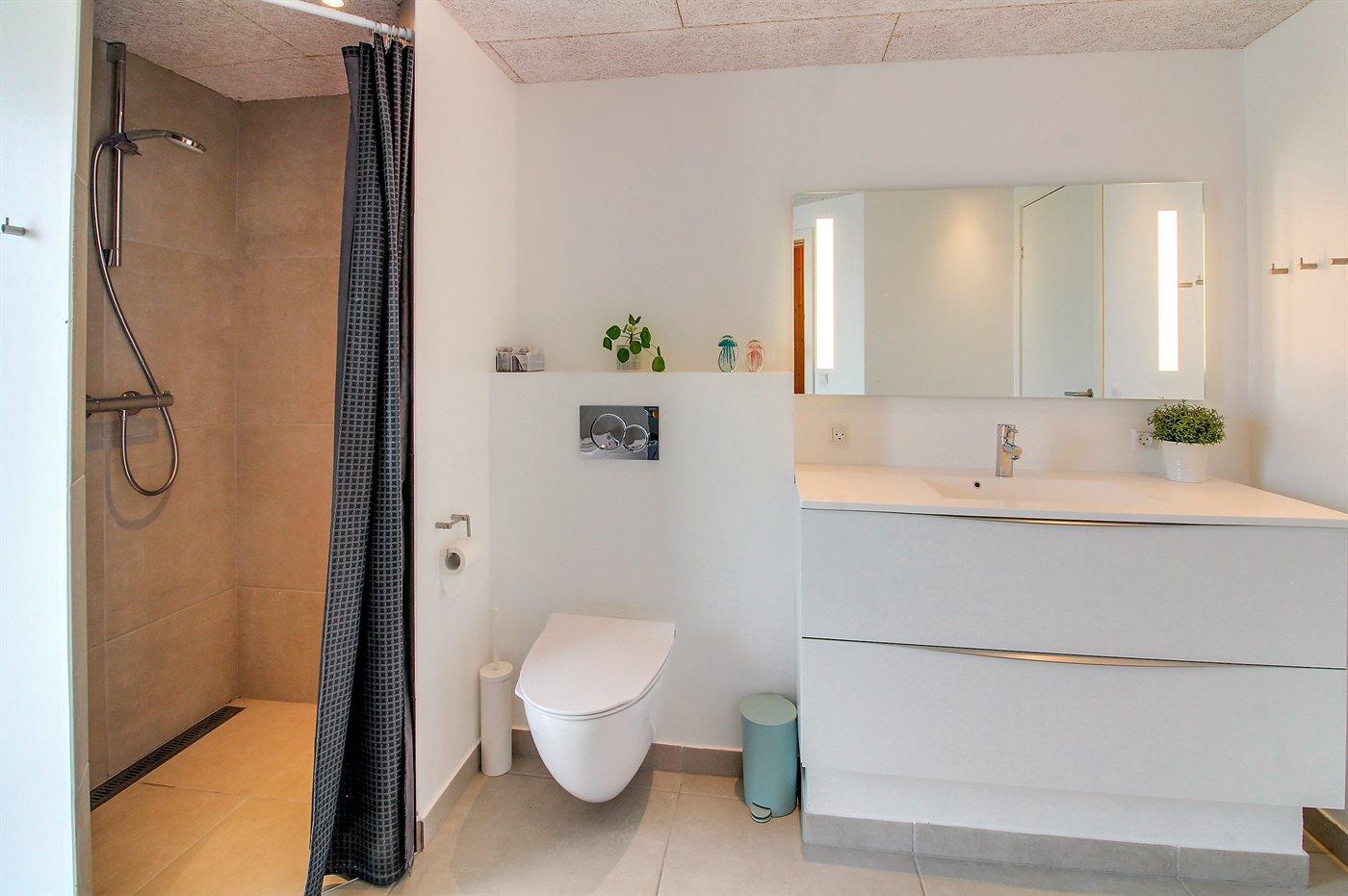 Der er 2 badeværelser med bruseniche og 2 toiletter. Der er gulvvarme på 2 badeværelser. I saunaen er der mulighed for afslapning.