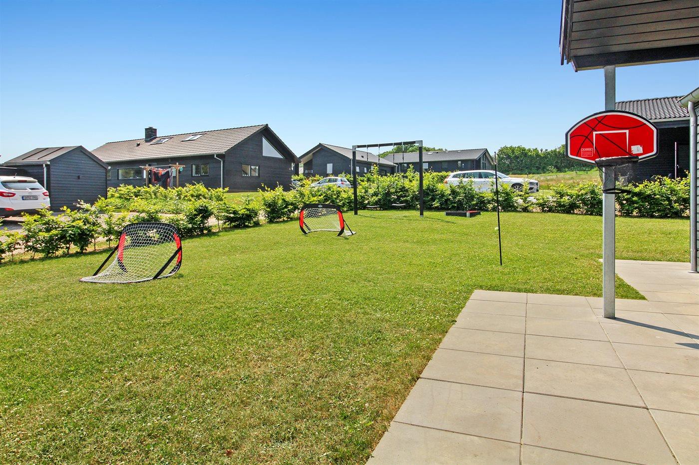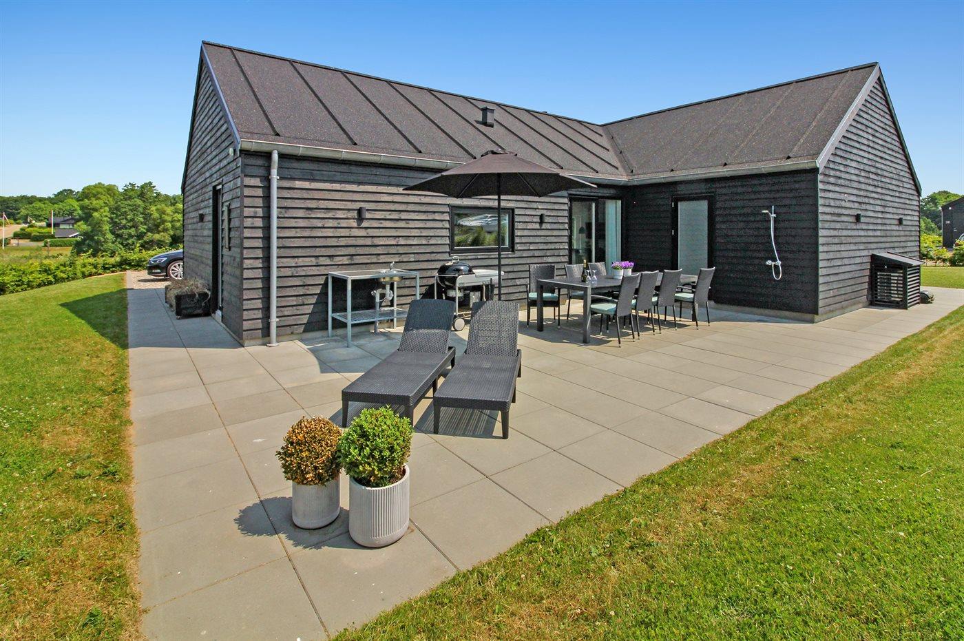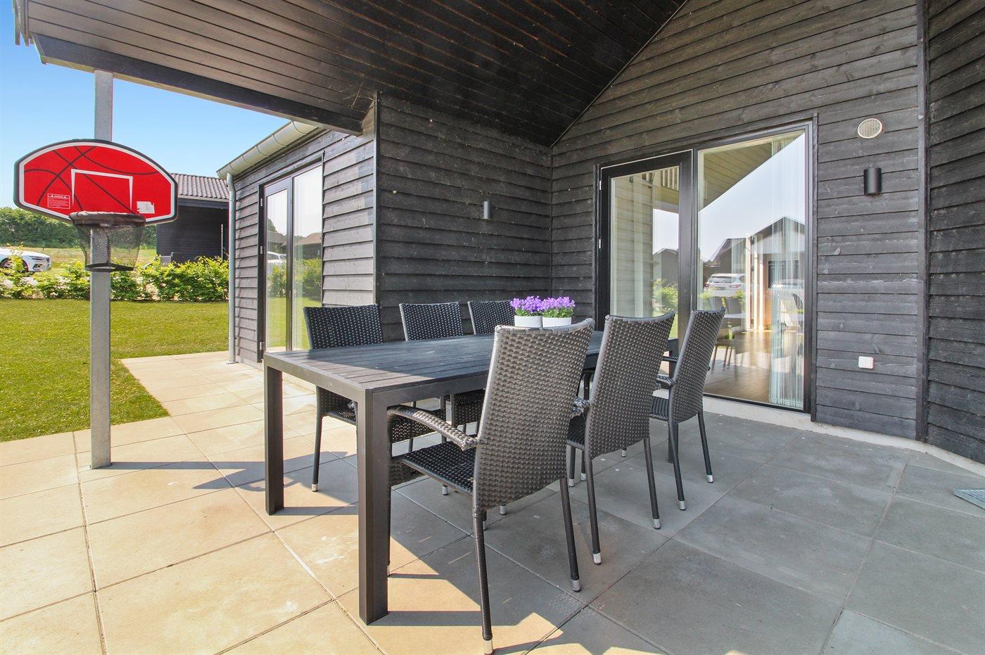 Ferieboligen er beliggende på en 833 m² stor havegrund. Der er 200 m til havet. Nærmeste forretning er beliggende i en afstand af 9000 m. Der er en golfbane i en afstand af 12000 m. Til ferieboligen hører 130 m² terrasseareal. Desuden er der 30 m² overdækket terrasse. Gynge. Sandkasse. Fodboldmål. Udendørs bruser. Der er mulighed for at tilberede maden udendørs i udekøkkenet. Grill til rådighed. Der er installeret stik til opladning af elbil. Type 2 stik. Med 11 kW ladeeffekt. Parkering ved ferieboligen.