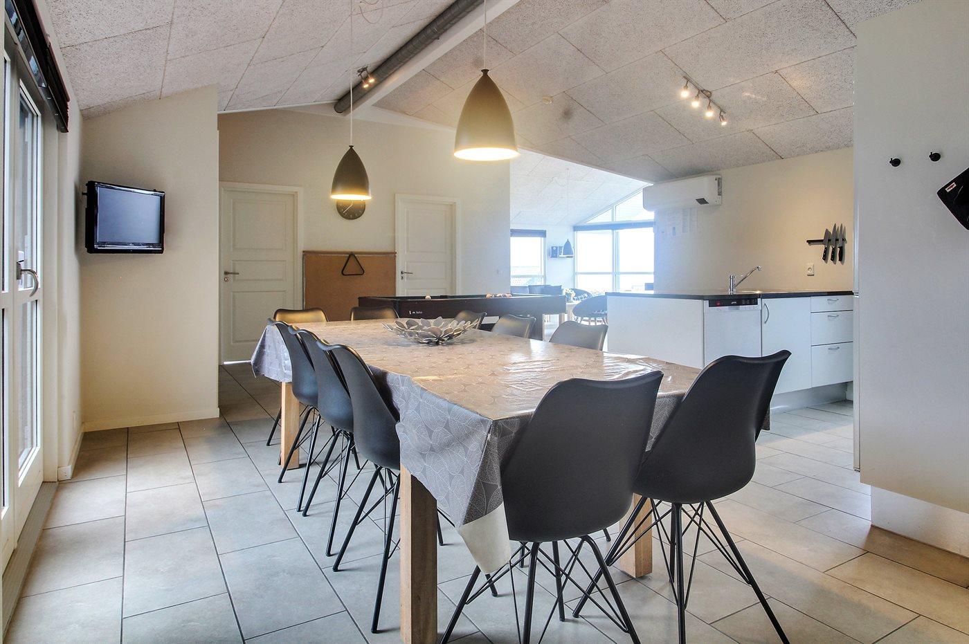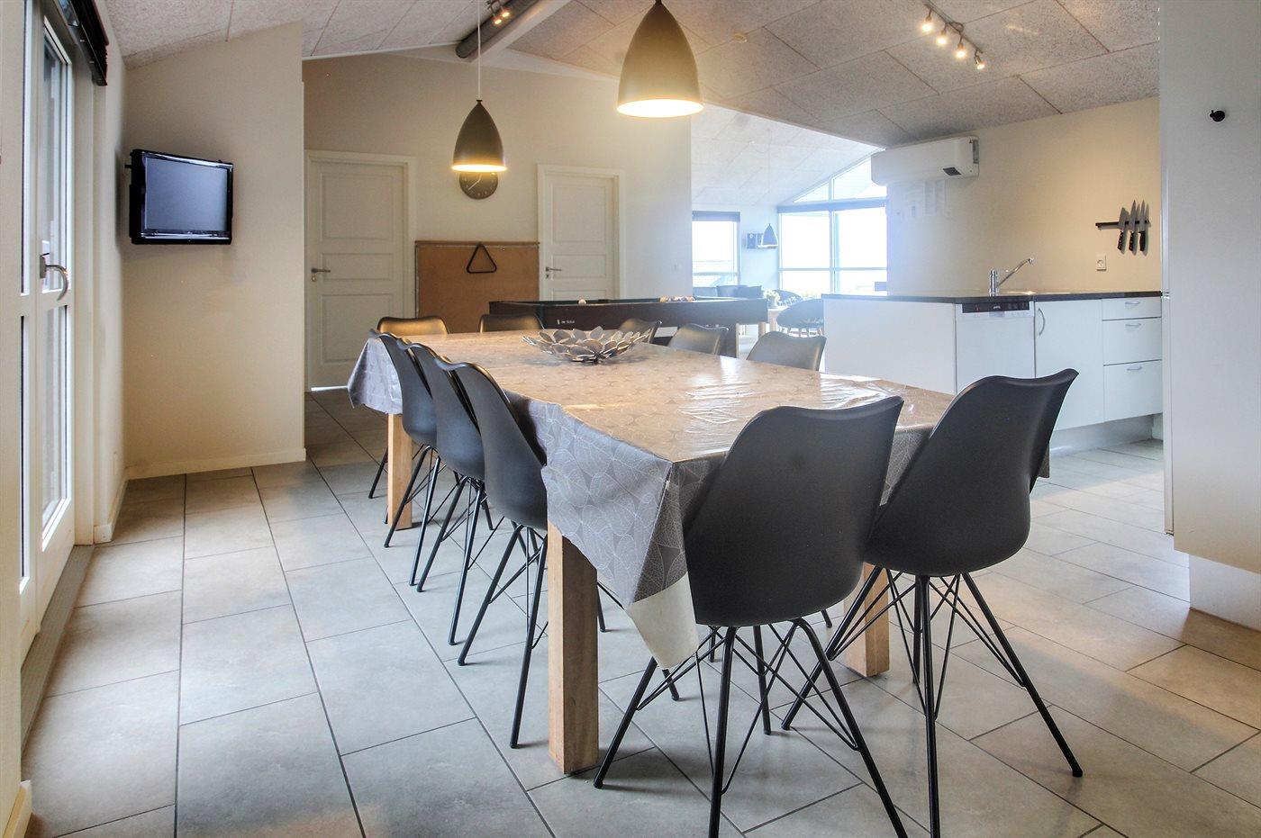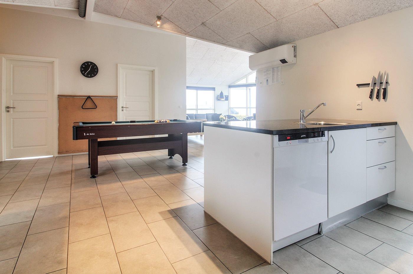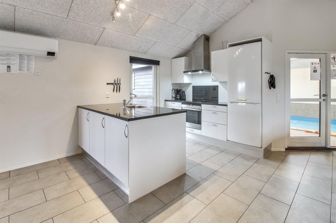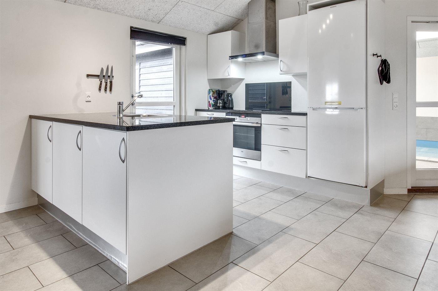 Køkkenet er udstyret med 1 køleskab. Der er 4 keramiske kogeplader, varmluftovn, mikrobølgeovn samt opvaskemaskine.