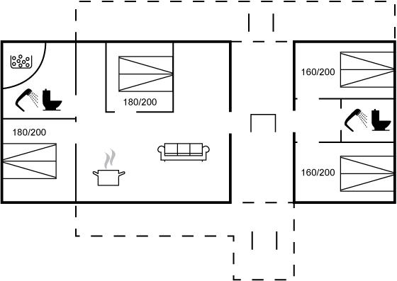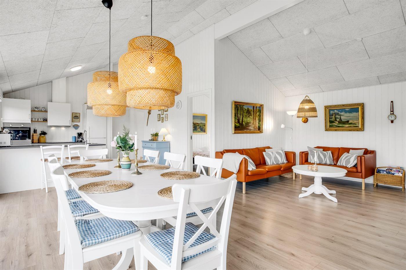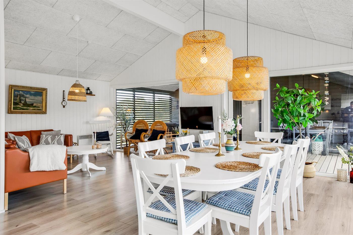 Dette spændende sommerhus er opført i to sektioner, hvilket gør det særligt velegnet til eksempel to familier, der ønsker at holde ferie sammen, men stadig have mulighed for lidt privatliv. Huset rummer et stort og hyggeligt køkken-alrum, hvor der er plads til fælles madlavning og samvær. Mellem de to sektioner finder I et stort overdækket areal, som fungerer som et ekstra samlingspunkt, og som virkelig forlænger udelivet – uanset vejret.