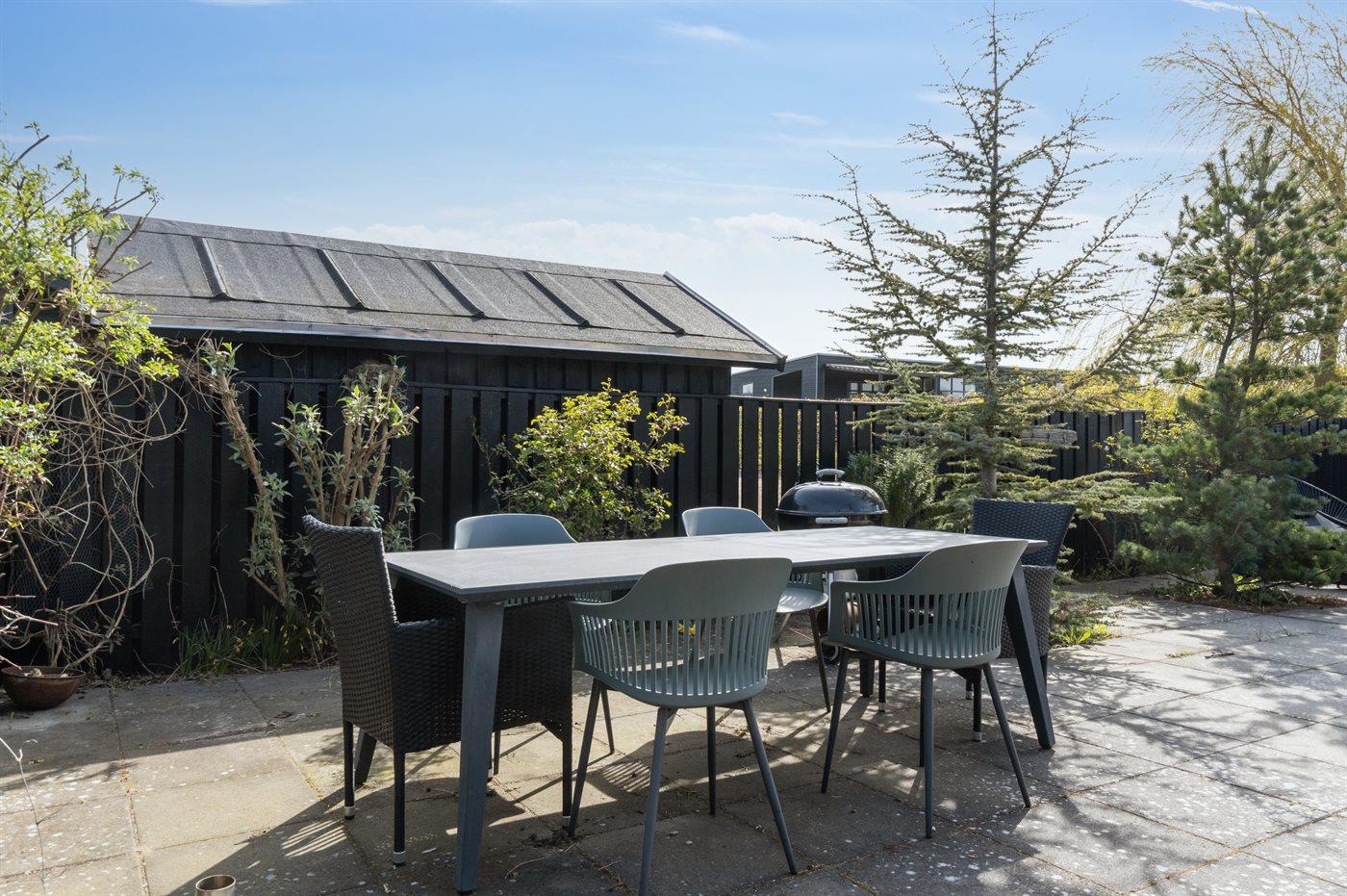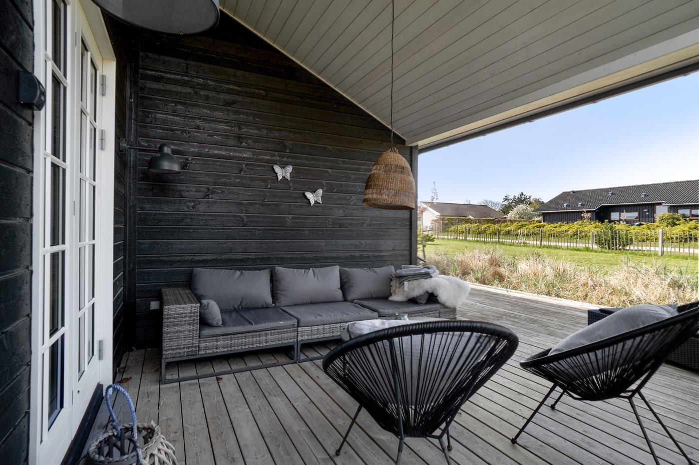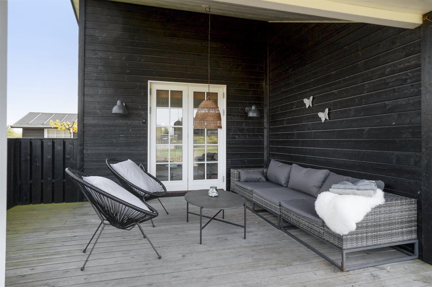 Rundt om huset findes der store terrassearealer med rig mulighed for at finde sol, skygge og læ uanset tidspunktet på dagen. En del af terrasseområdet, som ligger mod vest, er overdækket og mod øst er der et stort, lukket og ugenert terrasseområde.