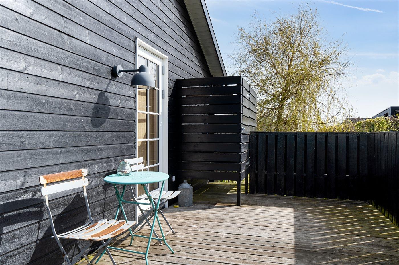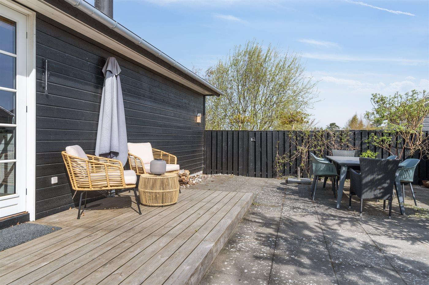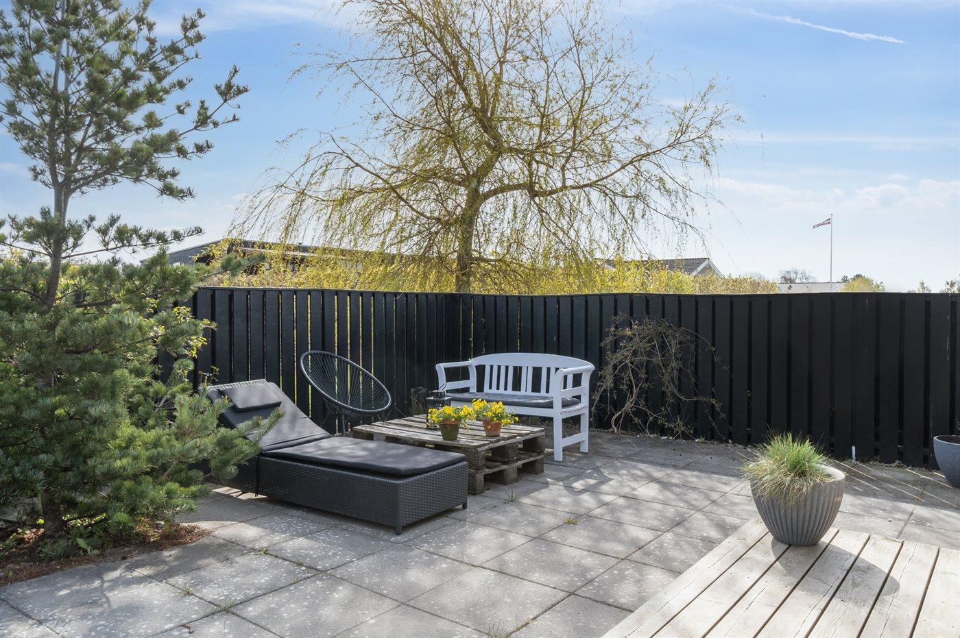 Rundt om huset findes der store terrassearealer med rig mulighed for at finde sol, skygge og læ uanset tidspunktet på dagen. En del af terrasseområdet, som ligger mod vest, er overdækket og mod øst er der et stort, lukket og ugenert terrasseområde.