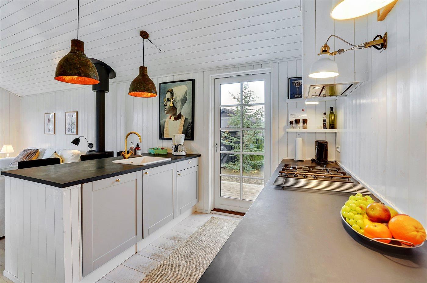 Køkkenet er udstyret med 1 køleskab. Der er 4 gasblus, varmluftovn samt opvaskemaskine.