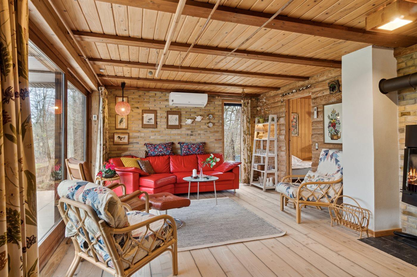 Huset opvarmes energivenligt med varmepumpe og der brændeovn til rådighed.