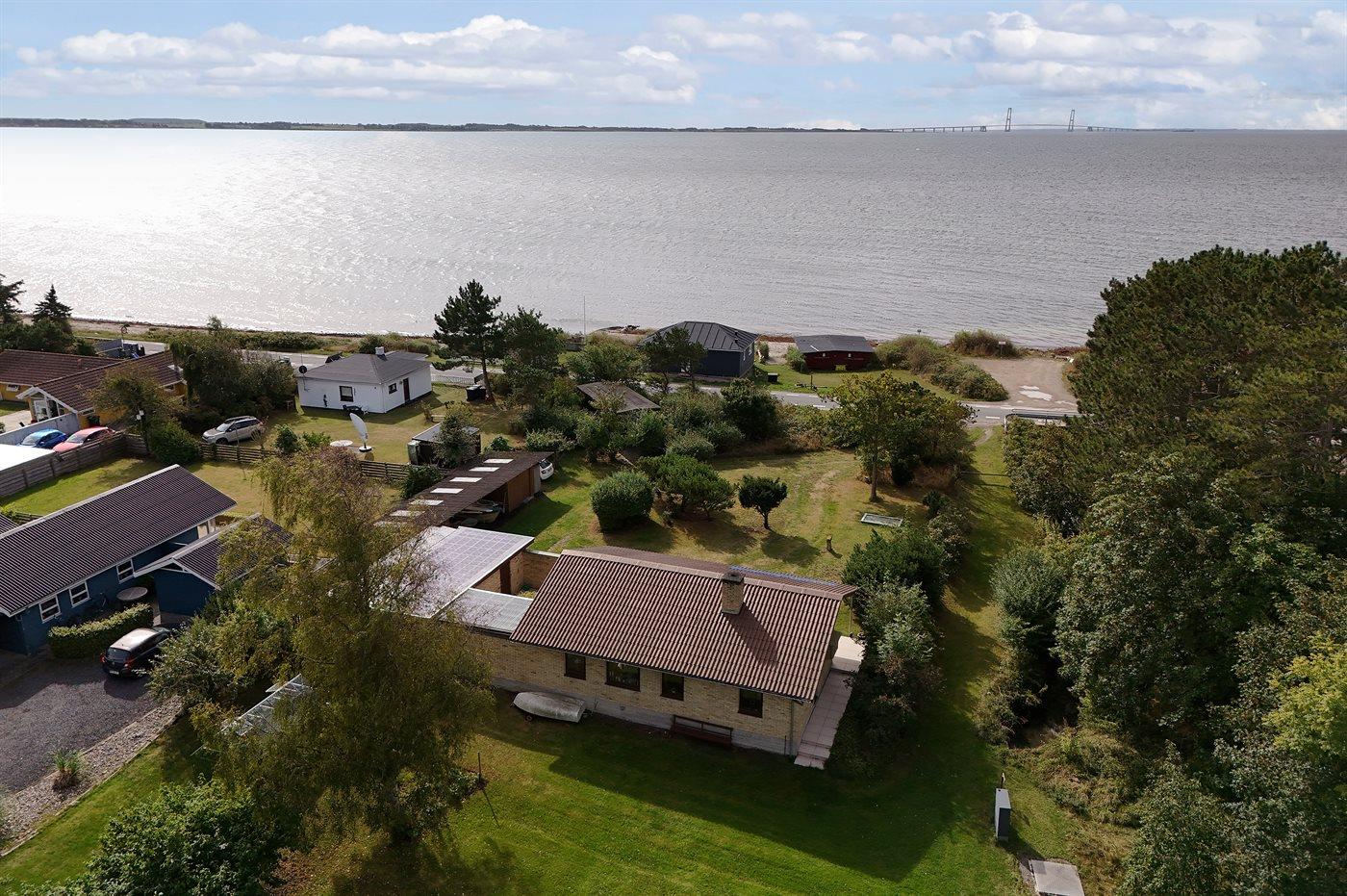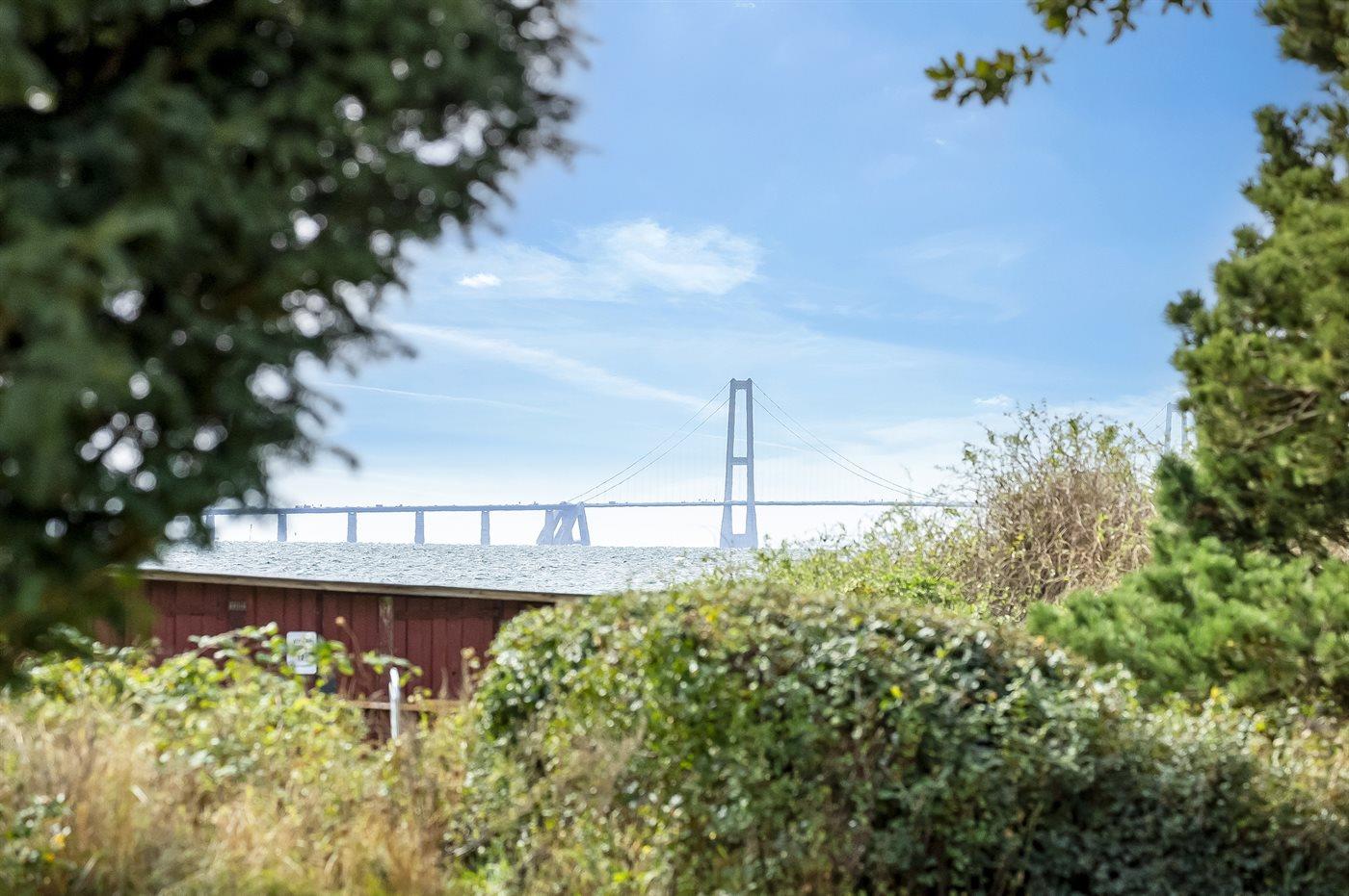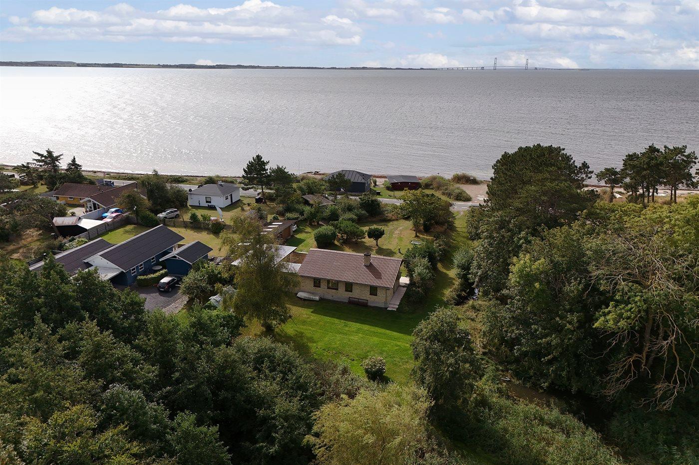 Dette hyggelige sommerhus ligger meget nær stranden med en storslået udsigt til havet og Storebæltsbroen. Huset er beliggende på en 4.599 kvadratmeter stor grund, hvoraf en større del er naturområde med eng og åløb.