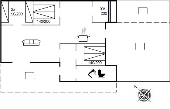 Huset egner sig til 7 gæster plus 1 barn på 0-3 år. Huset indeholder et dejligt køkkenalrum i forbindelse med stuen, hvor det store vinduesparti giver frit udsyn til havet. Husets sovepladser fordeler sig på 4 værelser med hver 2 sovepladser; 2 med dobbeltseng, 1 med 2 enkeltsenge og 1 med køjeseng. Badeværelset er med bruseniche. Der findes desuden opvaskemasine og vaskemaskine.